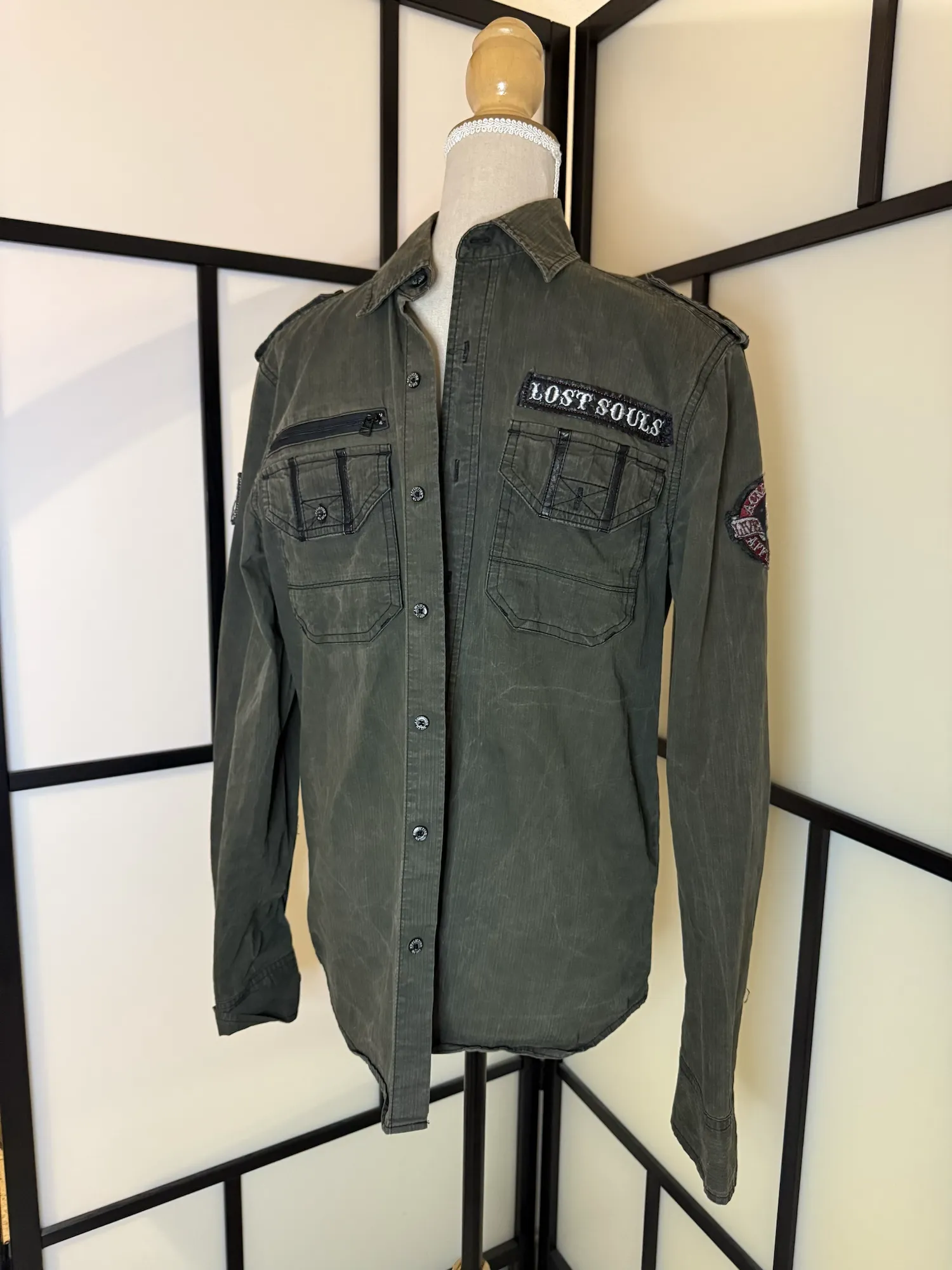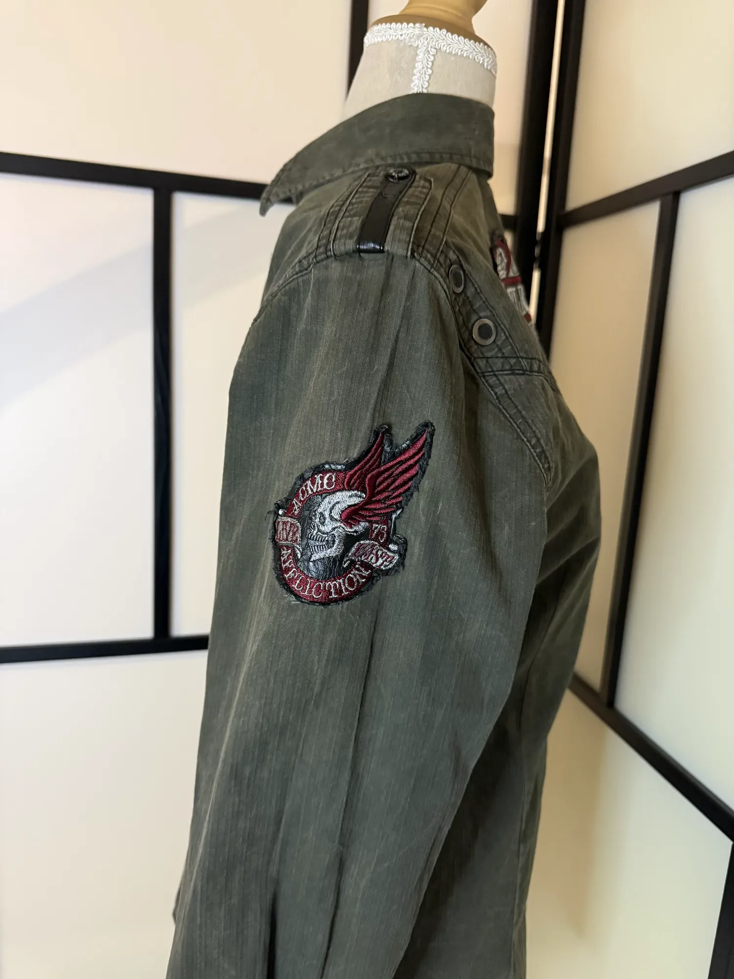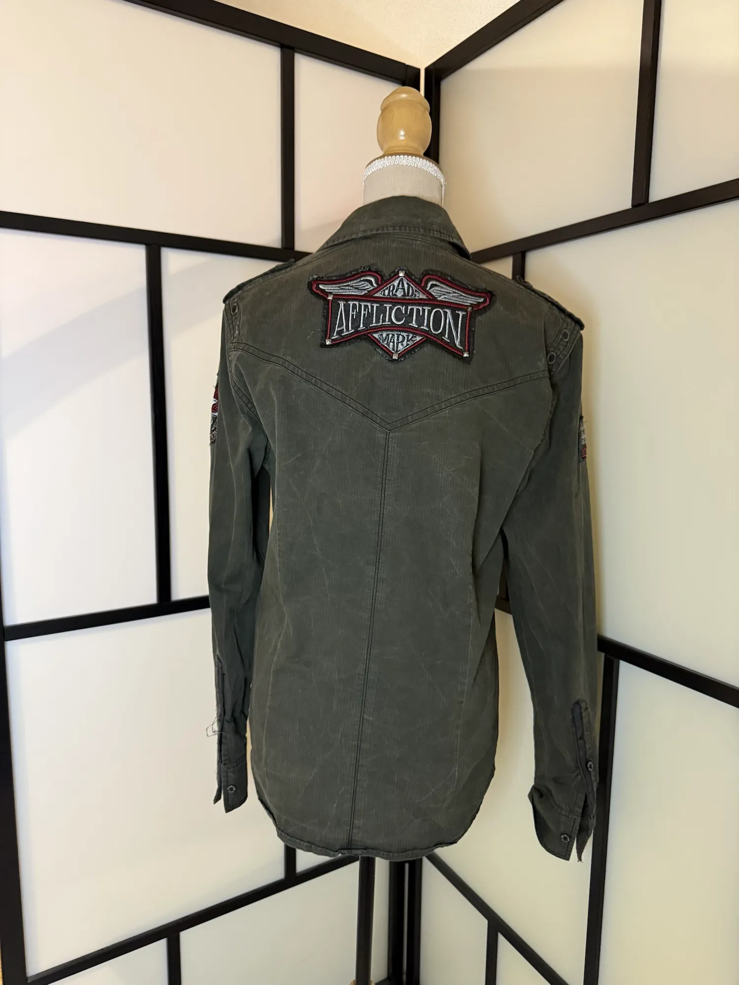 Slim fit in a washed olive green tone with a rugged, slightly distressed finish for an authentic vintage look. Features button closure, two chest pockets (one with zipper detail), shoulder epaulettes, and bold embroidered patches on the chest, sleeves, and back. The large Affliction logo embroidery on the back adds a strong signature touch.