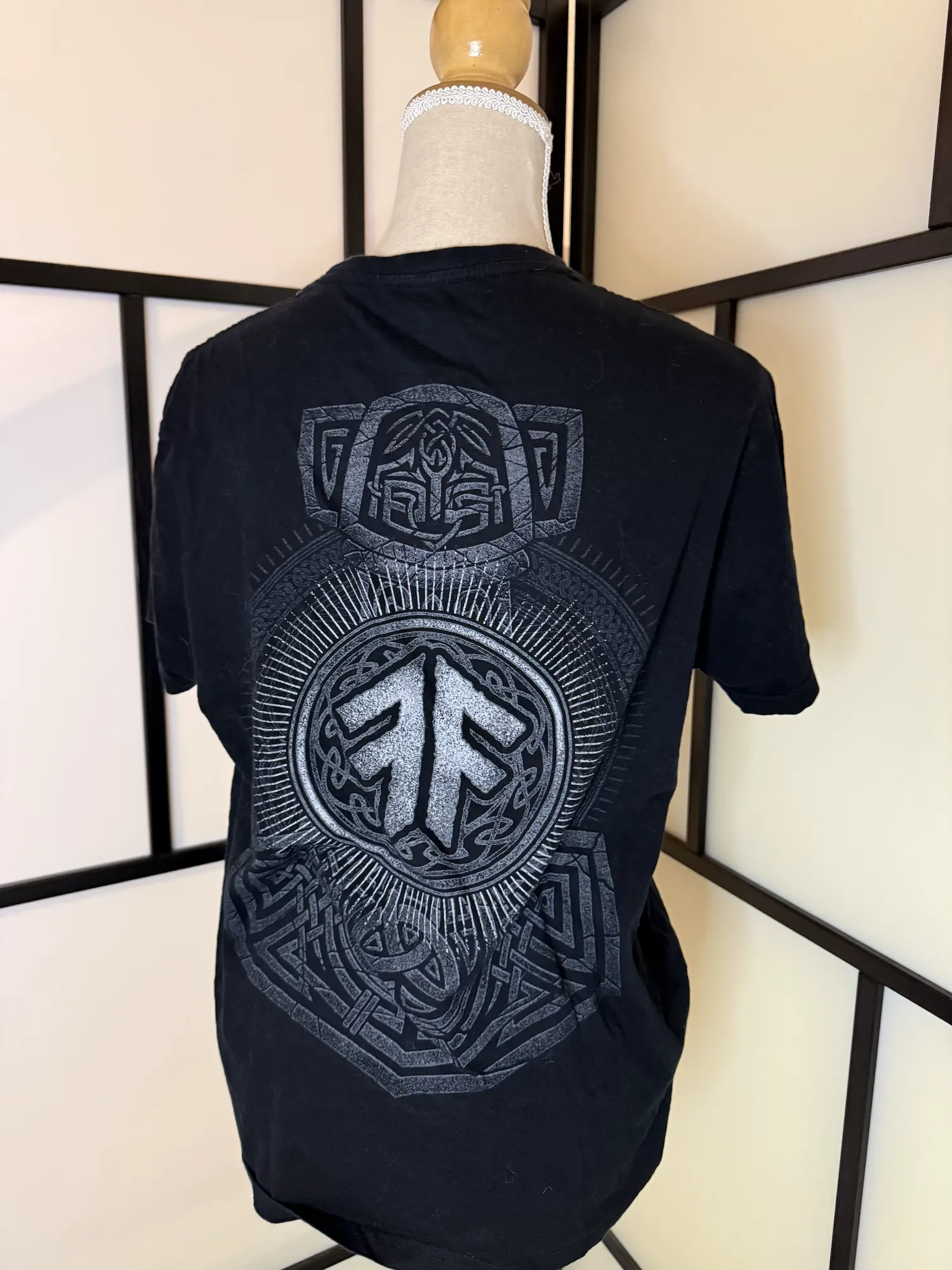 Official Amon Amarth merch T-shirt in black featuring a bold Viking warrior graphic on the front and an intricate Norse-inspired symbol design on the back. A true statement piece for metal fans.