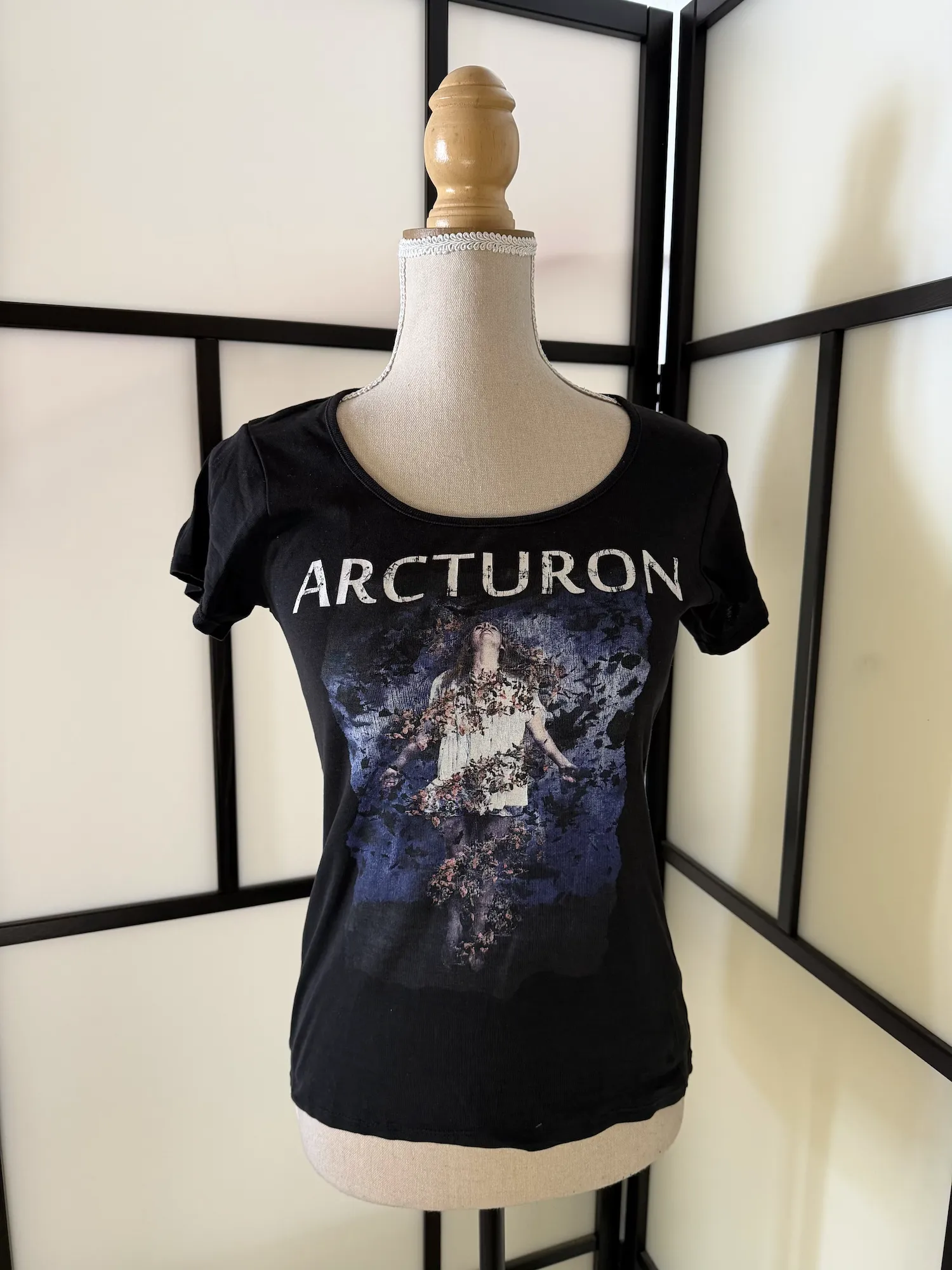 Black Arcturon graphic T-shirt featuring a moody and atmospheric artwork of a figure dissolving into particles, set against a textured dark background. A subtle yet powerful design with a melancholic and alternative vibe.