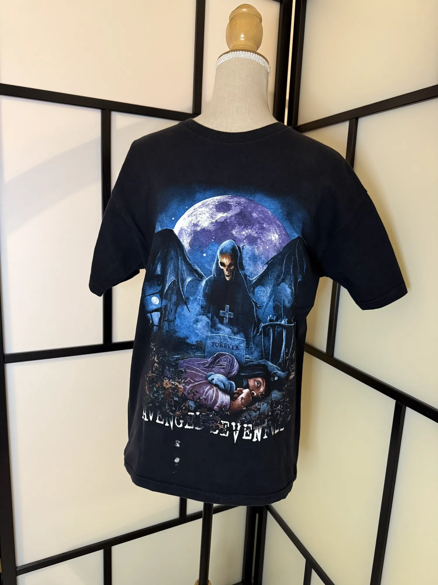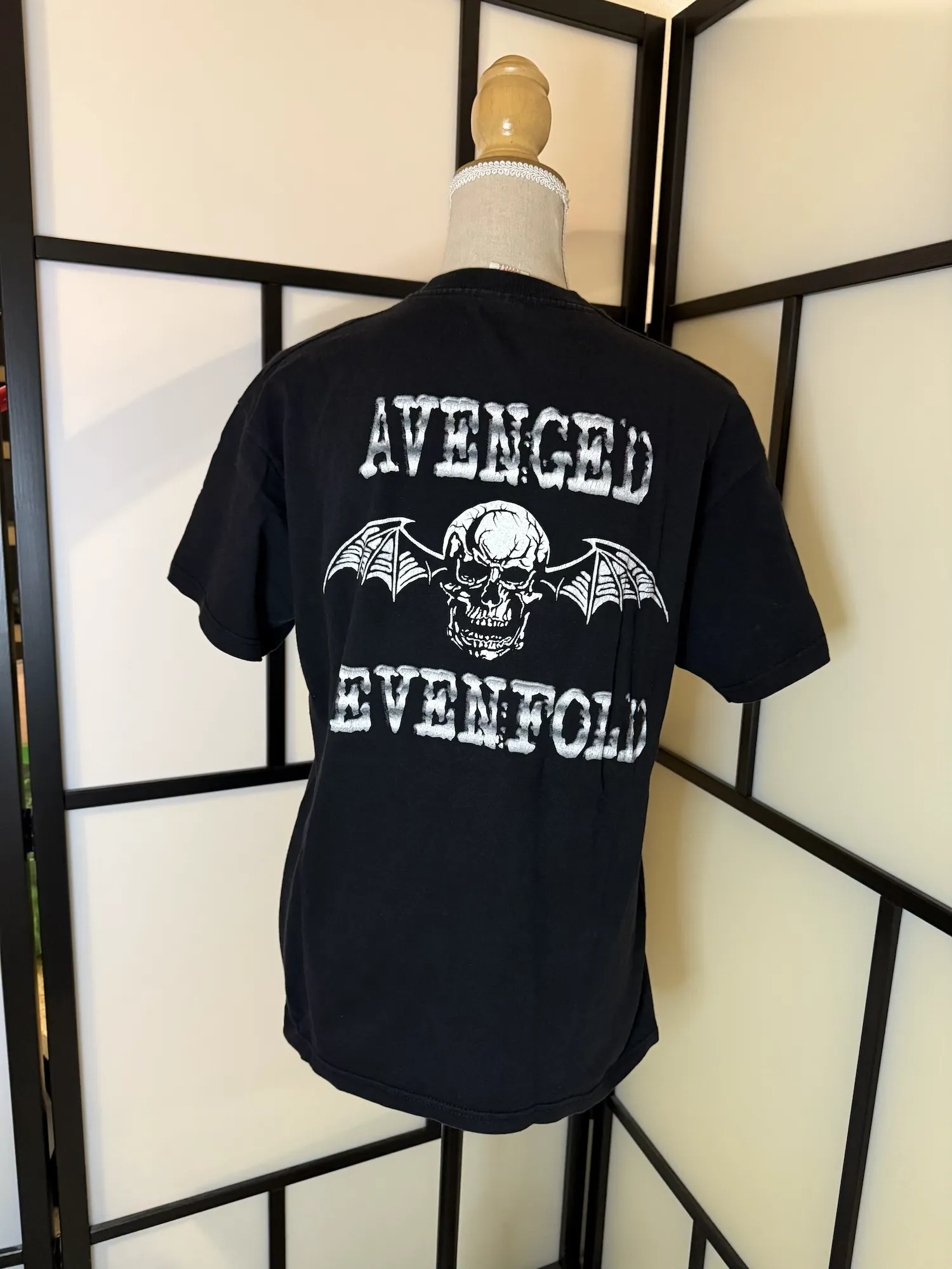 On the back, bold “Avenged Sevenfold” lettering with the iconic skull and bat wings graphic adds an unmistakable band look. High-contrast white print on black base for that classic heavy metal vibe.