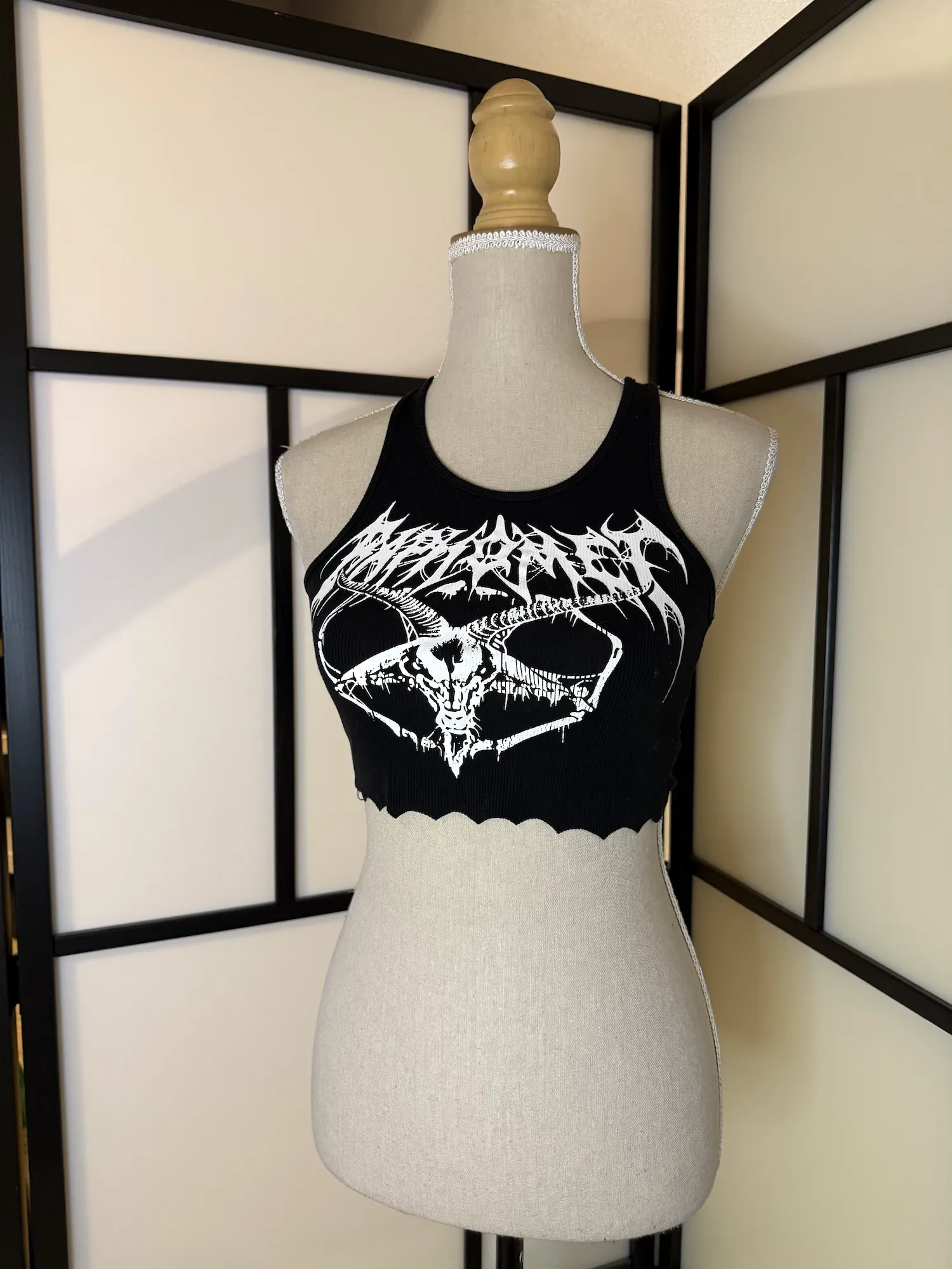 Black cropped tank top featuring a bold white Baphomet-style graphic with metal-inspired lettering. A strong statement piece with edgy alternative / gothic vibes.