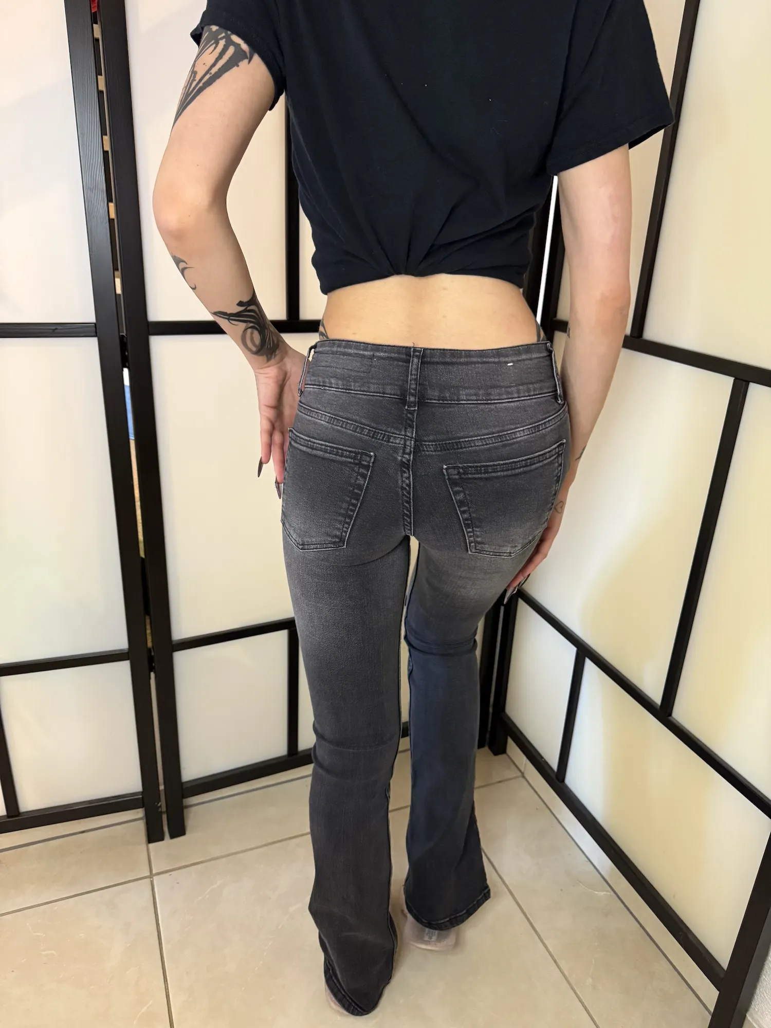 The subtle washed grey tone gives a slightly edgy, worn-in look, while the visible front seam detailing elongates the legs and adds a modern touch. The fitted shape creates a clean, streamlined finish — perfect for alternative styling or everyday wear.