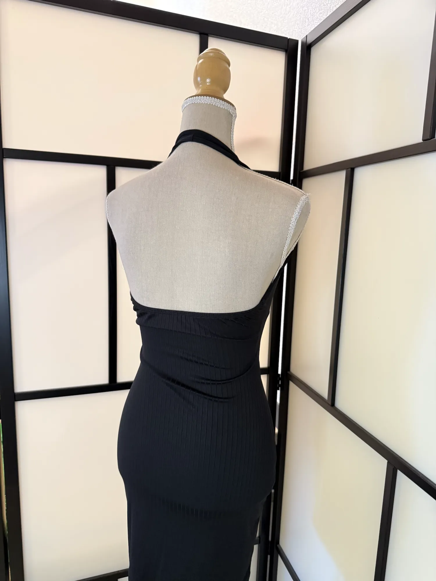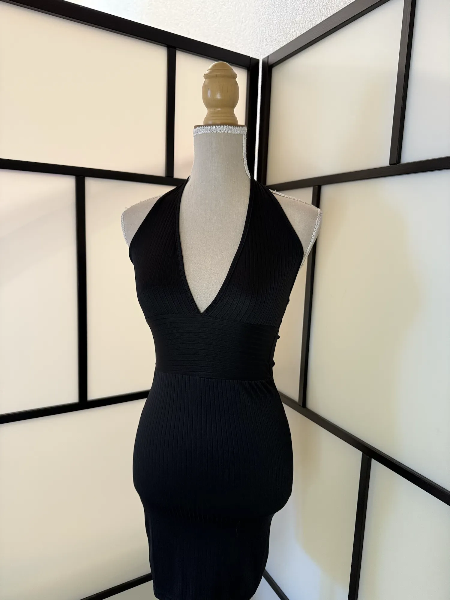Sleek black halter neck dress with a deep plunging V neckline and figure-hugging silhouette. The ribbed texture adds structure and enhances the shape beautifully, while the wide waistband detail cinches the waist for a flattering hourglass effect.