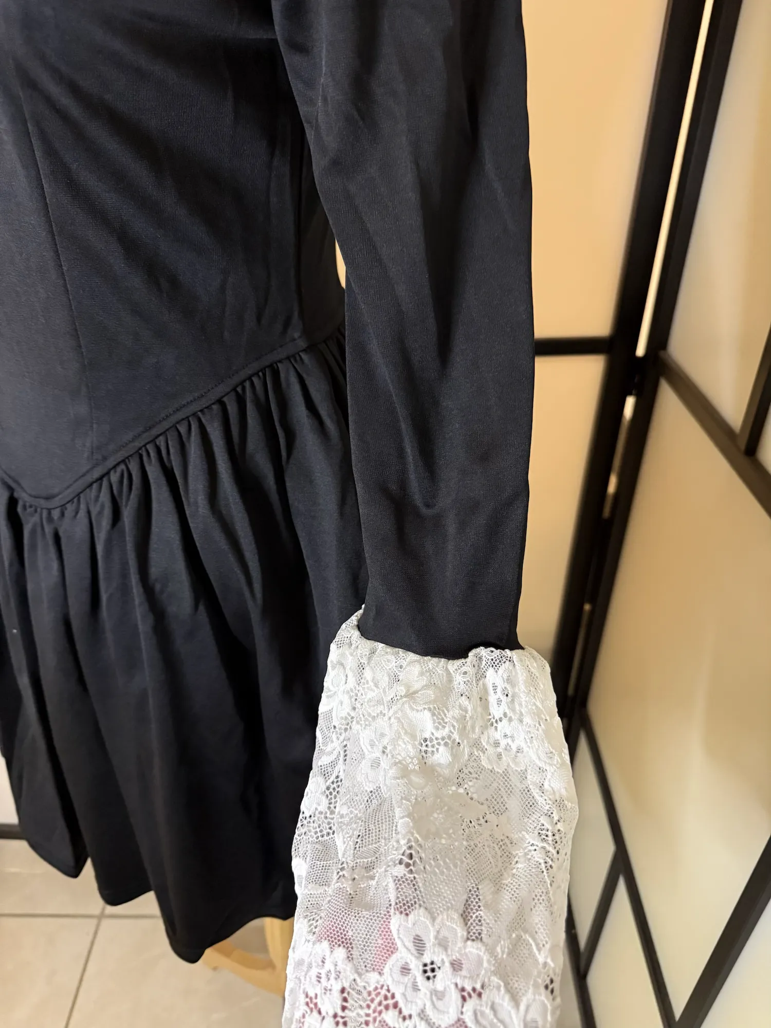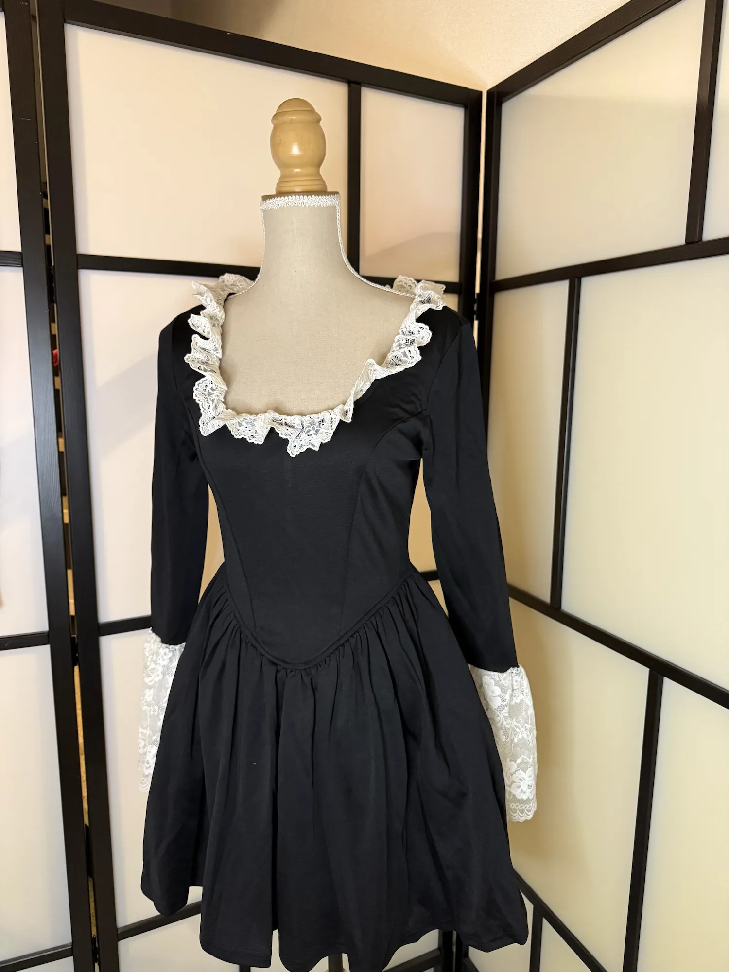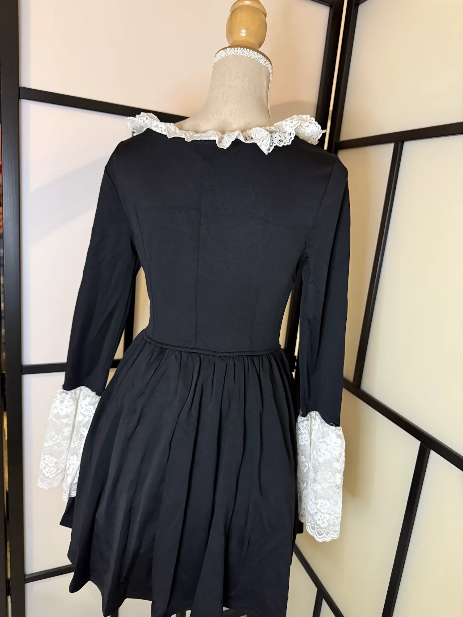 Elegant black long-sleeve dress featuring delicate white lace trim at the neckline and cuffs. The fitted bodice and flared skirt create a flattering, feminine silhouette with a subtle vintage-inspired touch.