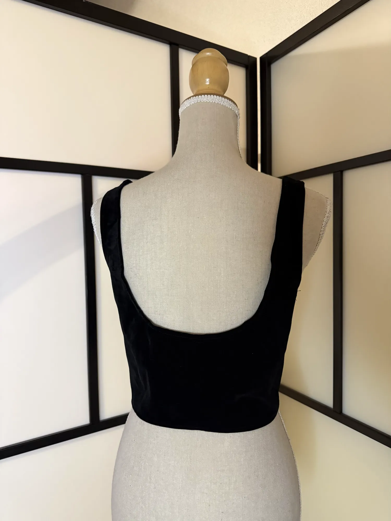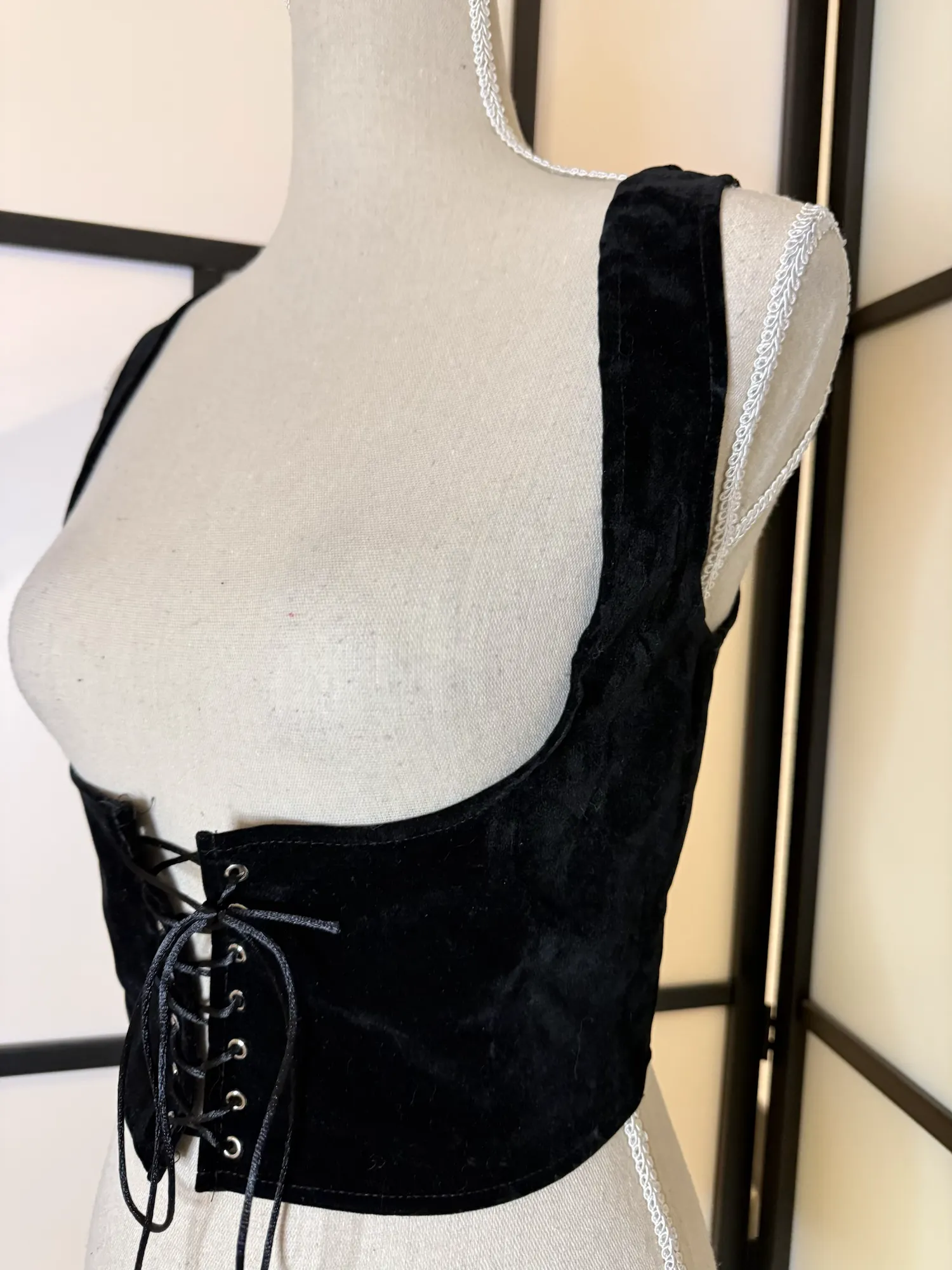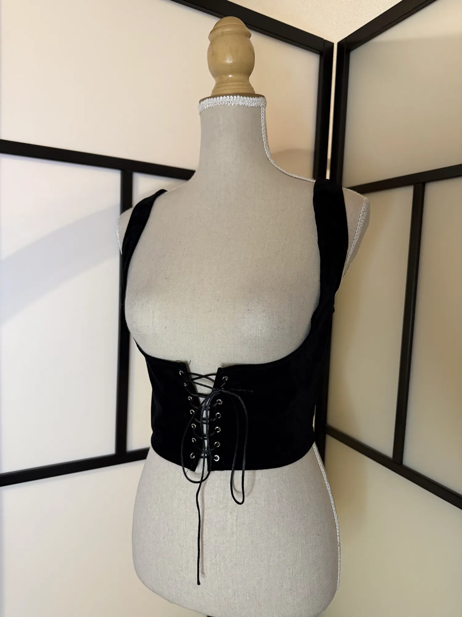 Features a bold lace-up front with metal eyelets for an adjustable fit and a structured silhouette that accentuates the waist. The wide straps and deep neckline create a flattering, dramatic shape — perfect for layering or wearing on its own.