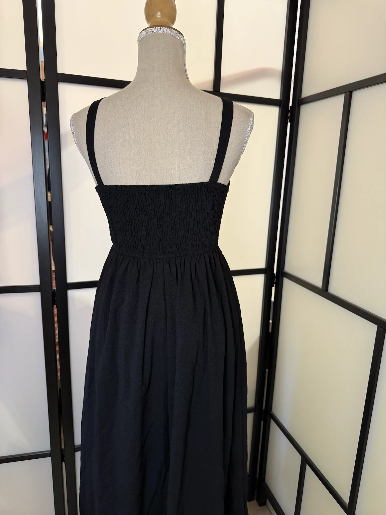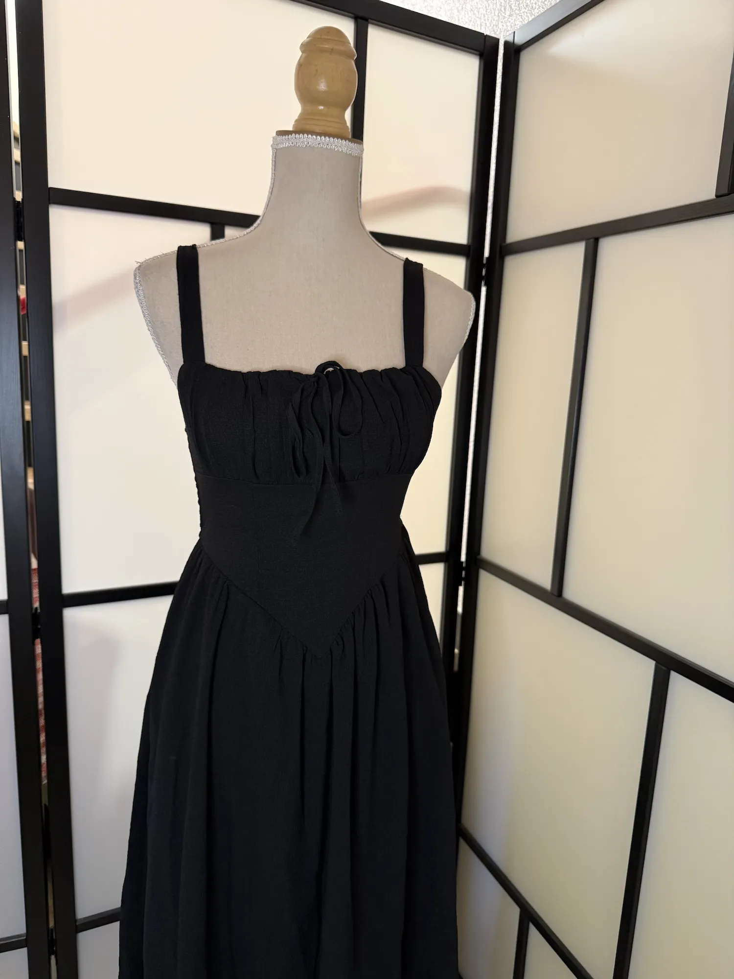 Elegant black midi dress with a softly gathered bust and delicate tie detail at the front. The structured waist panel creates a super flattering silhouette, while the flowy skirt adds movement and an effortless, feminine vibe.