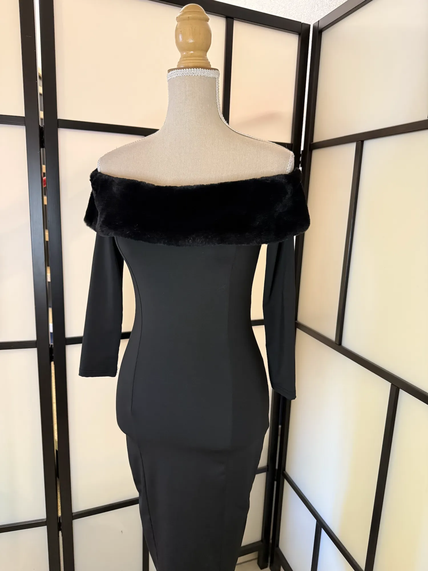 An elegant black bodycon midi dress featuring a dramatic off-shoulder neckline with soft faux fur trim. The fitted silhouette beautifully enhances the figure, while the 3/4 sleeves add balance and sophistication.