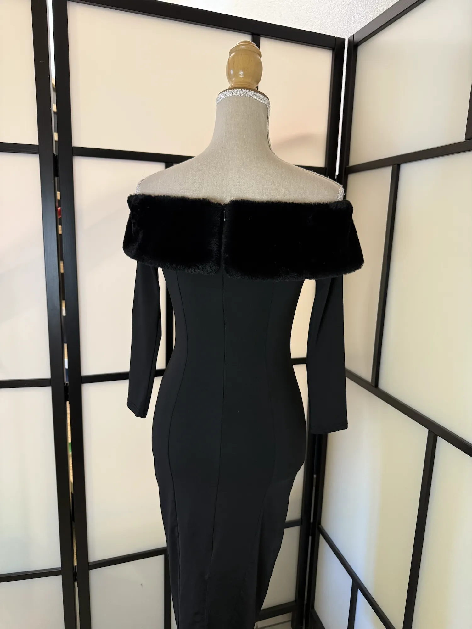 Be the first to review “Black Off-Shoulder Faux Fur Trim Dress – Size XS/S – Good Condition”