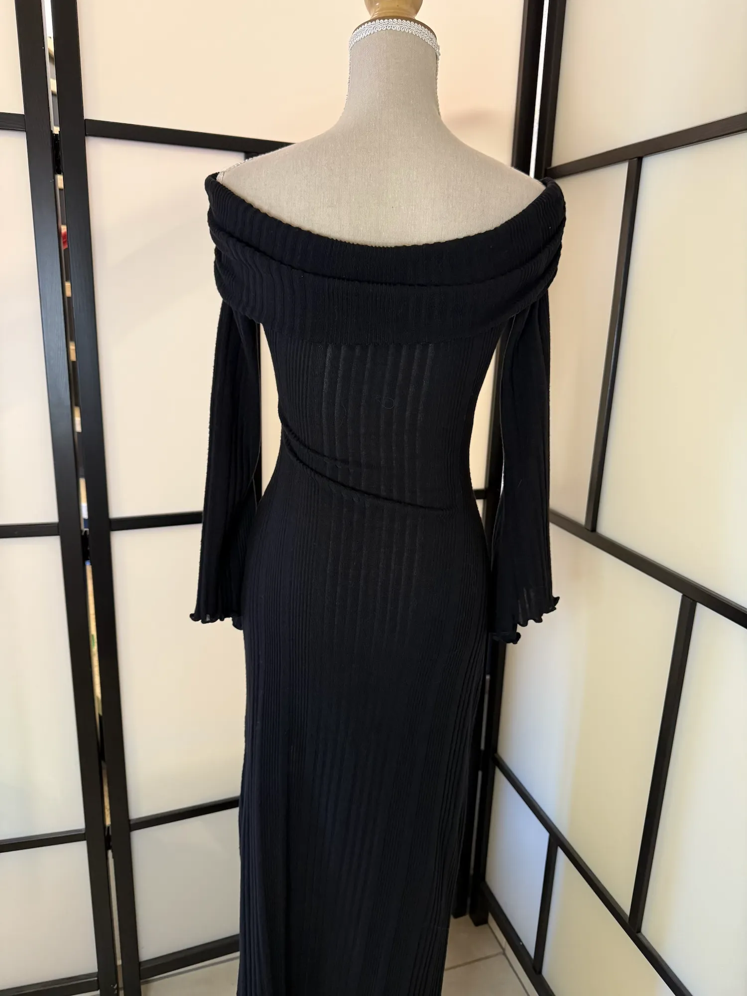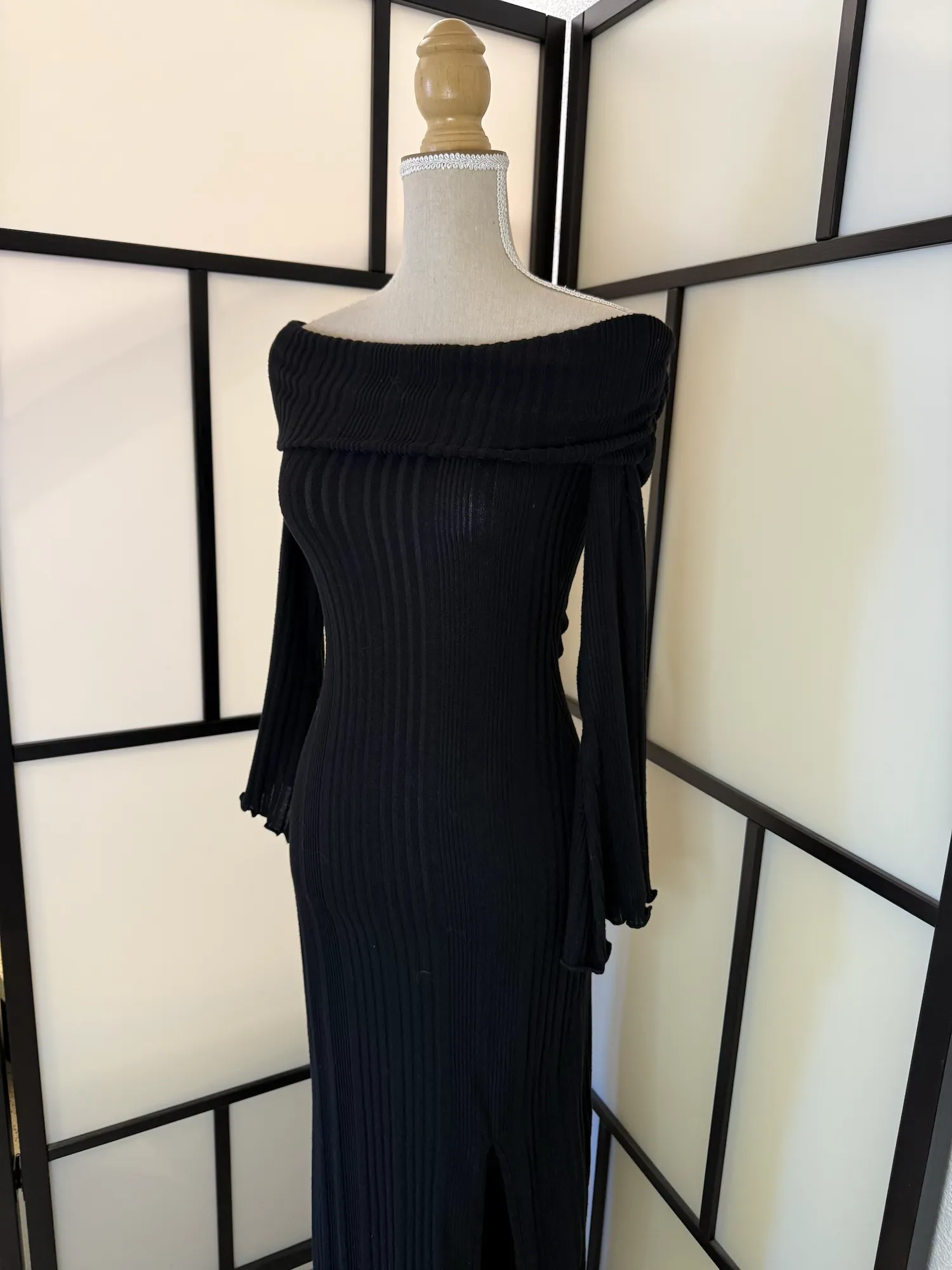 A sleek black ribbed knit dress featuring a flattering off-shoulder fold-over neckline. The fitted silhouette hugs the body beautifully, while the soft vertical ribbing enhances and elongates the shape.
