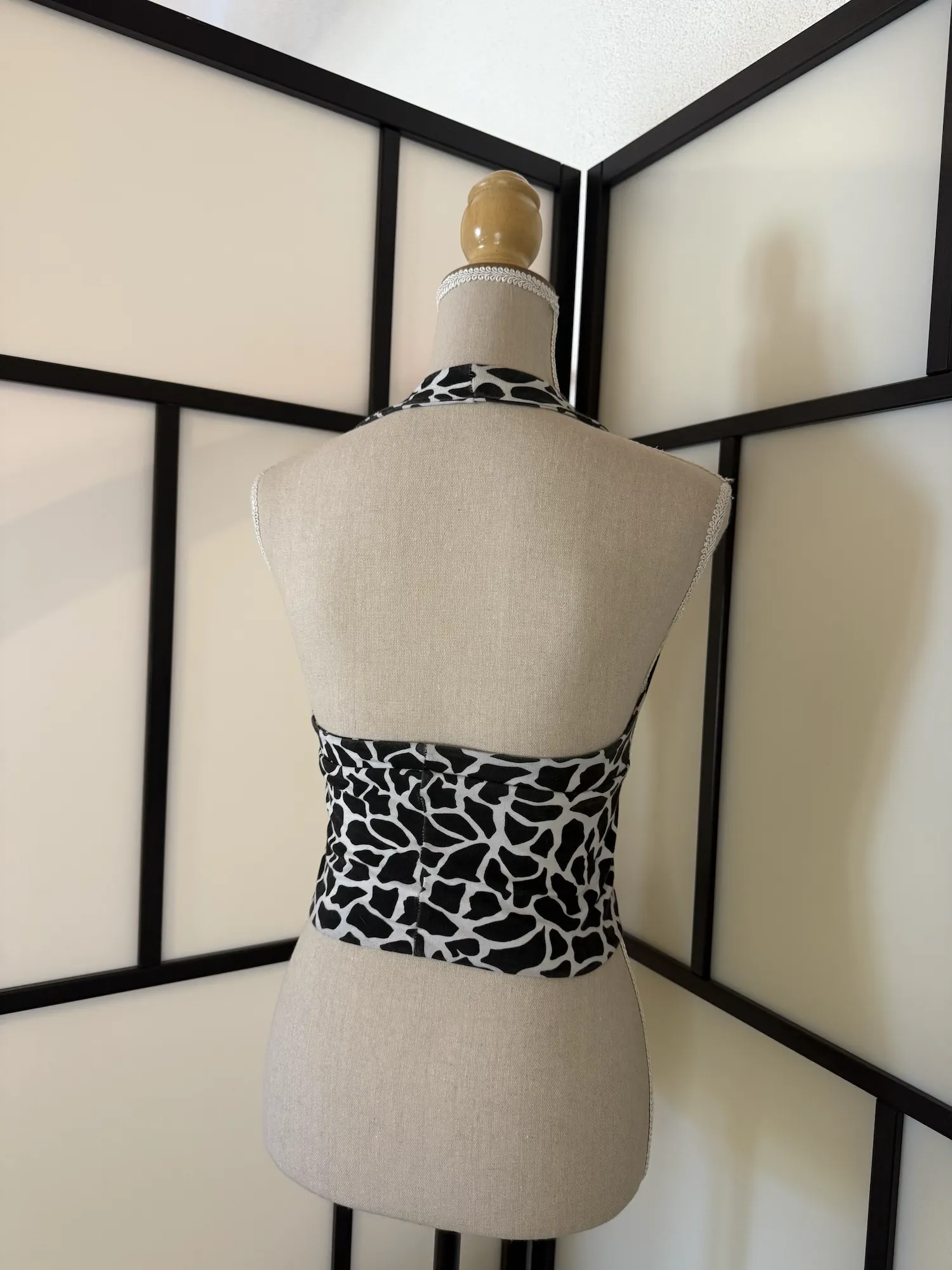 A bold black and white halter top featuring an eye-catching abstract animal-inspired print. The deep V-neckline and wrap-style front create a flattering, feminine silhouette, while the fitted waist enhances the shape.