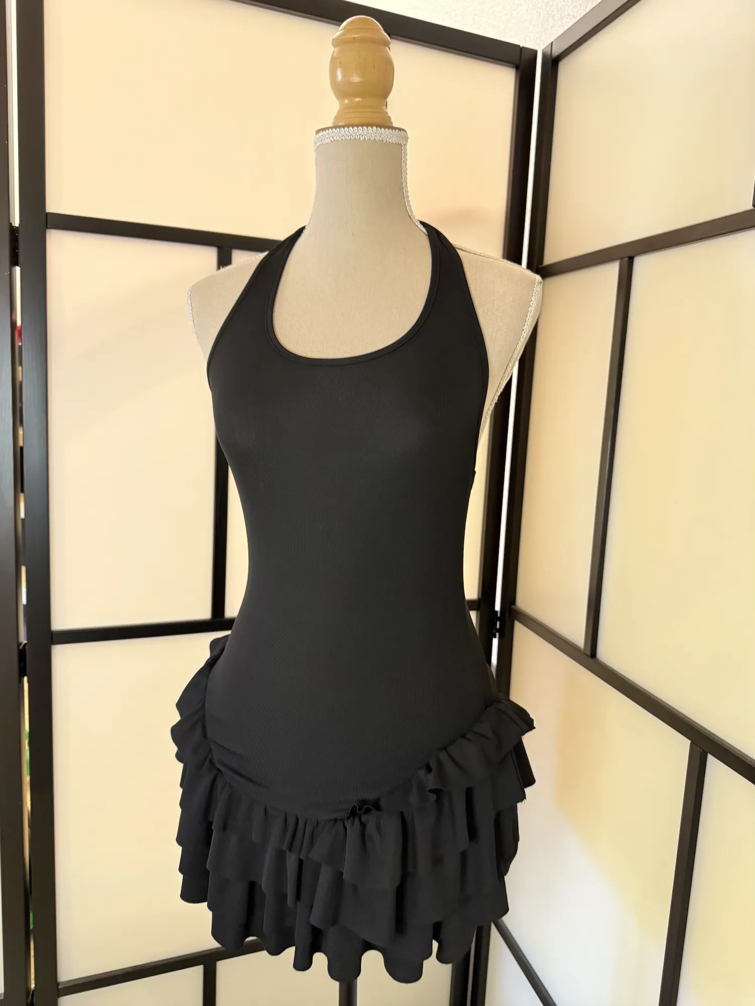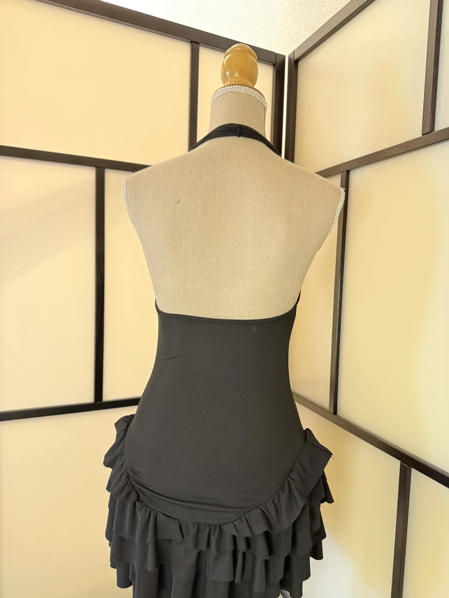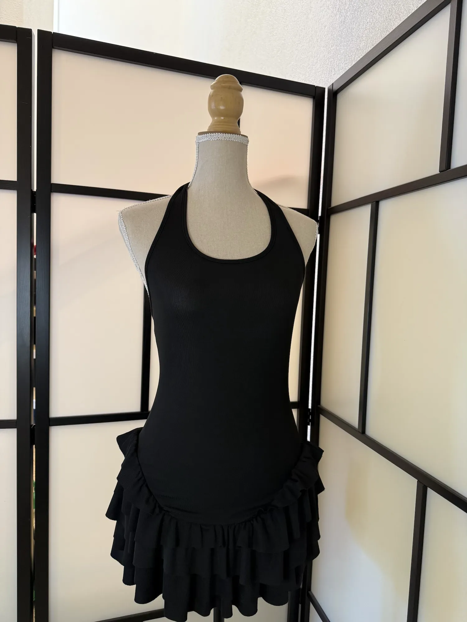A flattering black halter mini dress featuring a fitted silhouette and playful layered ruffle hem. The clean, minimal top contrasts beautifully with the soft, flowy skirt detail, creating a feminine yet slightly edgy look.