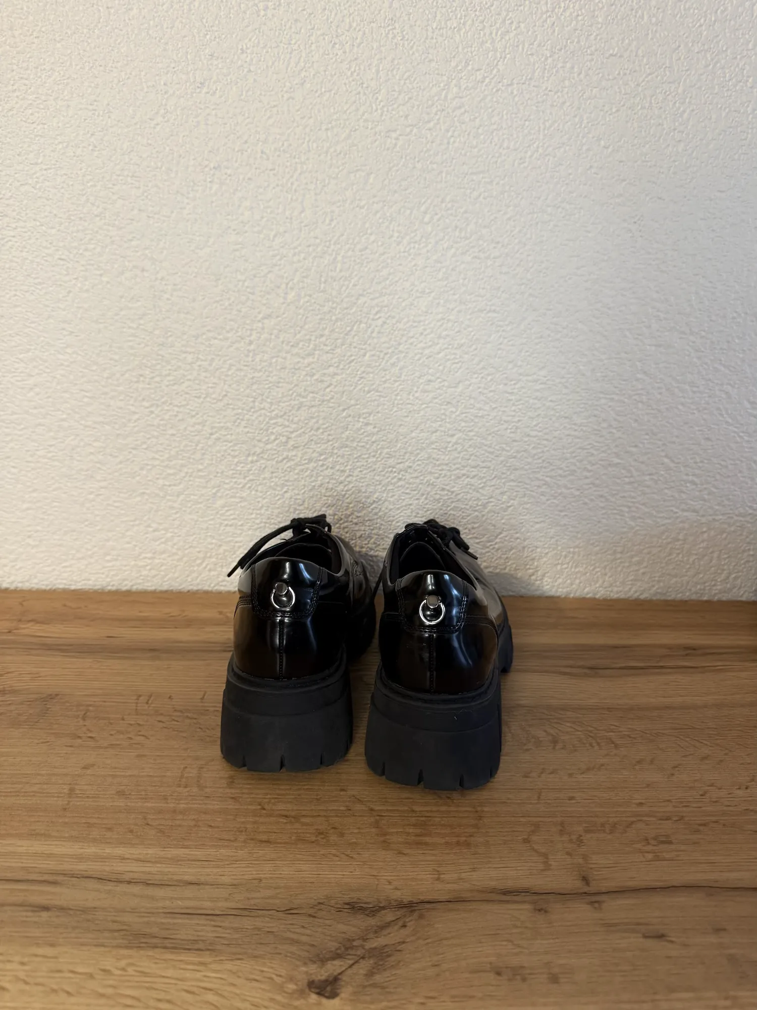 Crafted in glossy black finish with a rounded toe and classic lace-up front. The standout feature is the thick, treaded platform sole that adds height and an edgy, modern touch. Subtle metal ring detail at the heel gives them a cool statement vibe.