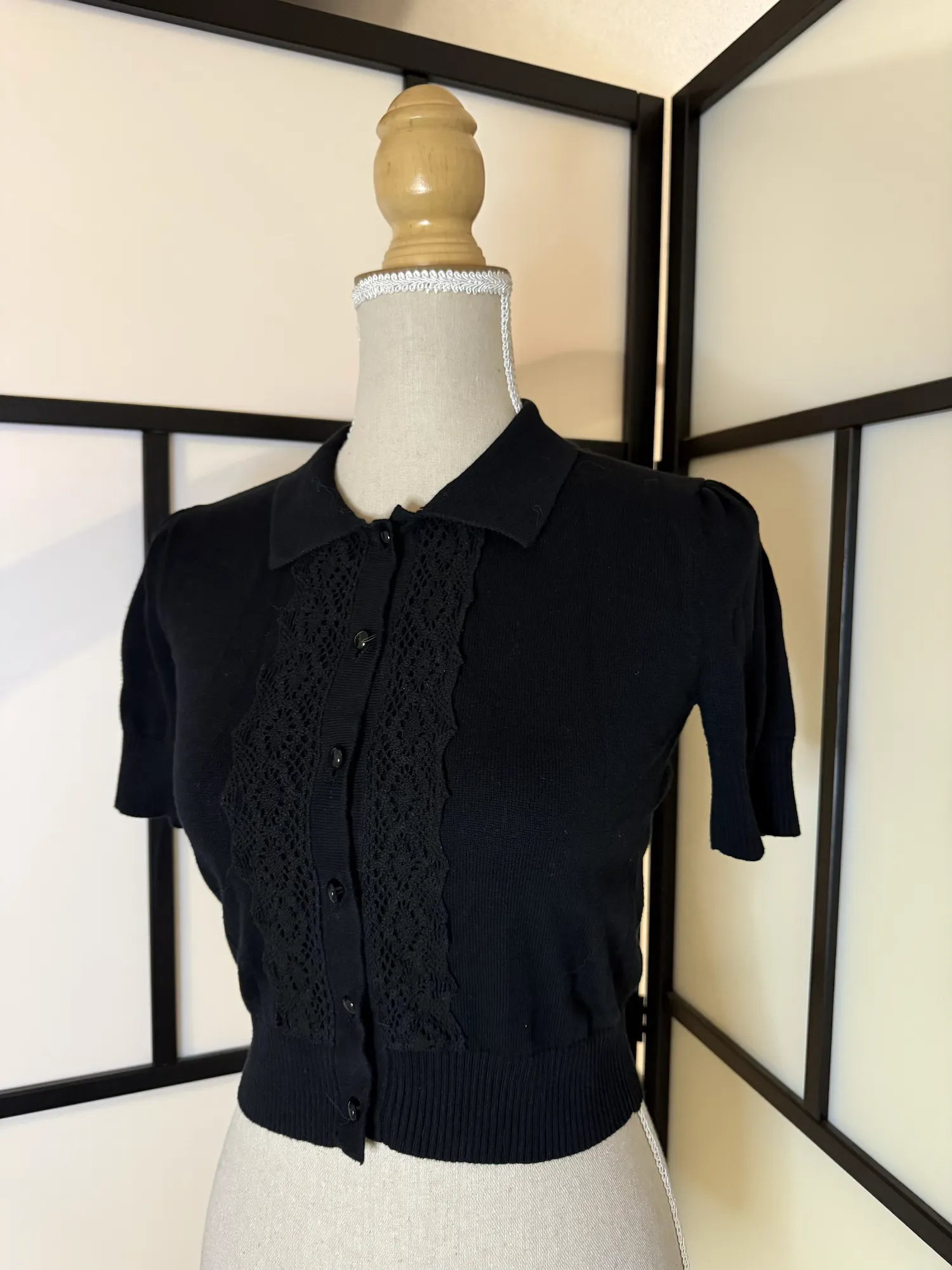 Designed with a structured collar, delicate lace panel detailing along the button placket, and a flattering fitted silhouette. The ribbed hem enhances the waist, giving it that timeless 50s-inspired shape.