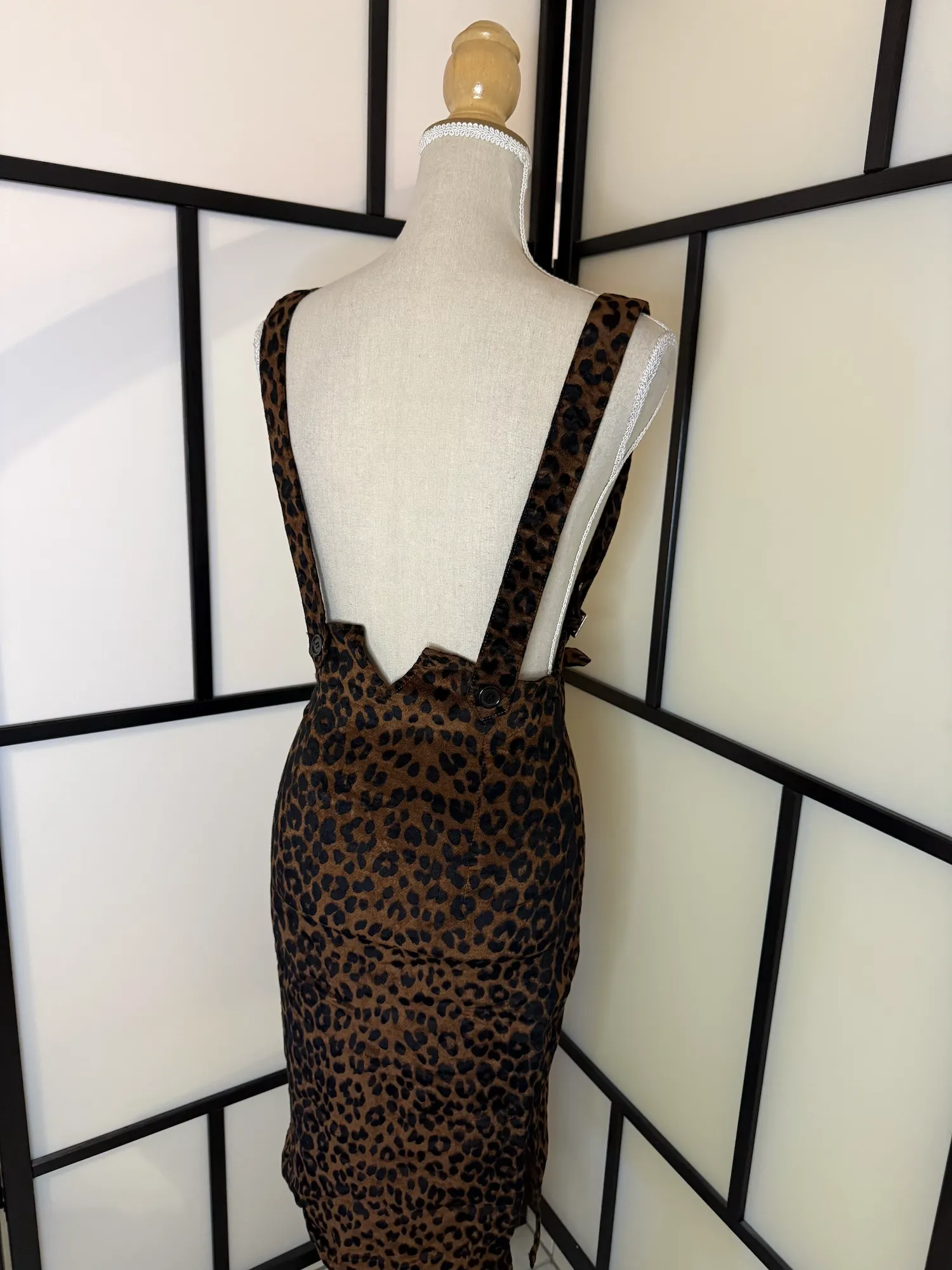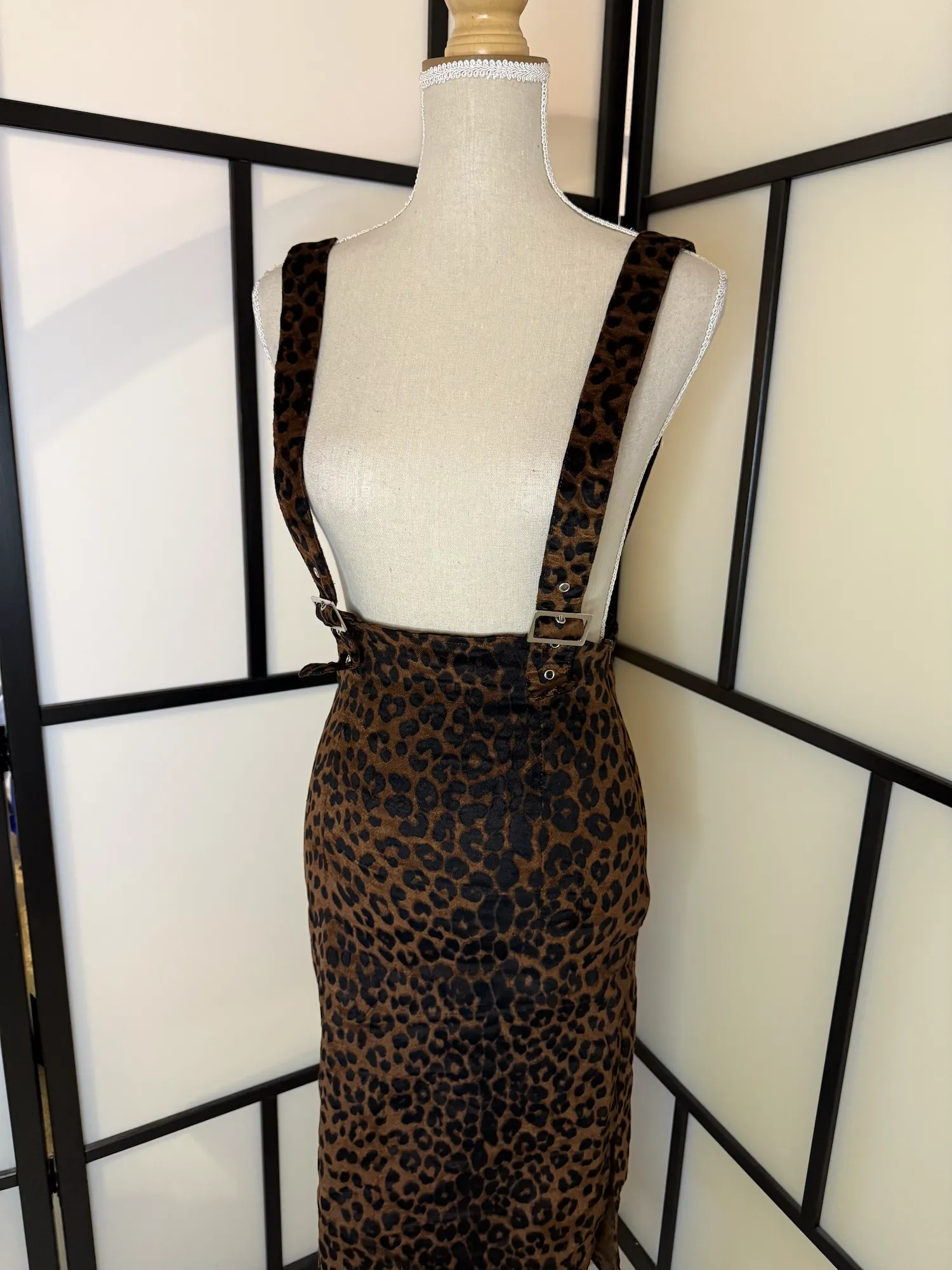 Details: Leopard print, high-waisted pencil cut, adjustable buckle straps, vintage-inspired silhouette