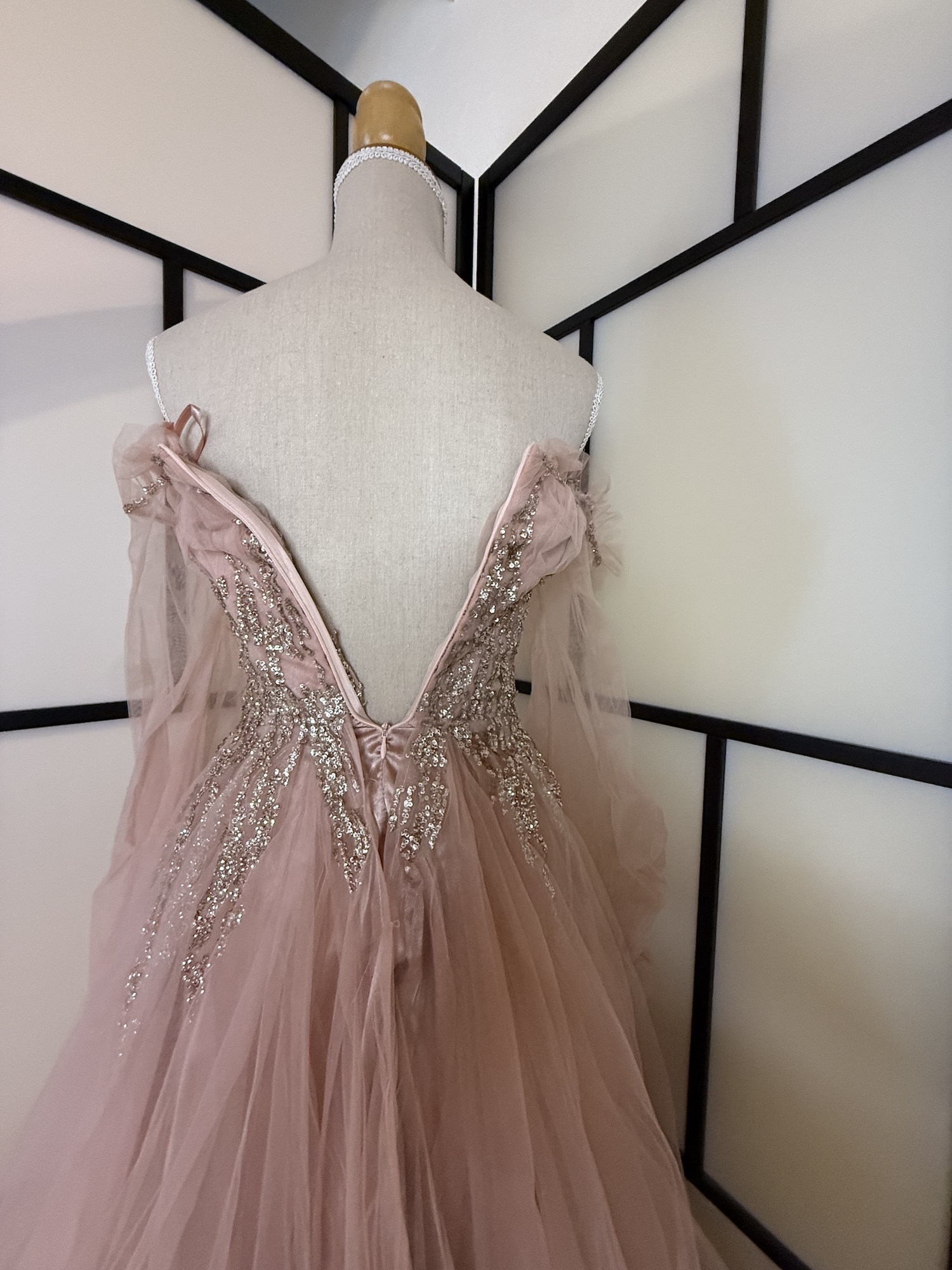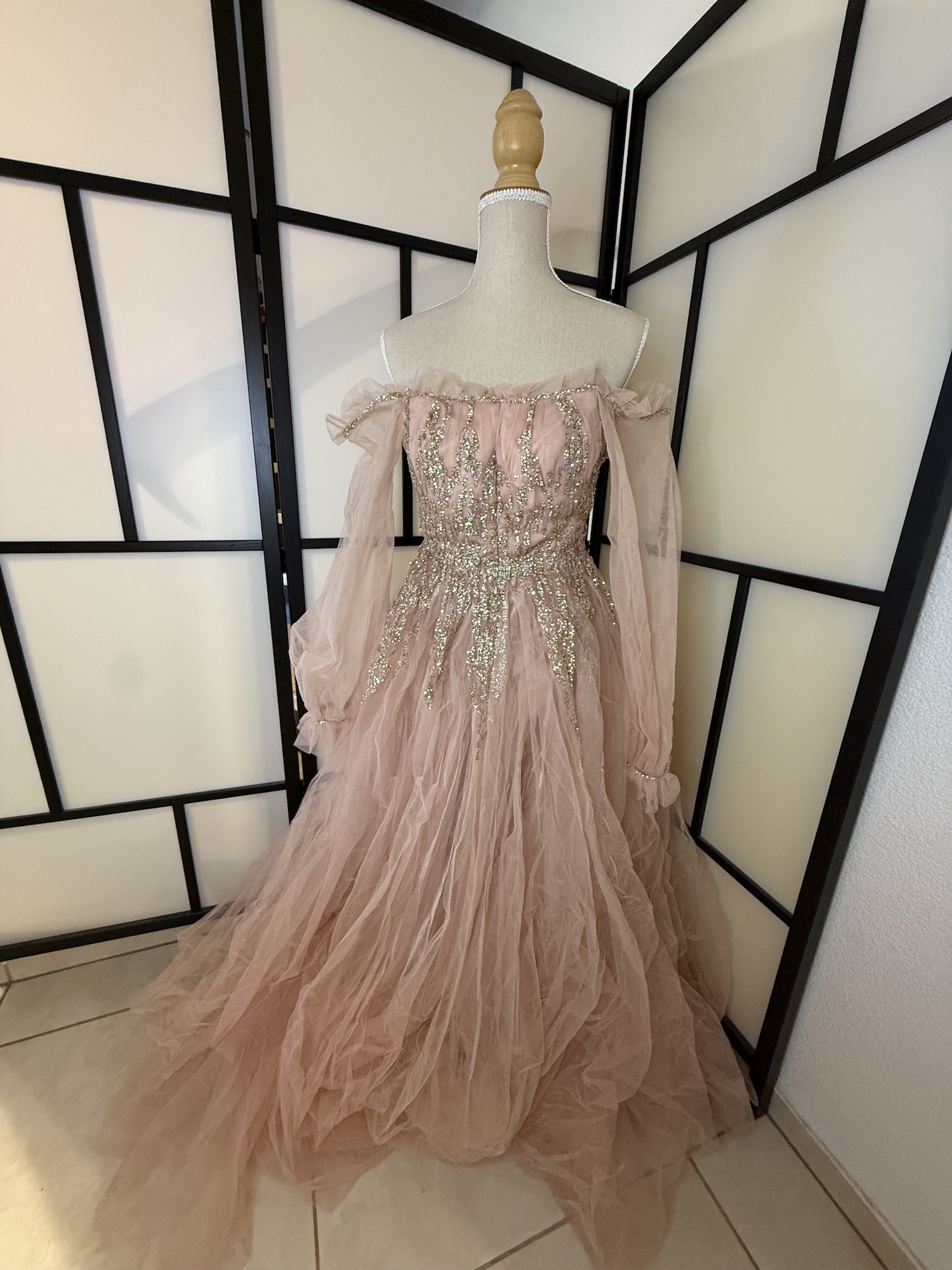 An elegant off-shoulder gown crafted in Turkey, designed in a soft blush tone that radiates romance and sophistication.