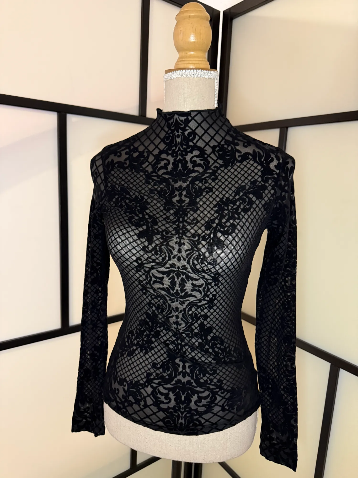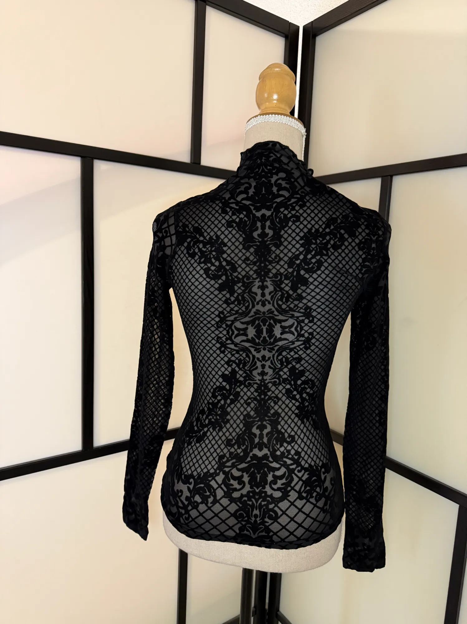 This sheer black top features an elegant gothic baroque velvet pattern layered over a diamond mesh base. It has a high neckline and slightly flared long sleeves, giving it a dramatic, romantic silhouette.