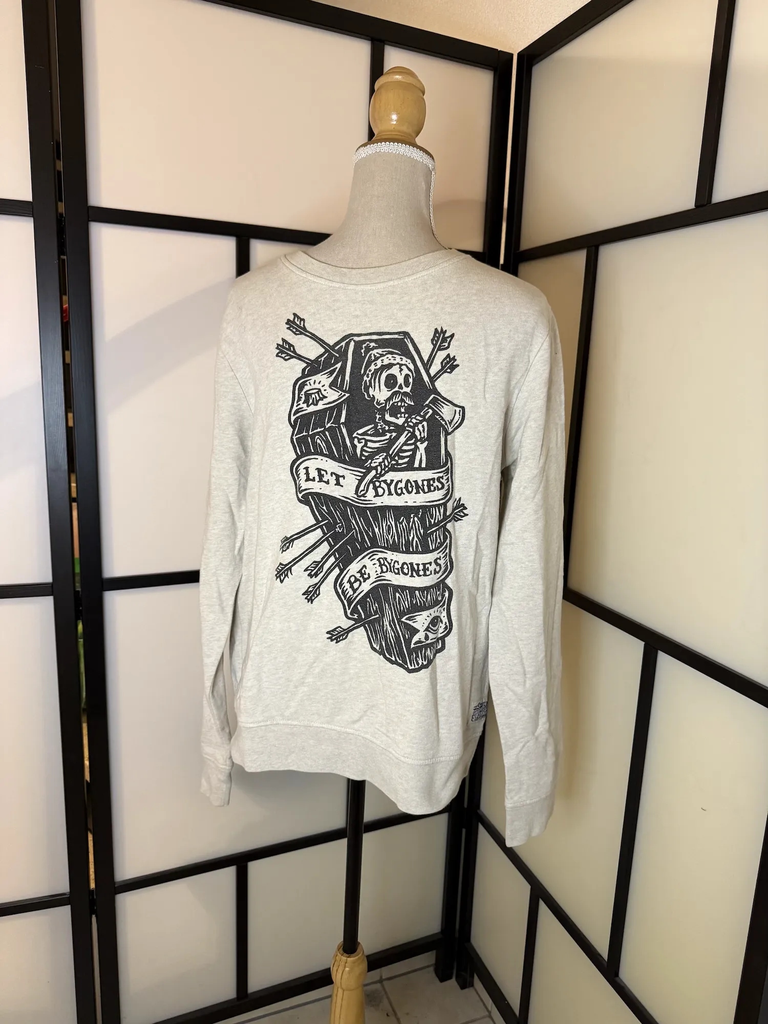 Features a large back graphic with a coffin, skeleton and crossed arrows design, along with the phrase “Let Bygones Be Bygones.” Bold black print on a light grey base gives it that classic skate / alternative streetwear feel.