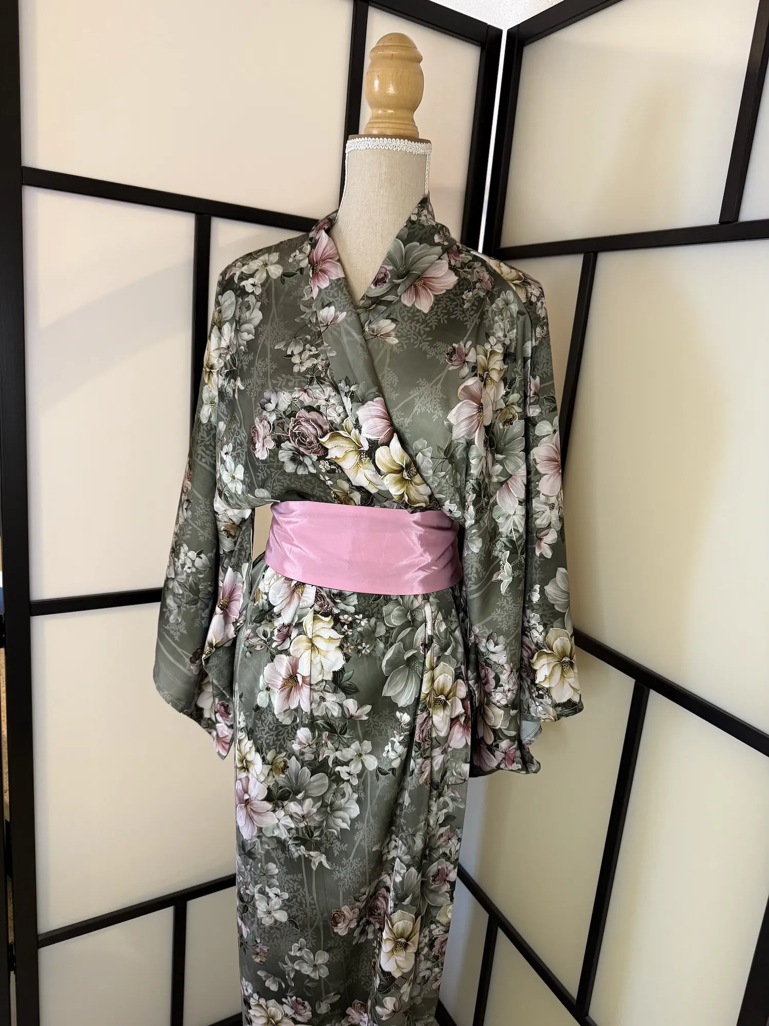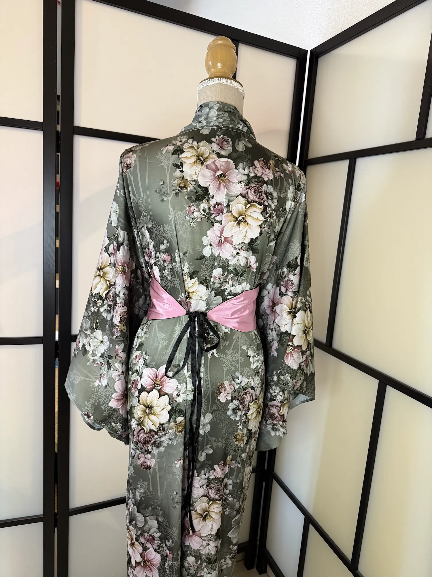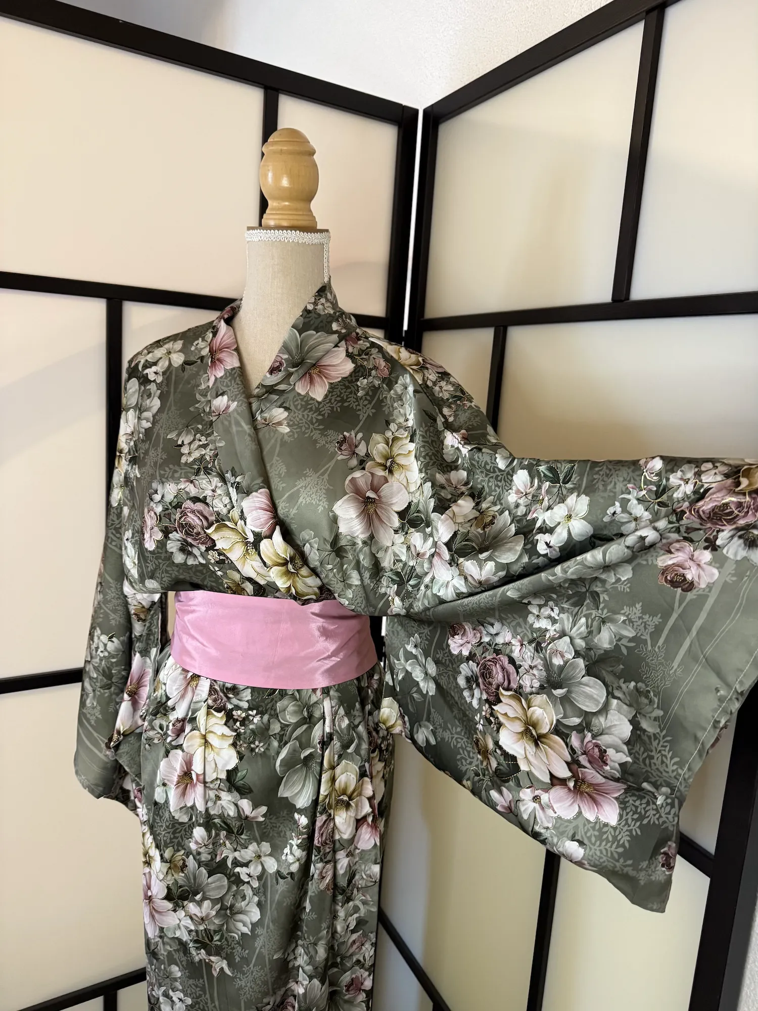 A beautifully detailed floral kimono featuring a soft sage-green base adorned with romantic blossom prints in delicate shades of pink, cream, and muted tones.