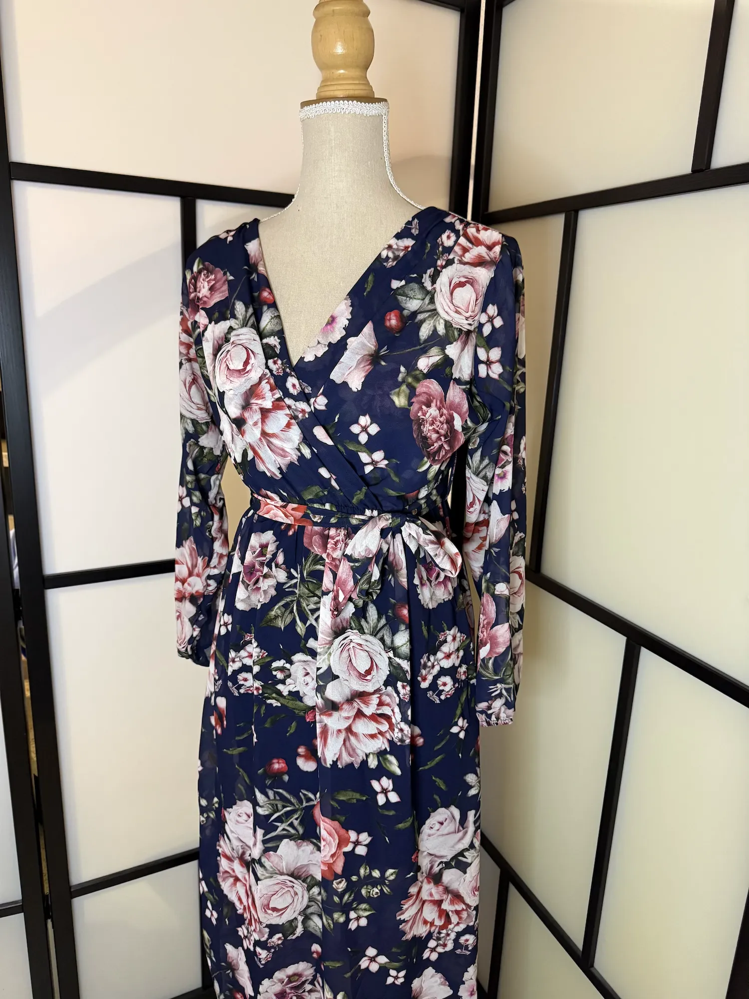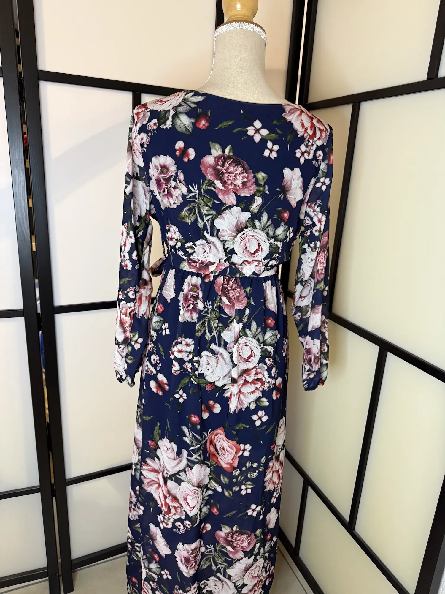 Details: Wrap-style neckline, adjustable waist tie, long sleeves, maxi length, floral print