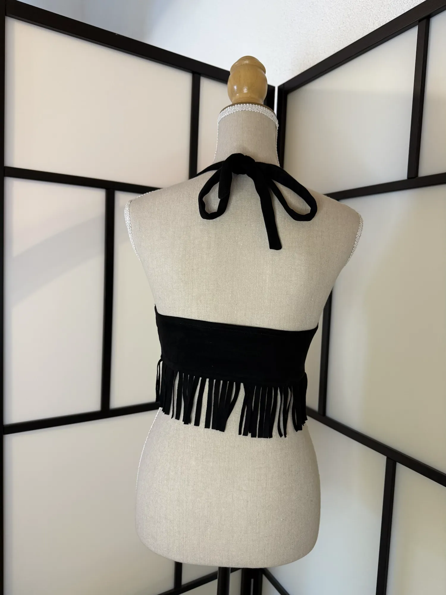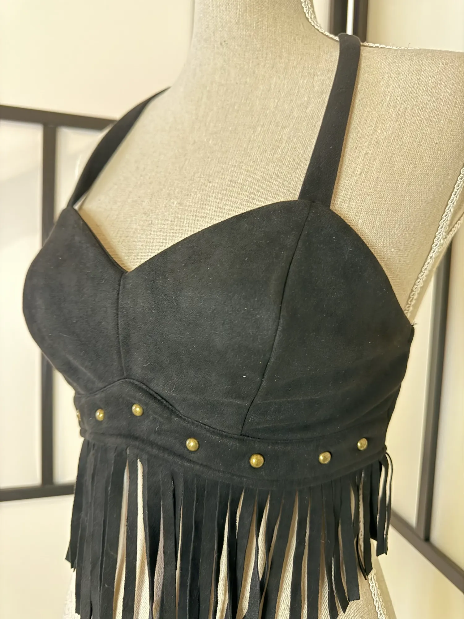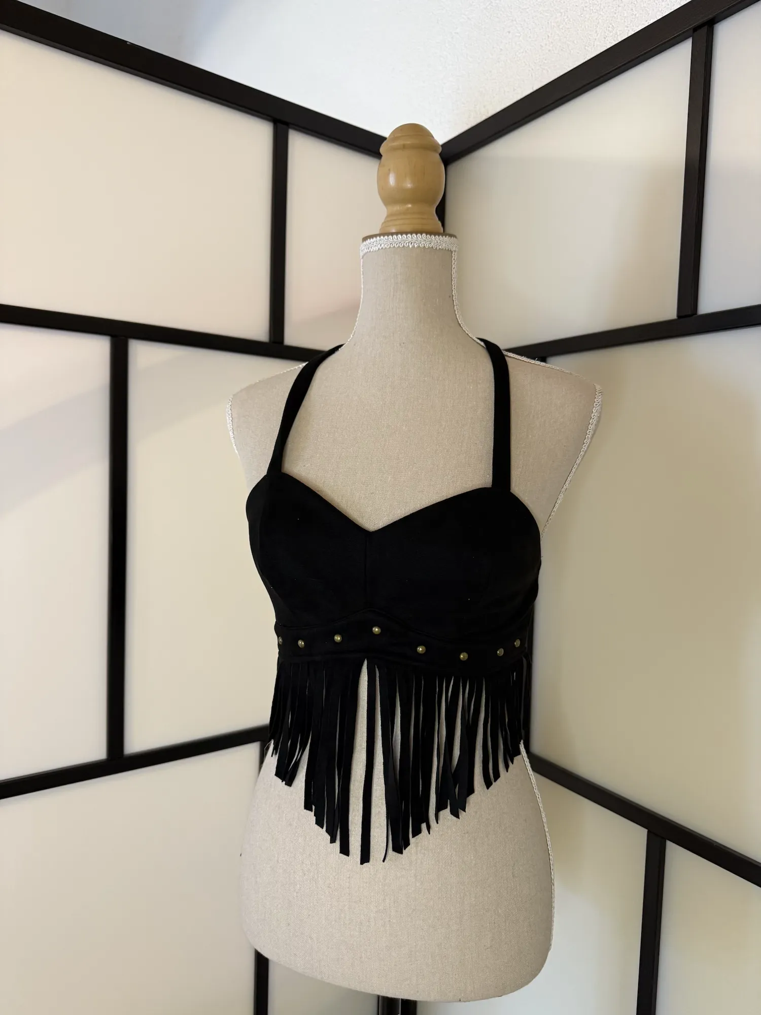 A bold black crop top featuring a structured bust design with adjustable straps and eye-catching fringe detail along the hem. Gold-tone stud accents add a subtle edgy touch, creating the perfect mix of boho, festival, and alternative vibes.