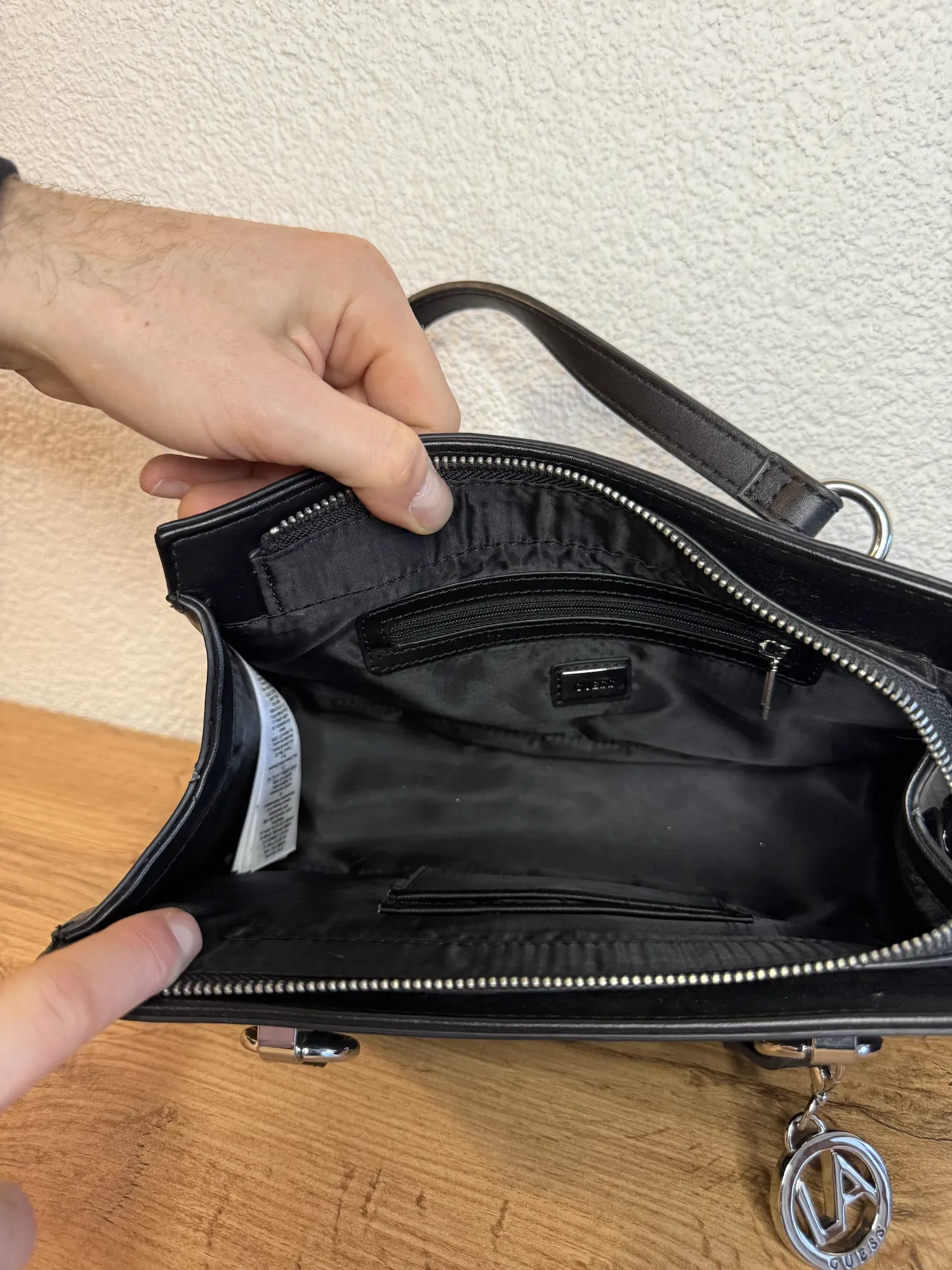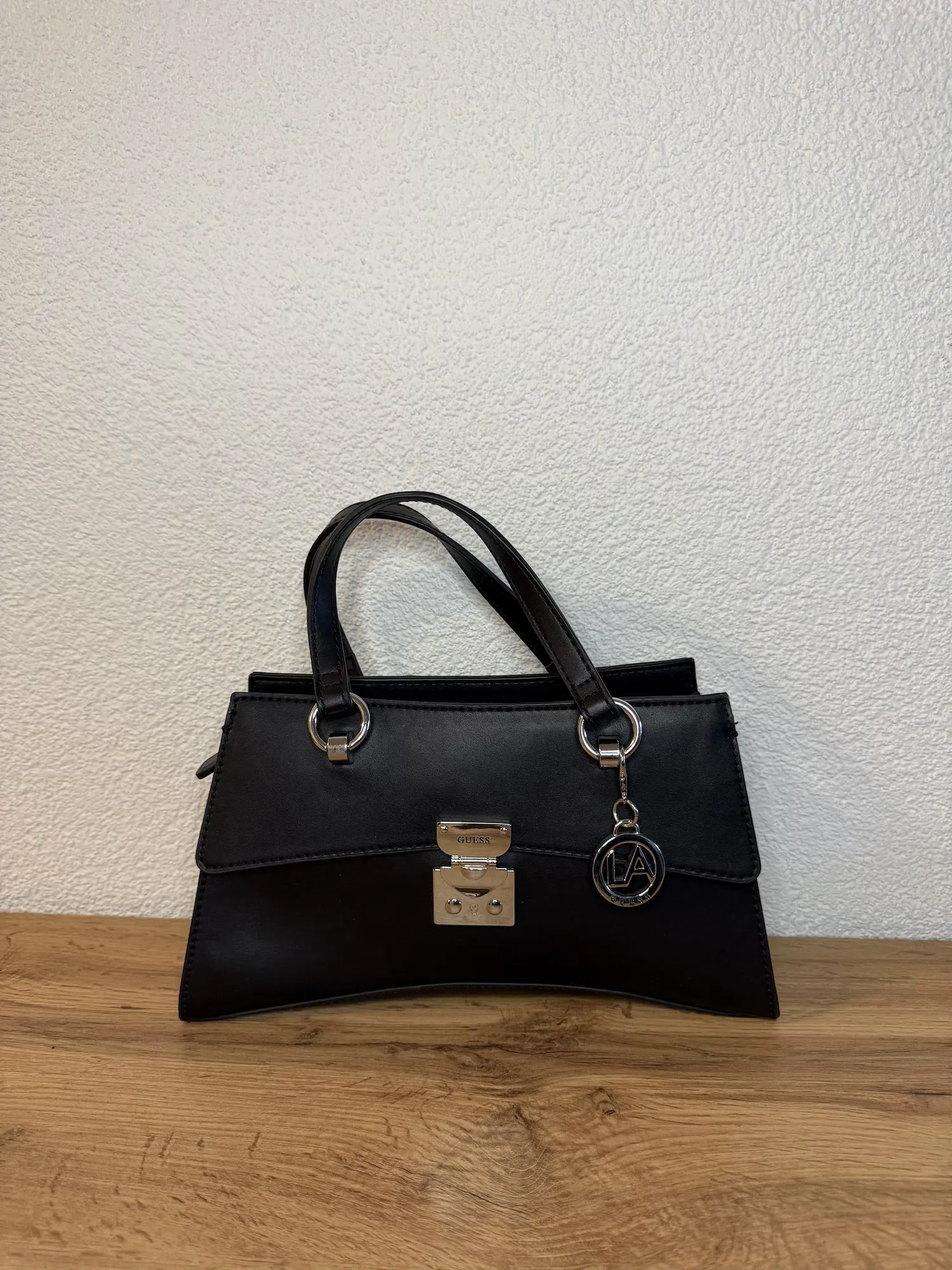 This sophisticated handbag features a structured silhouette with a smooth black finish and gold-tone hardware for a timeless, classy look. The front flap is detailed with a signature Guess metal clasp, adding a refined statement touch.