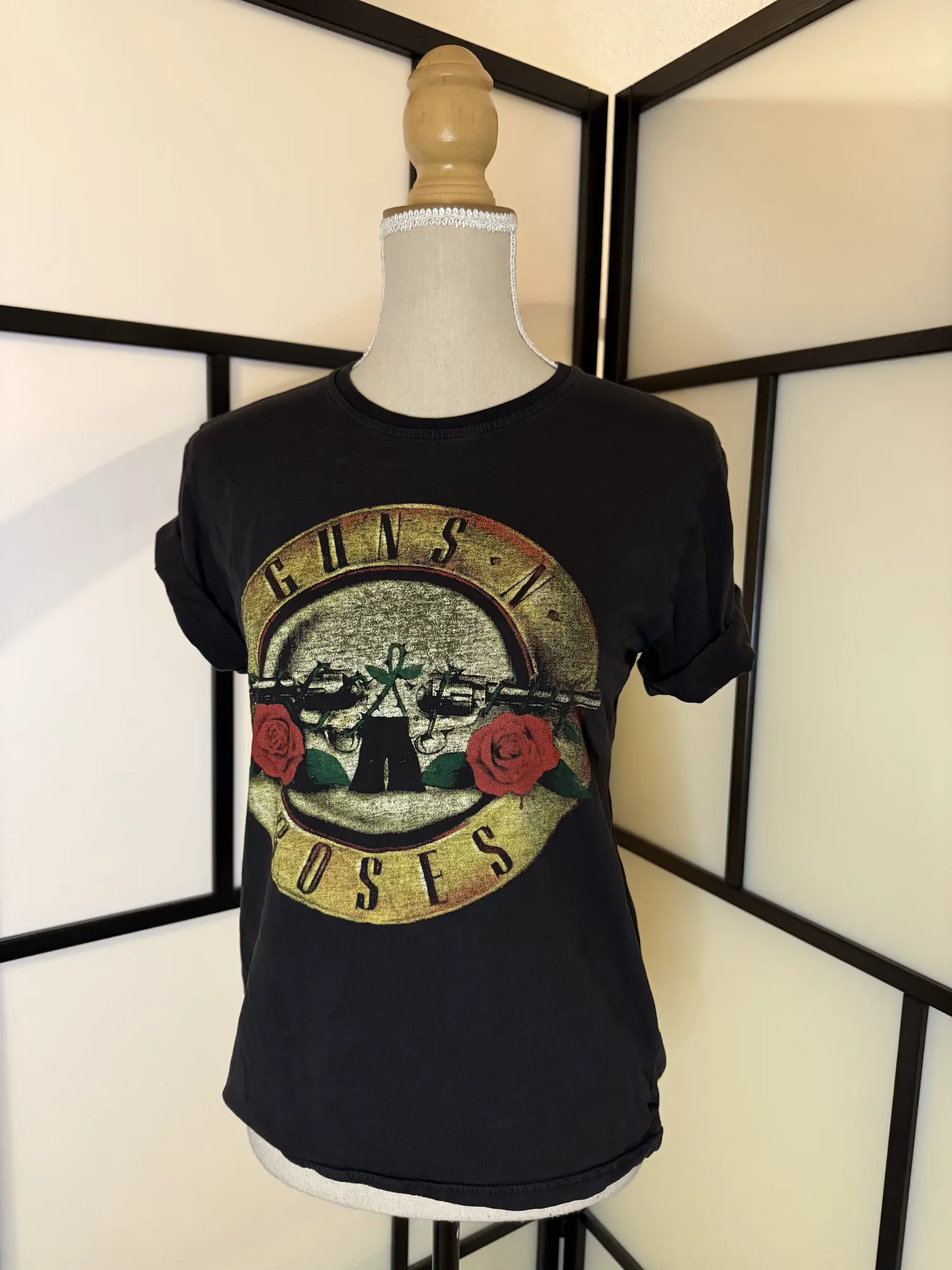 Black Guns N’ Roses graphic T-shirt featuring the iconic circular logo with crossed guns and red roses. A timeless rock classic that never goes out of style.