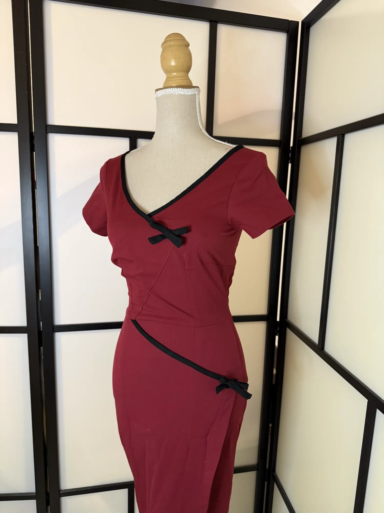 Details: Asymmetric neckline, black contrast trim, decorative bows, fitted silhouette