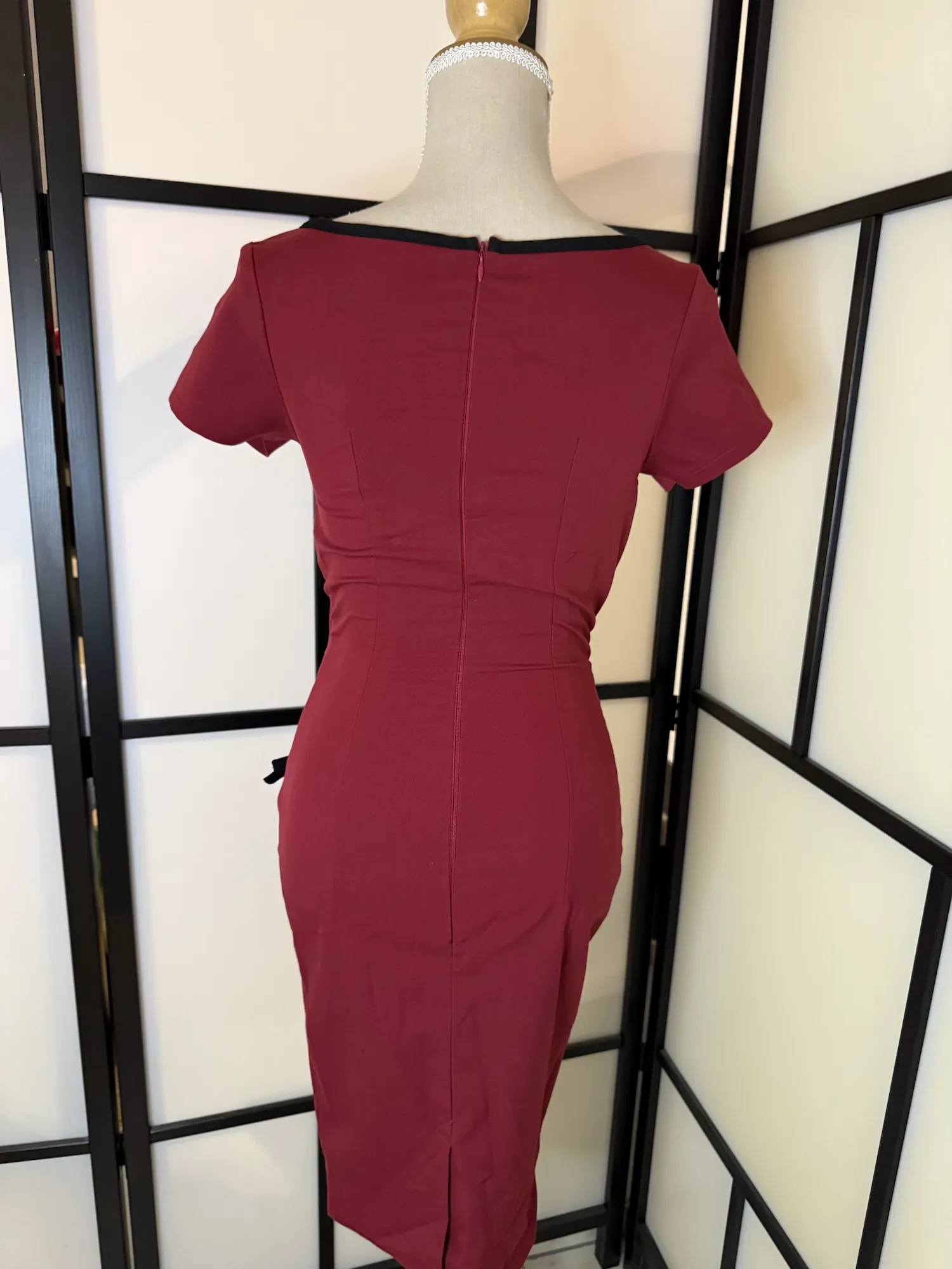 Unique handmade custom-made dress in a stunning deep red shade with elegant black contrast details. This special piece features a flattering fitted silhouette that beautifully accentuates the waist and curves.