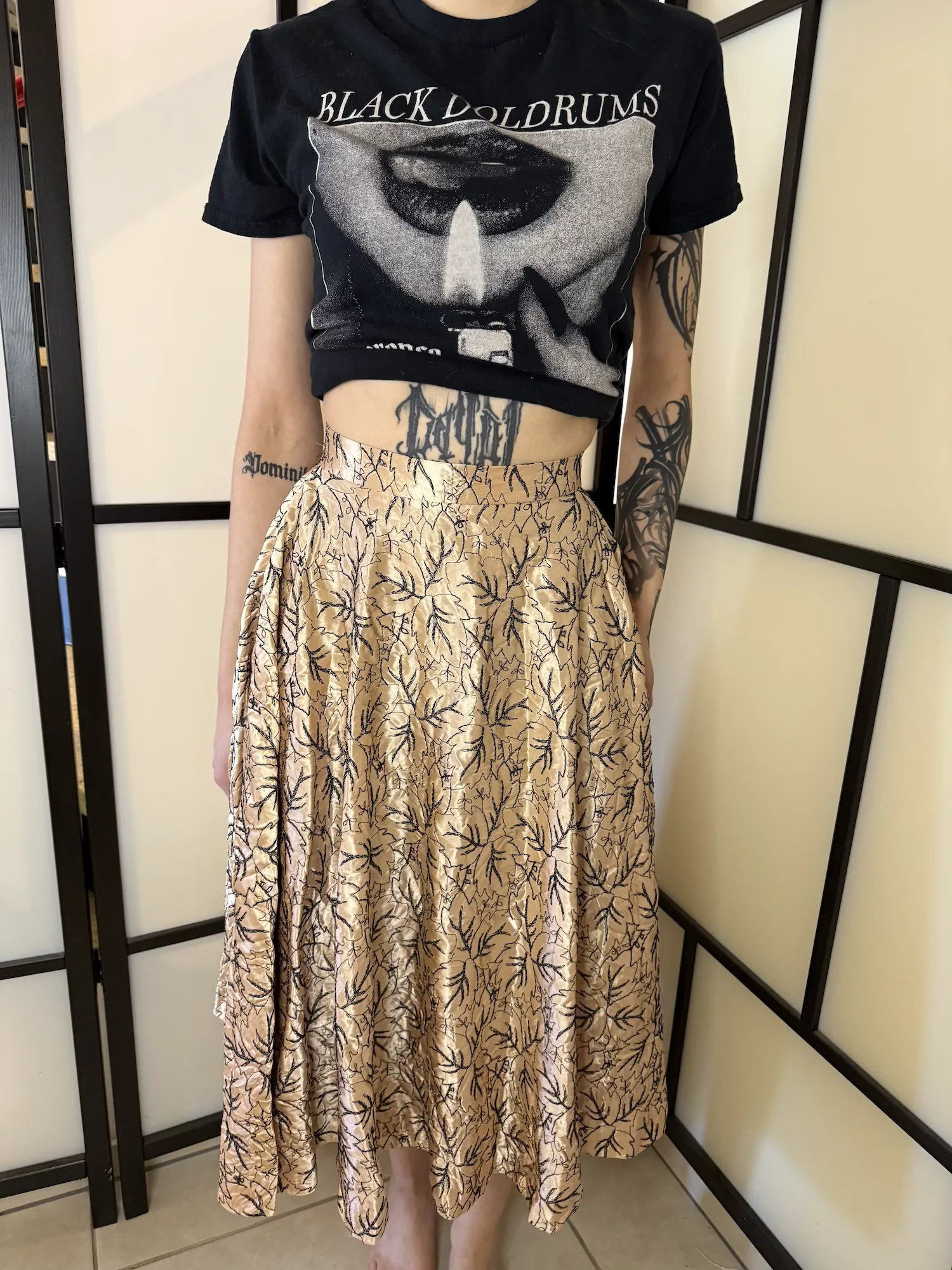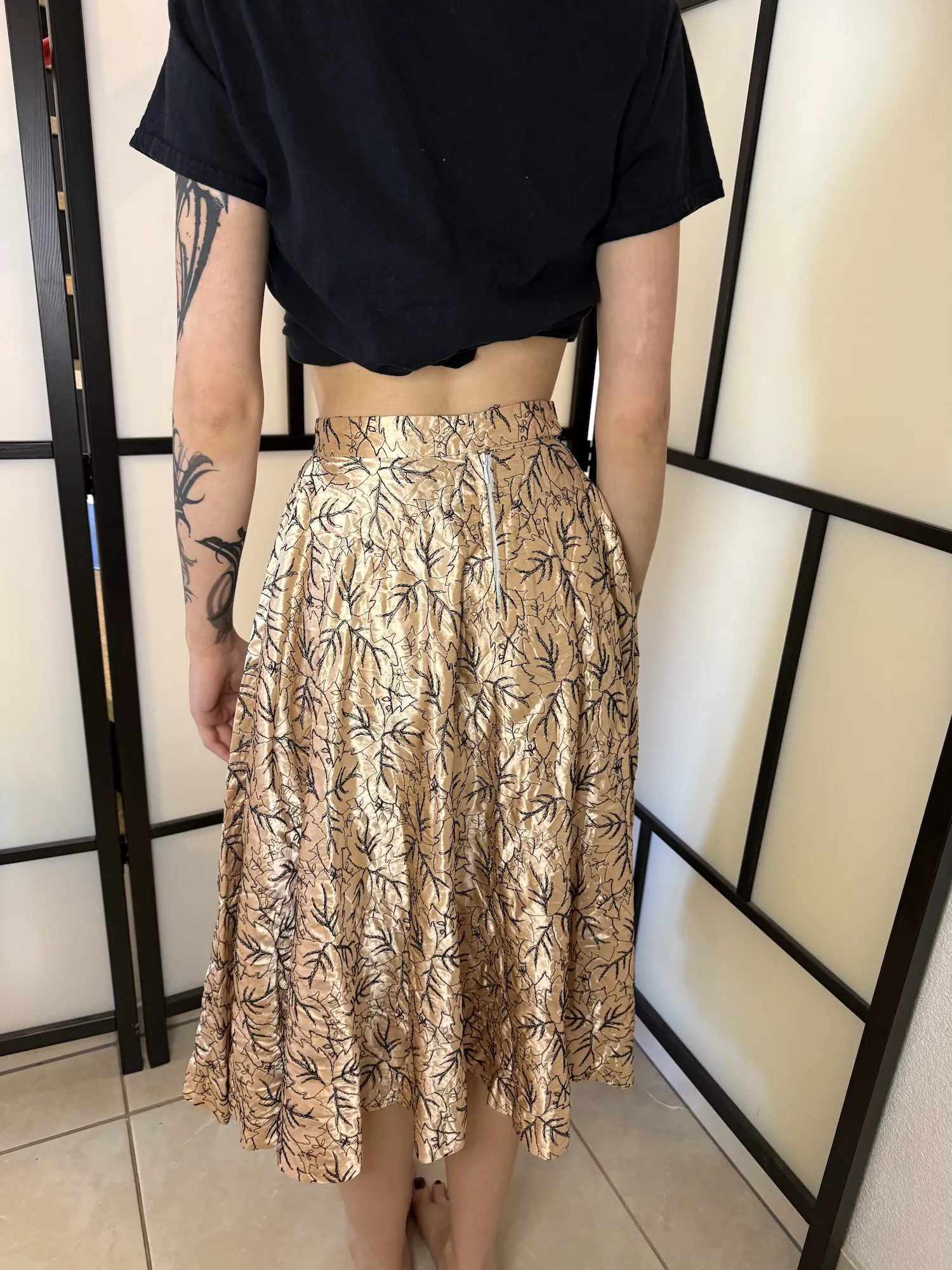 Designed with a high-waisted silhouette, this piece creates a flattering shape while offering beautiful movement through its flowing, midi-length cut. The warm golden-beige fabric is enhanced by delicate black botanical-style detailing, giving it an elegant yet distinctive vintage appeal.