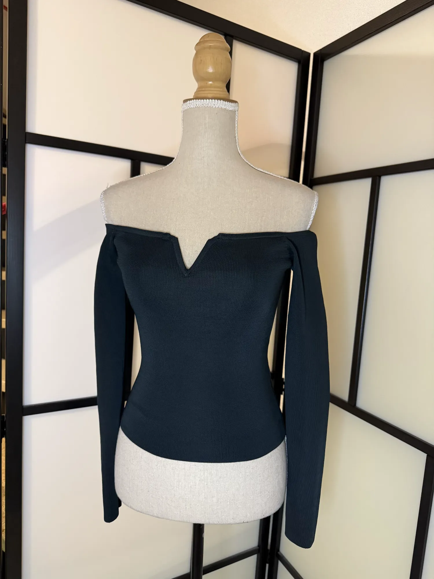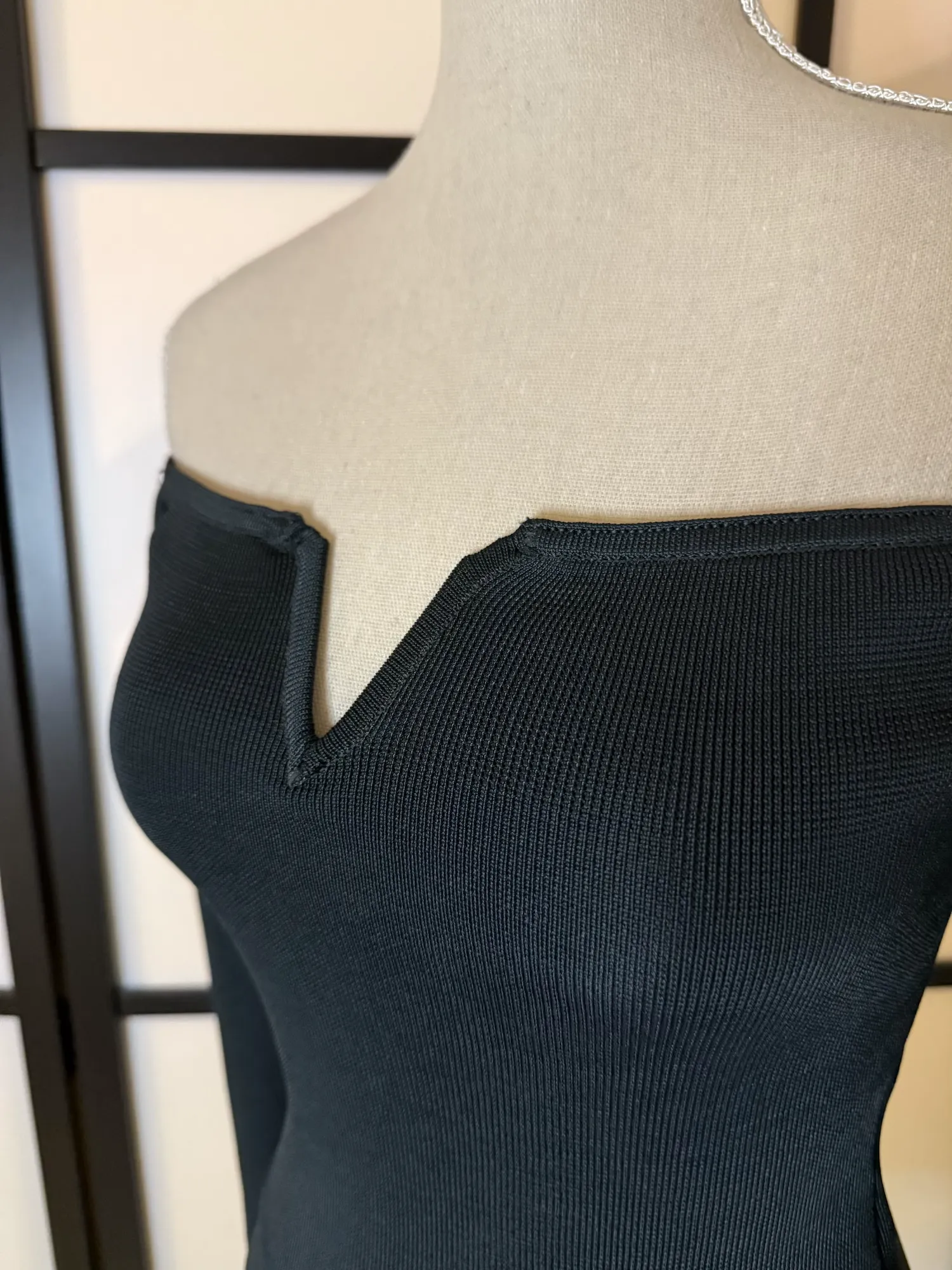 Features a flattering fitted silhouette with a ribbed stretch fabric that hugs the body beautifully. The off-shoulder neckline with subtle V-notch detail adds a sleek, feminine touch while keeping it minimal and classy.