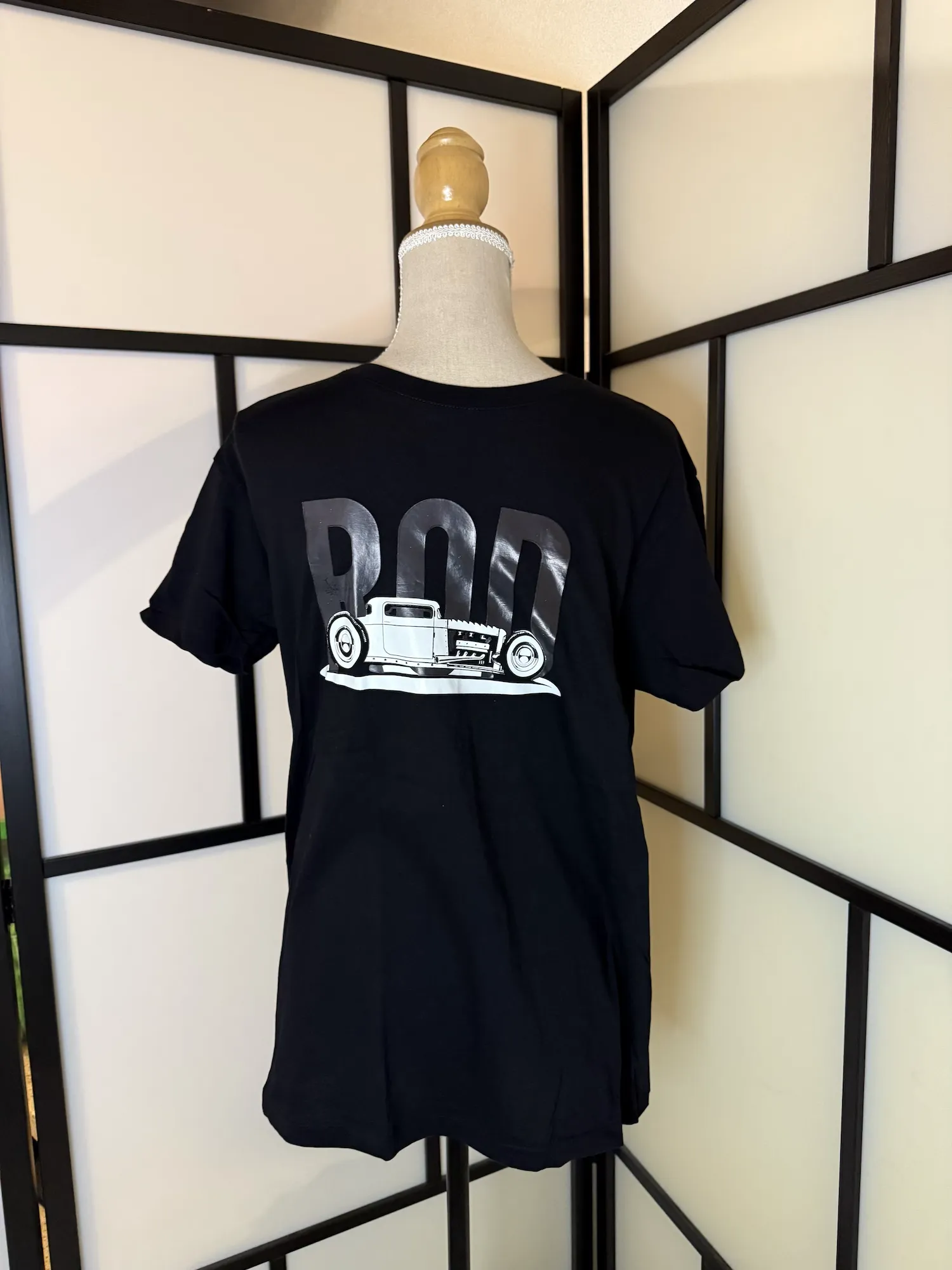 Black Hot Rod graphic T-shirt in size Medium, used condition, featuring a bold back print with large “ROD” lettering and a classic lowrider hot rod car illustration.