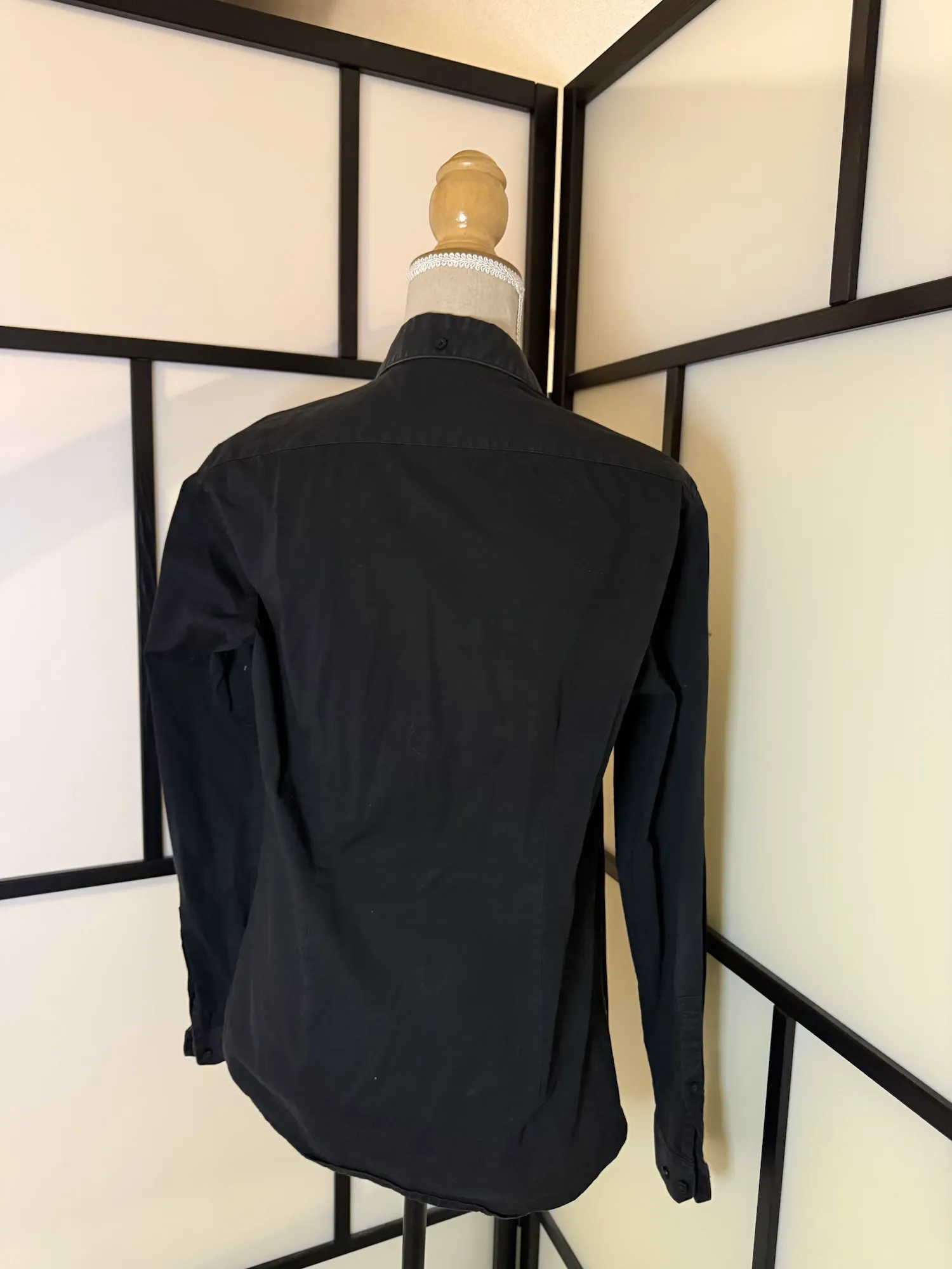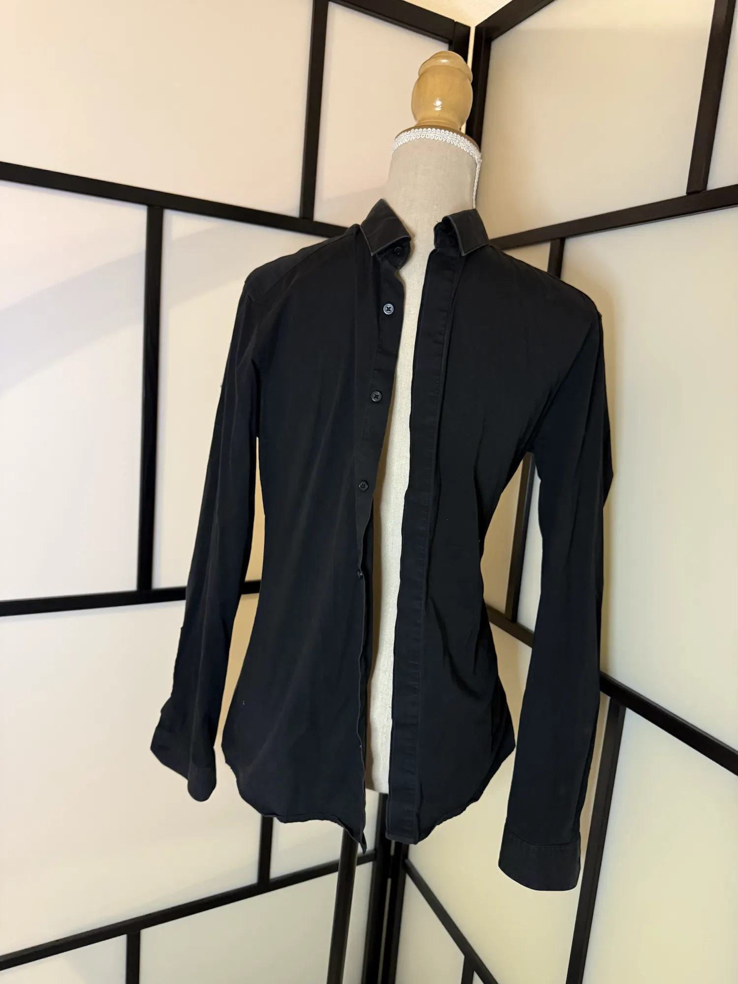Slim fit in a deep black tone with a clean, minimal design. Features full button closure, classic collar, and long sleeves with buttoned cuffs. The lightweight fabric gives it a smooth, elegant drape and makes it perfect for both smart and casual styling.