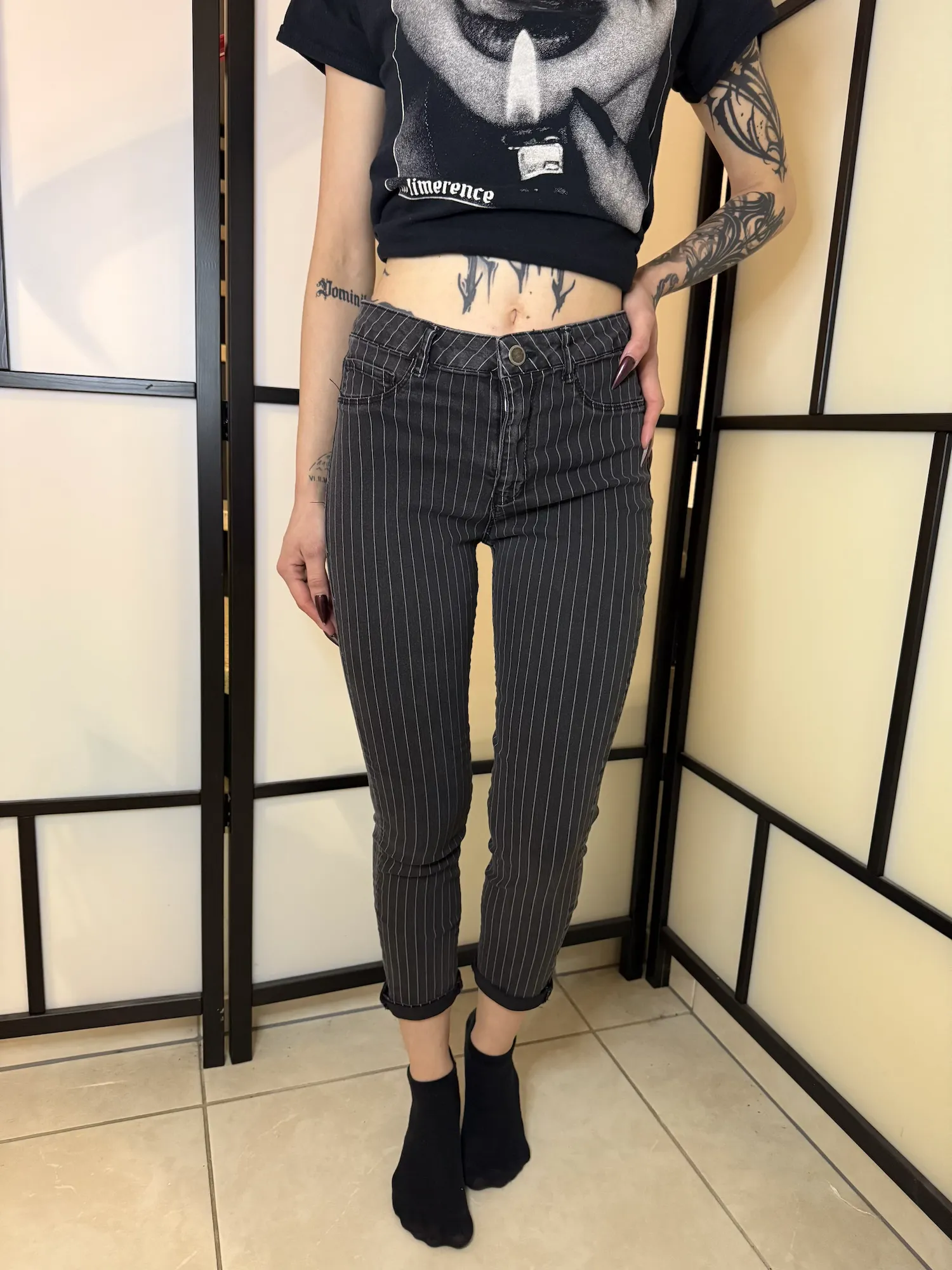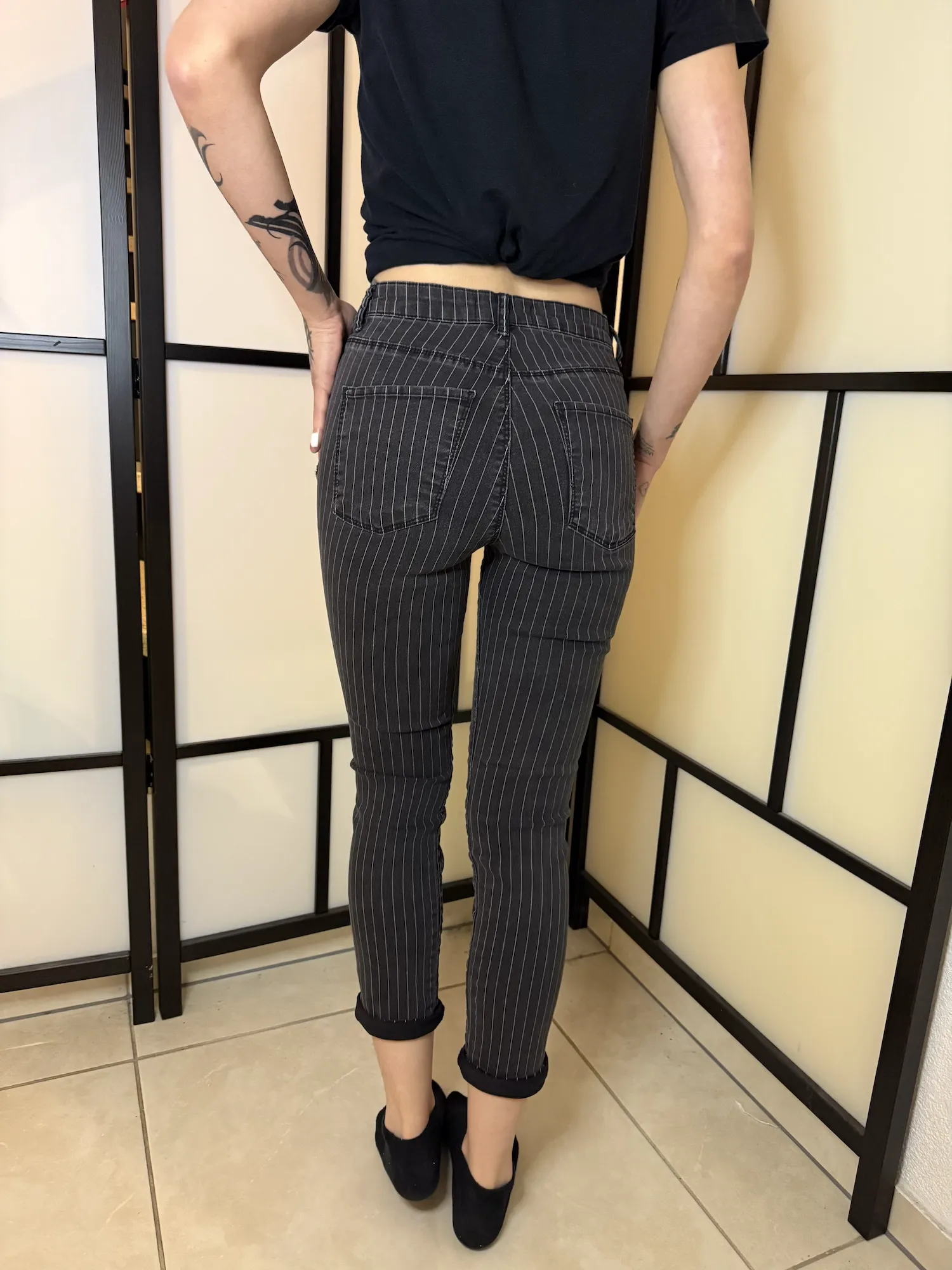 Slim-fit jeans by Koton in dark grey with fine white pinstripes. Flattering mid-rise cut with a fitted leg and cropped ankle length.