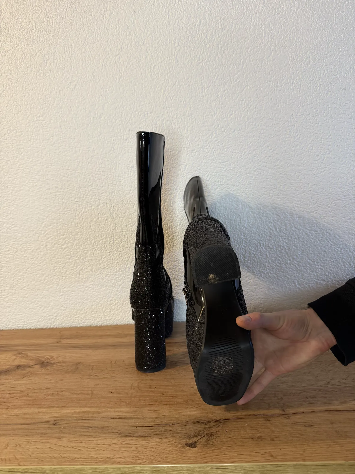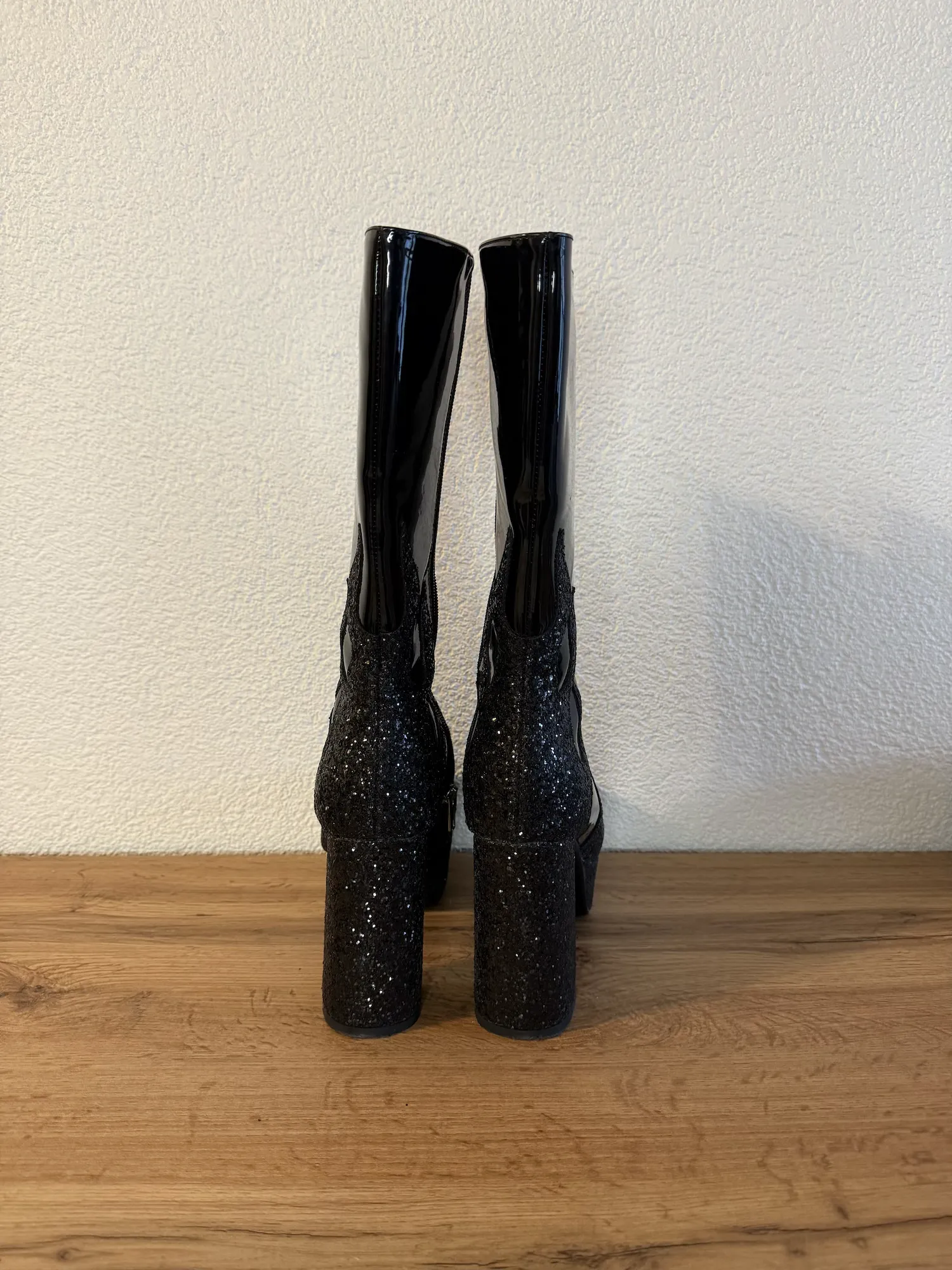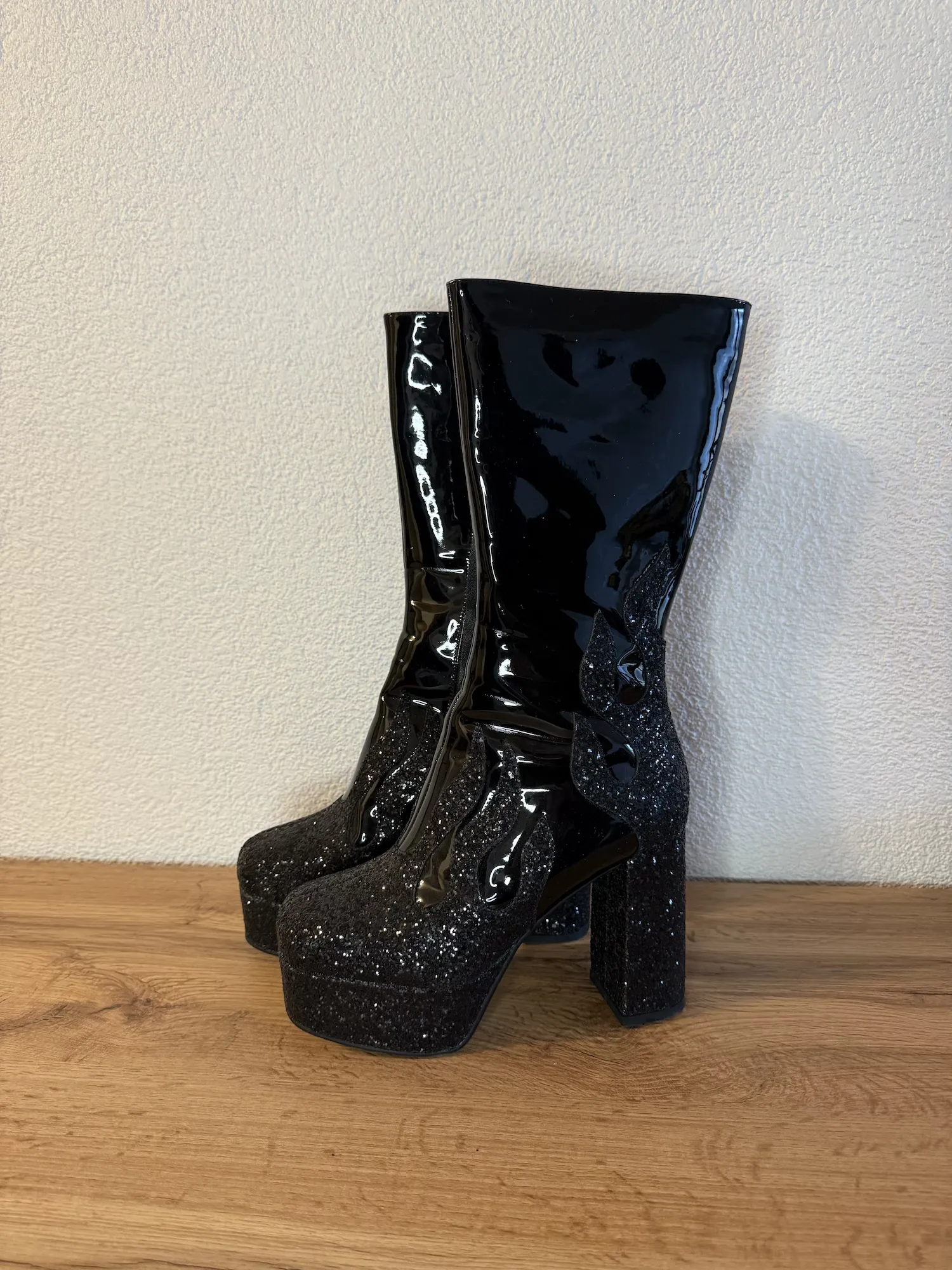 Mid-calf length with a sleek, structured shape that hugs the leg beautifully. The mix of glossy black and sparkling texture makes them the ultimate standout piece for nights out, festivals, or styling up an all-black fit.