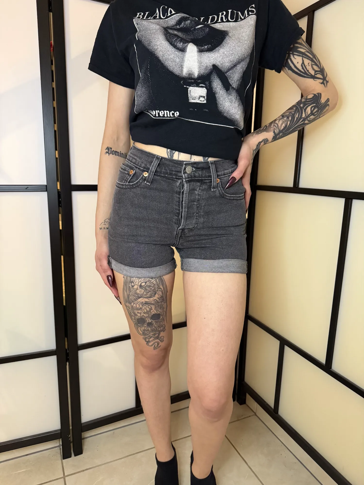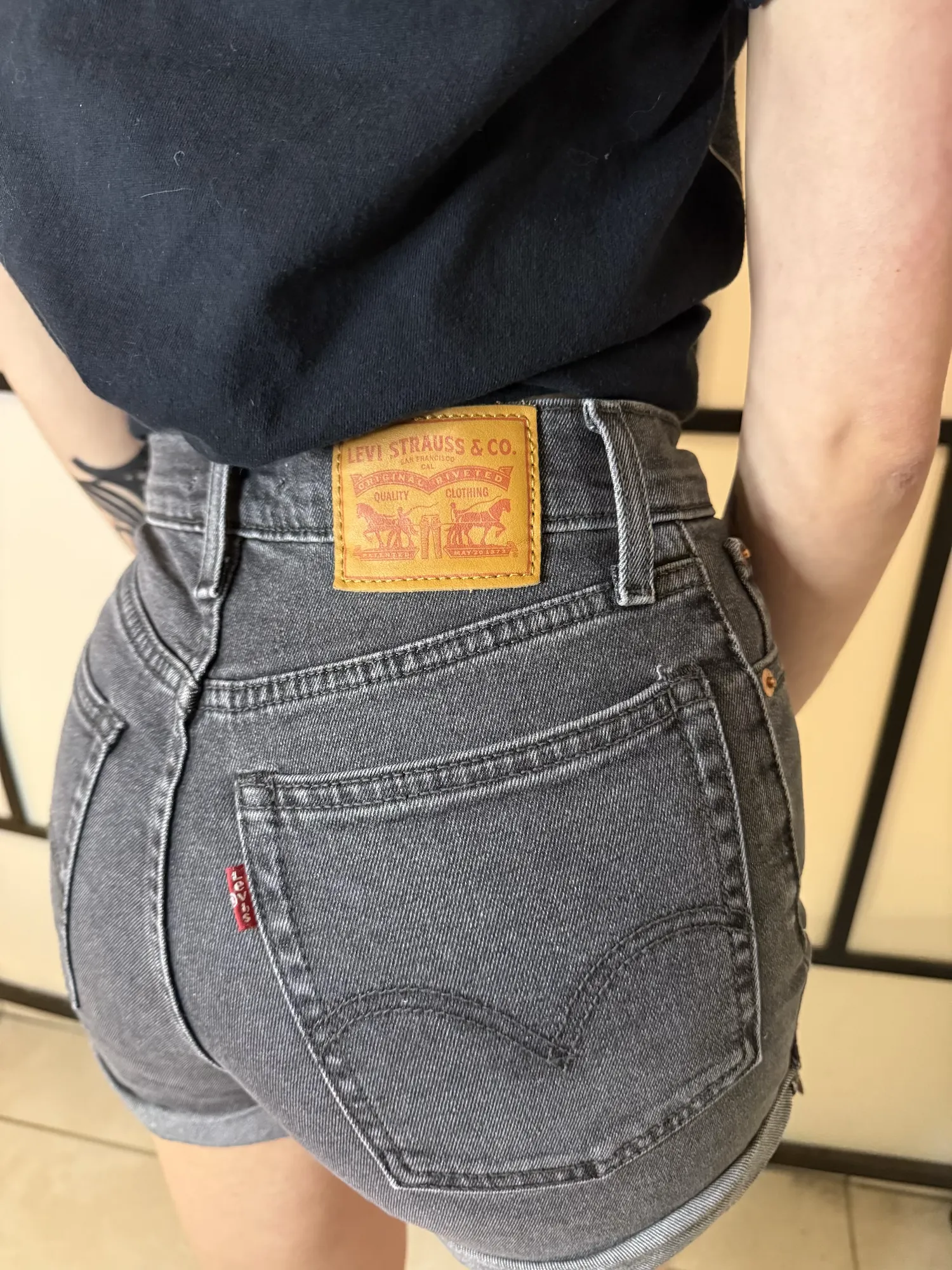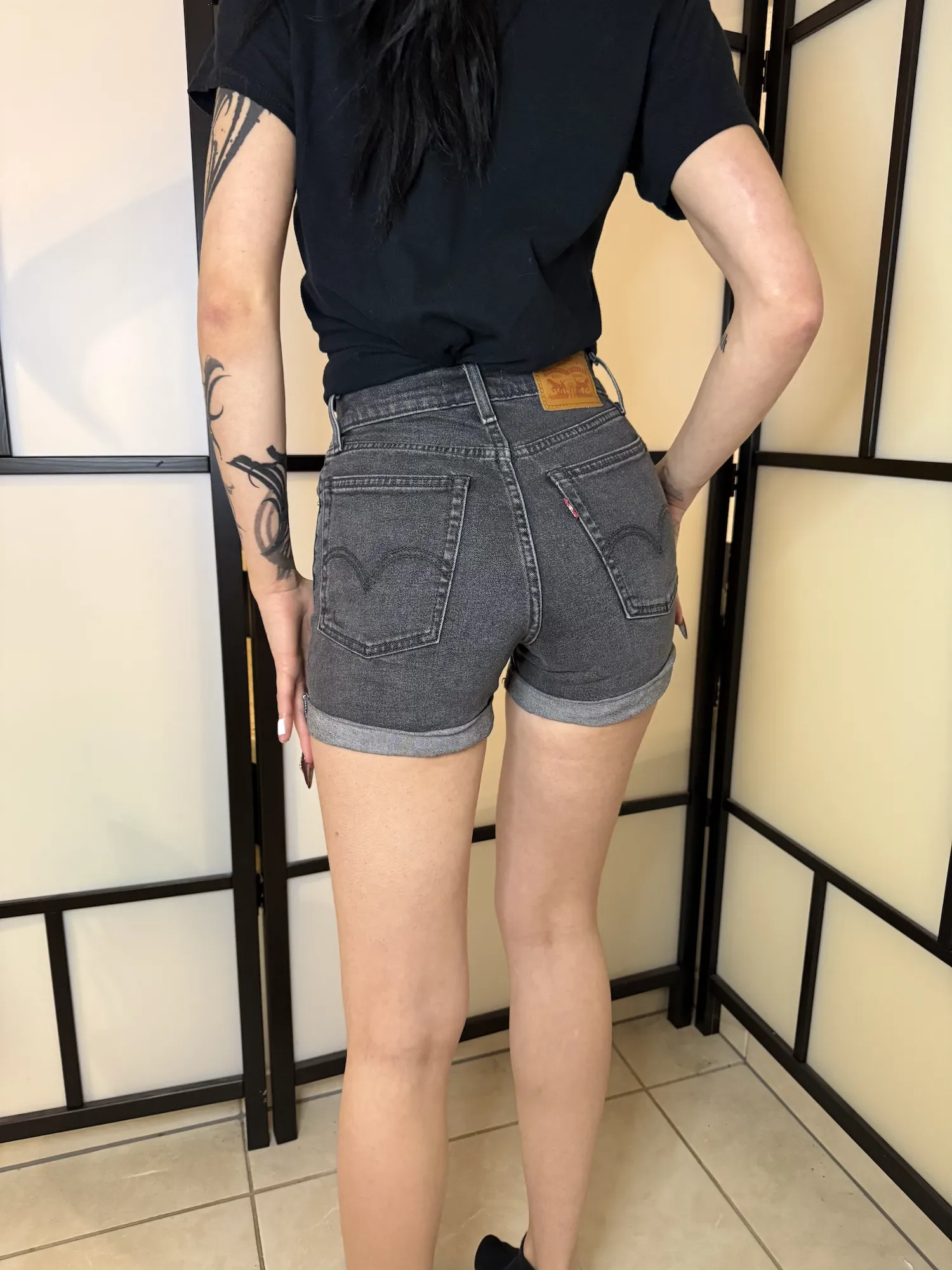 Black washed denim shorts by Levi’s in size 24, worn and in good condition.