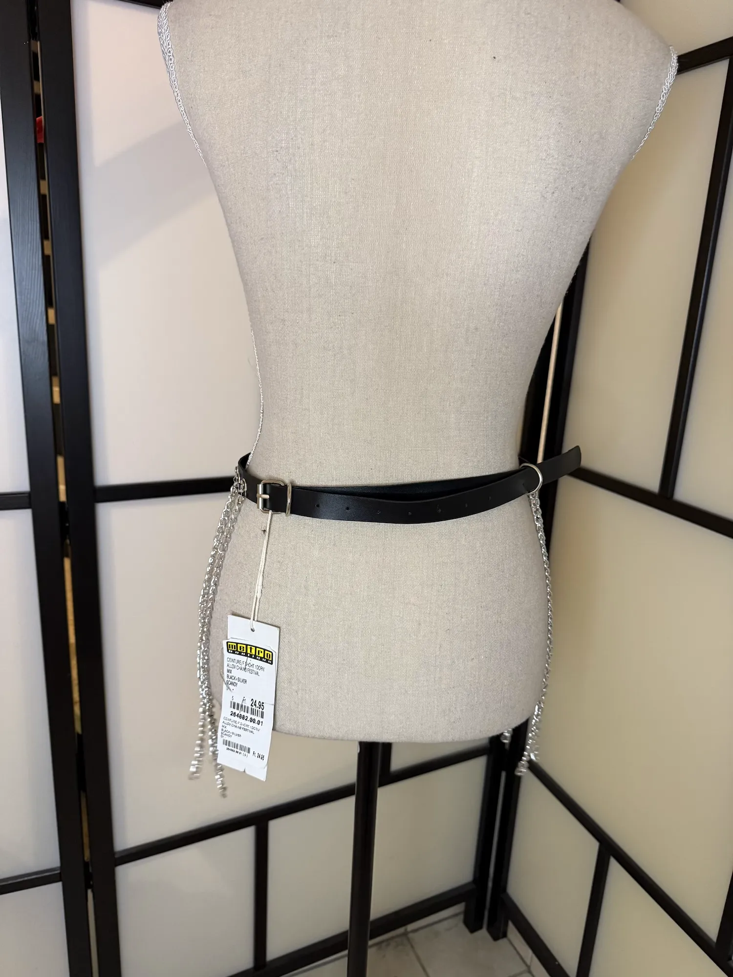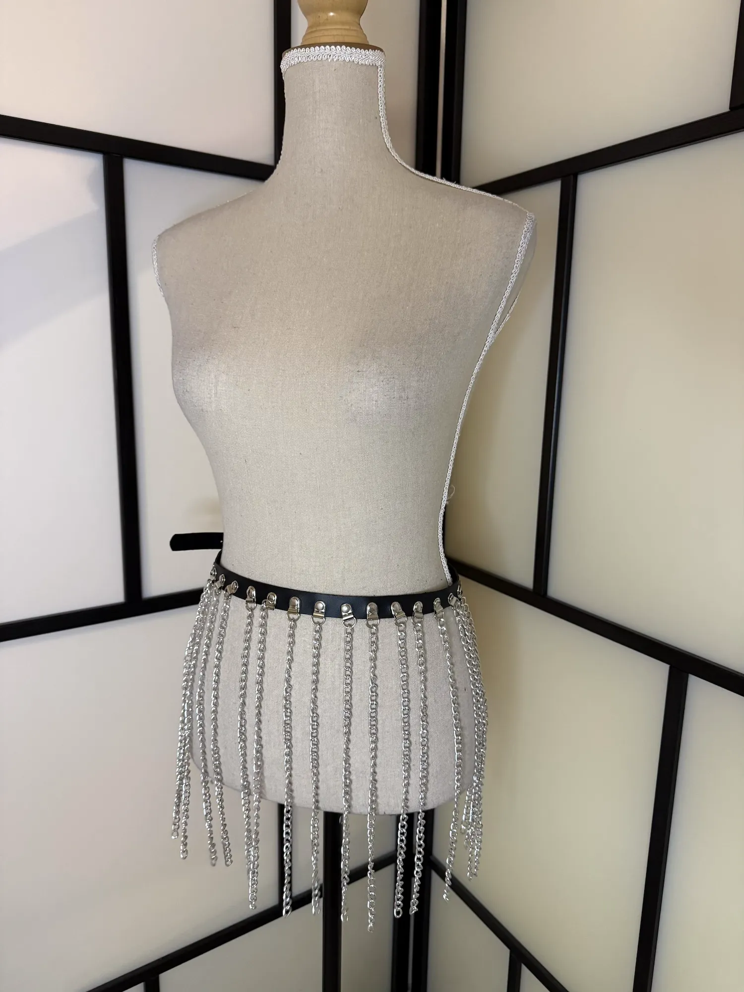 Statement chain belt skirt by Metro featuring multiple silver-tone chain strands attached to a black faux leather belt base. The layered chains create a bold, edgy look that instantly elevates any outfit.