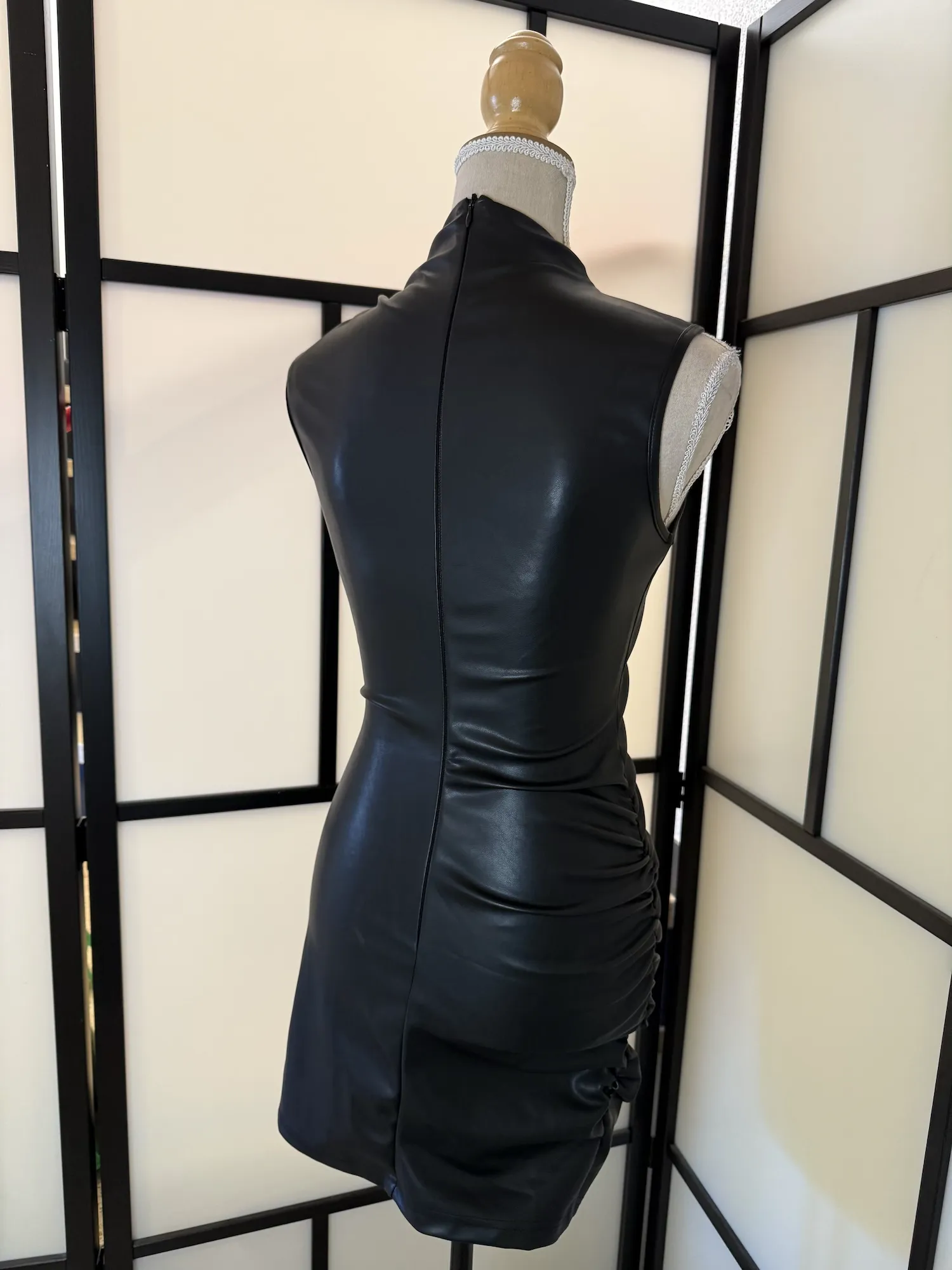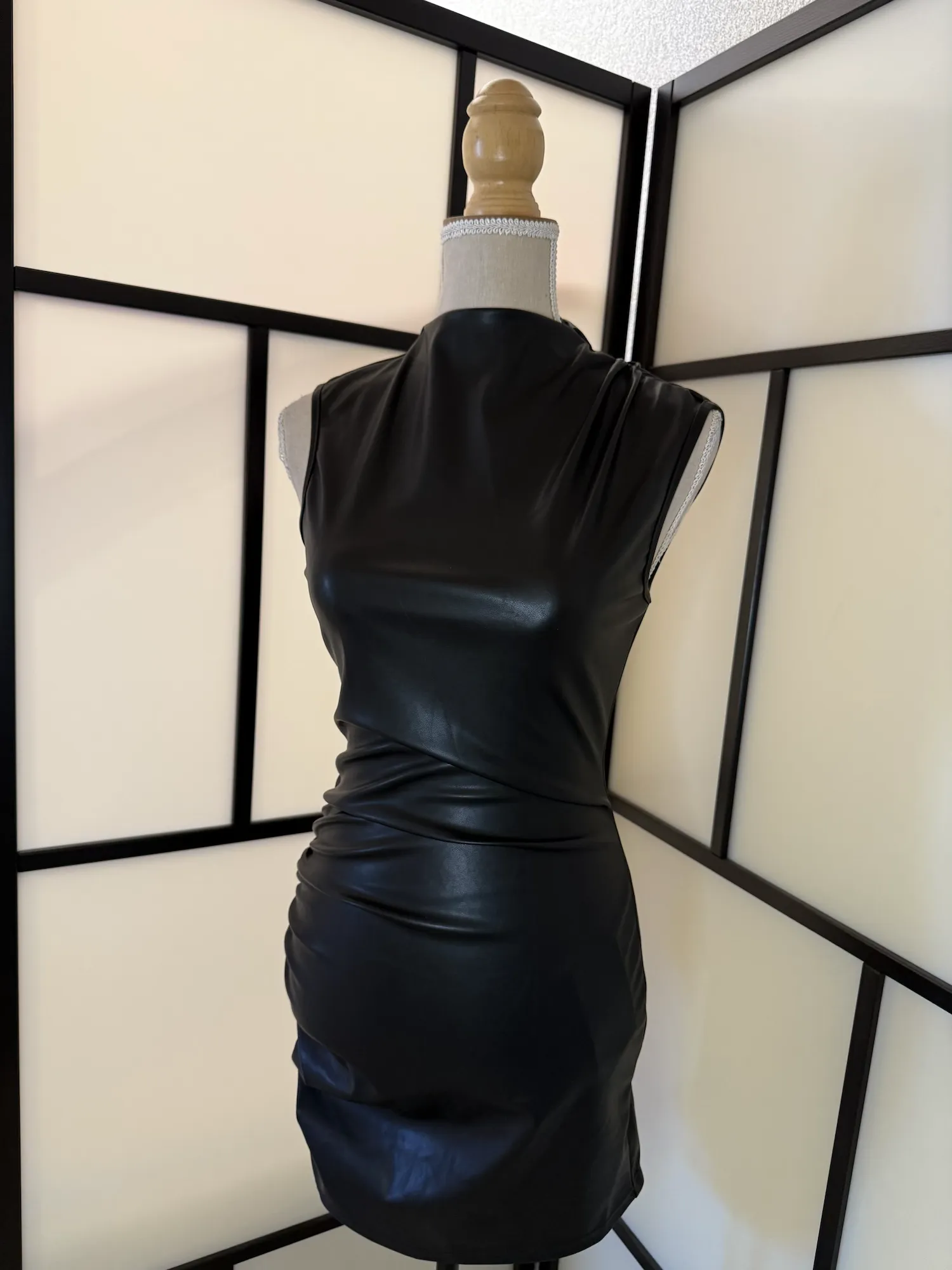 Stunning black faux leather mini dress by Missguided featuring a high neckline and figure-hugging silhouette. The ruched detailing at the waist creates a super flattering shape and gives that sleek, edgy vibe.