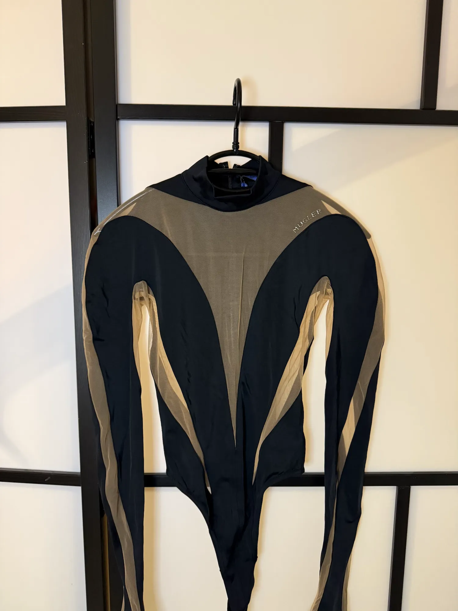 Features Mugler’s signature sculpting design with sheer nude mesh panels and structured black contouring that creates a dramatic, body-enhancing silhouette. High neckline, long sleeves, and snap-button closure at the bottom.