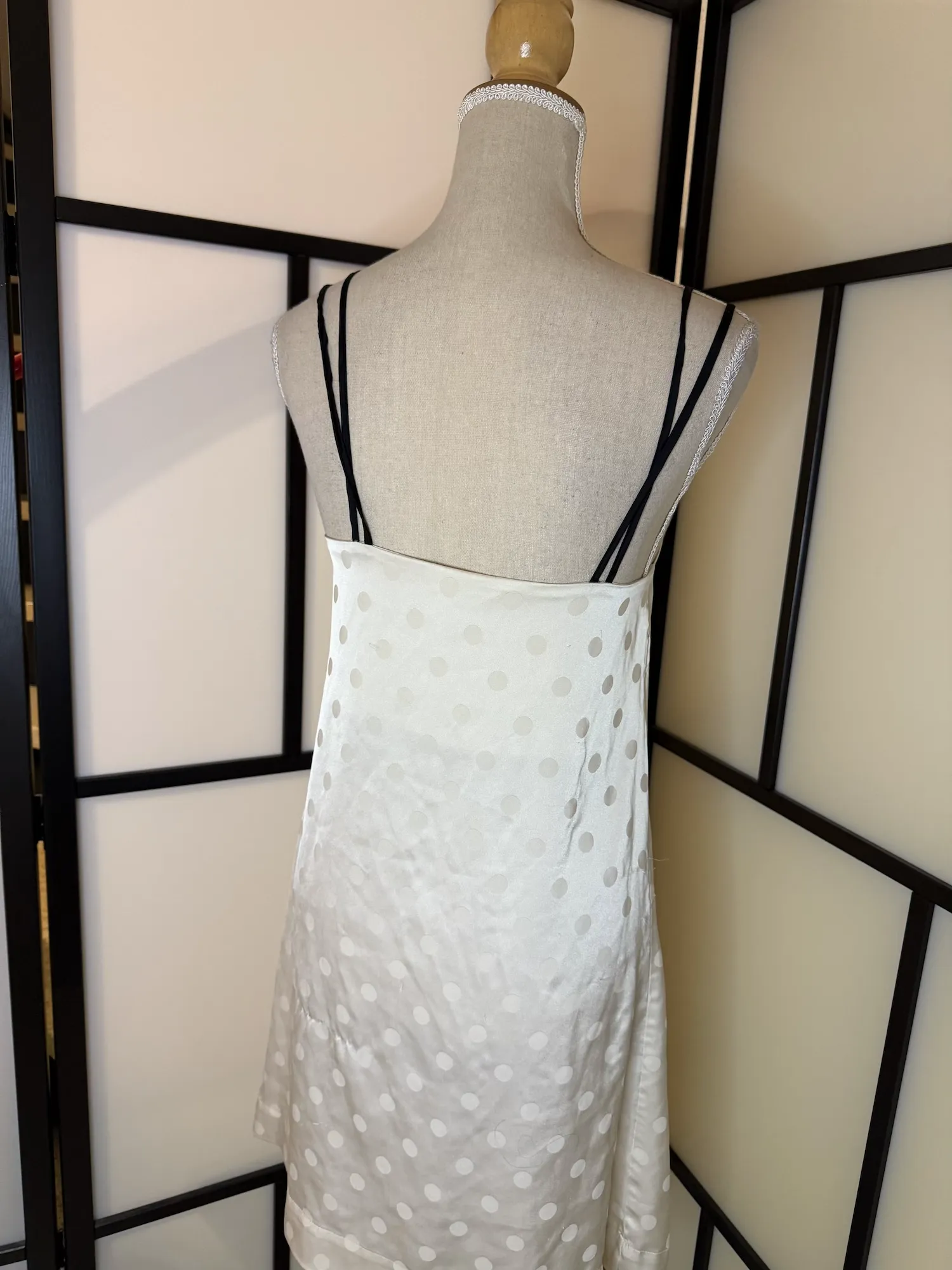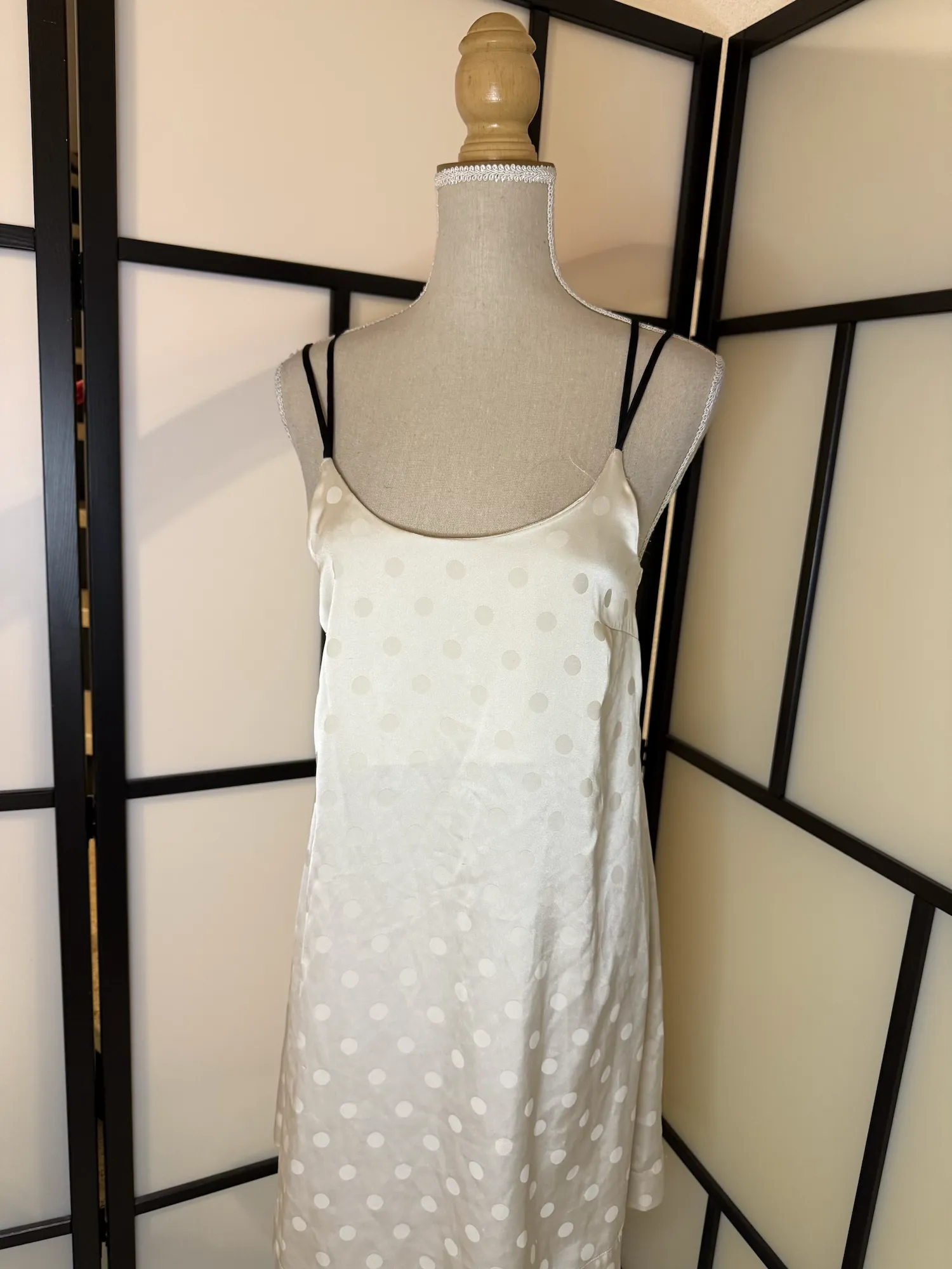 Elegant satin-style slip dress in size XS featuring a soft champagne/cream tone with subtle polka dot detailing.