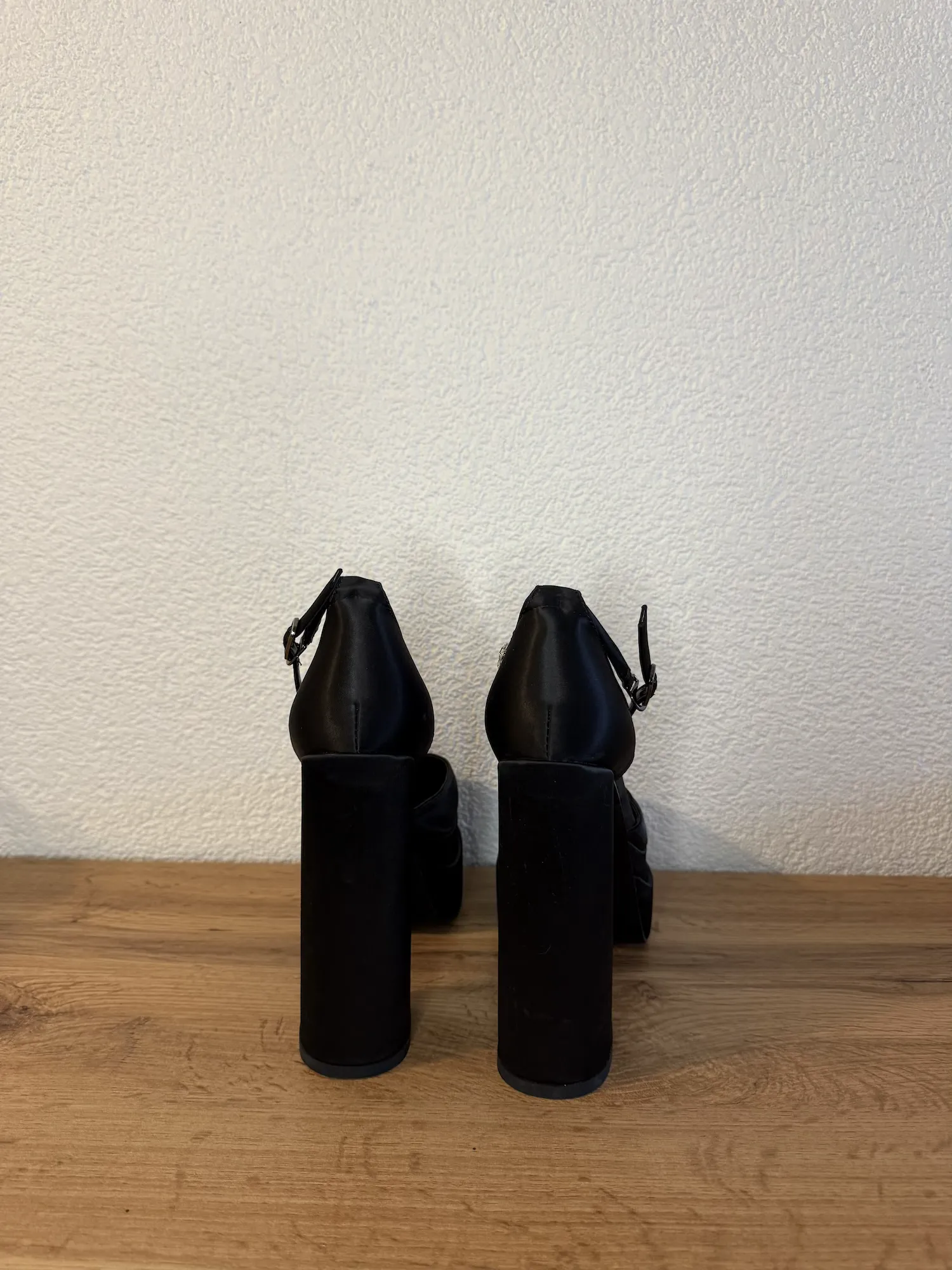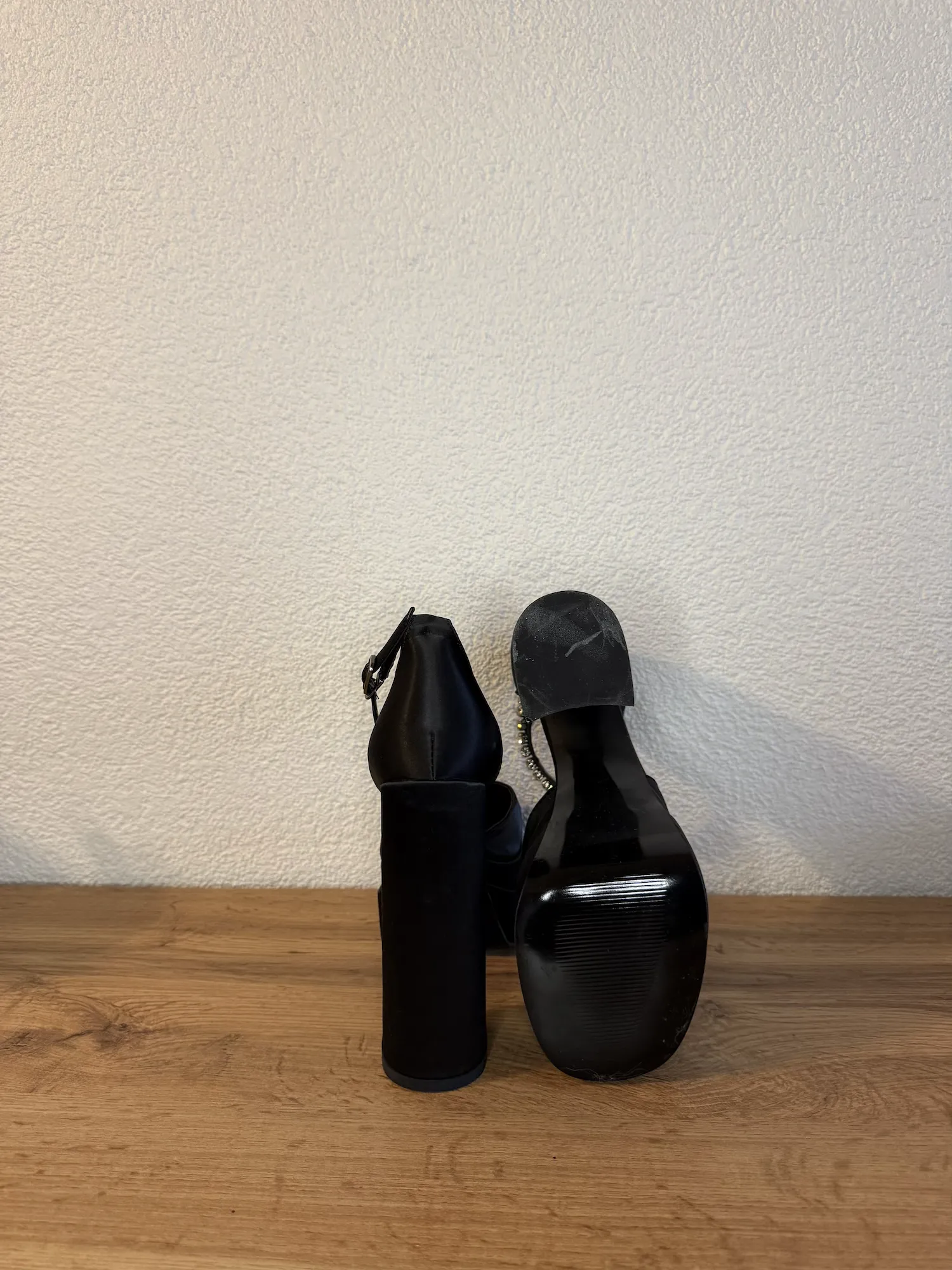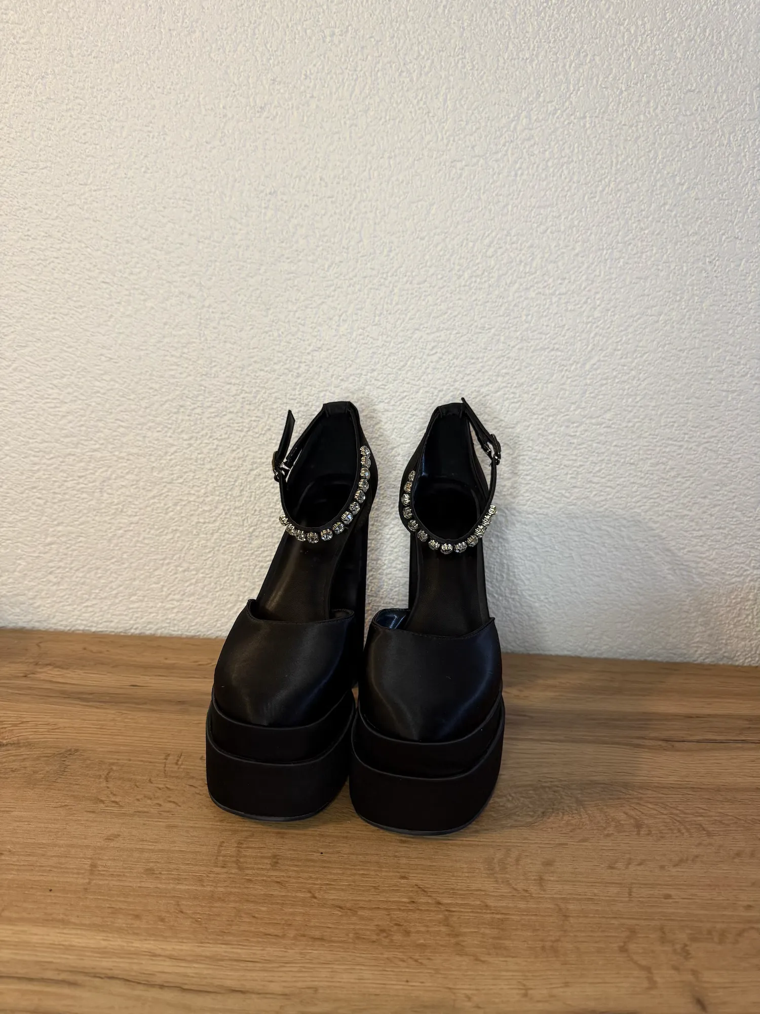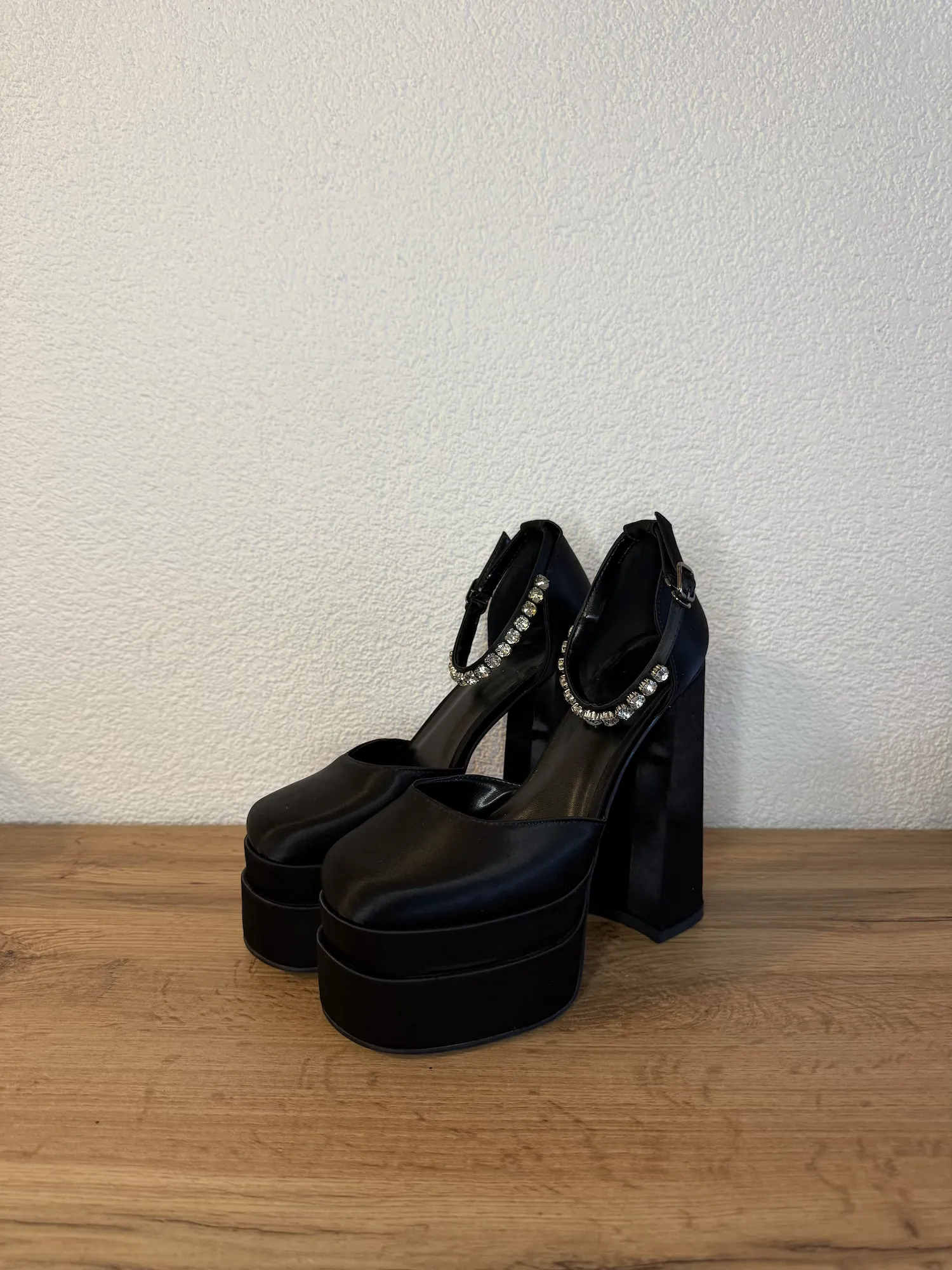 Details: Platform sole, high block heel, rhinestone ankle strap, closed toe