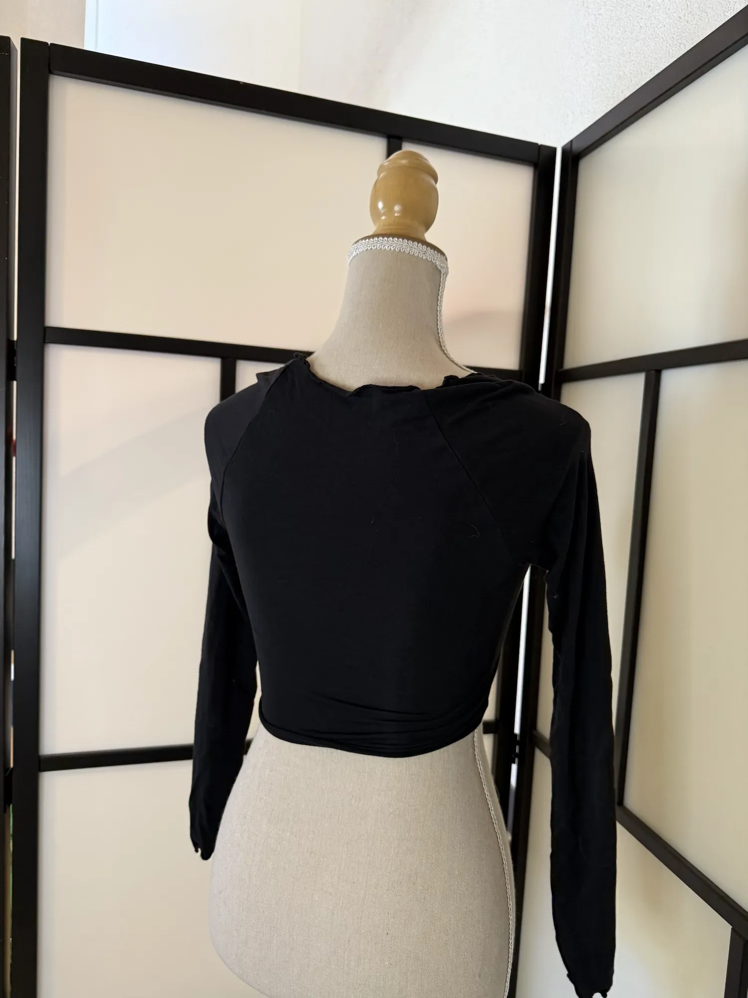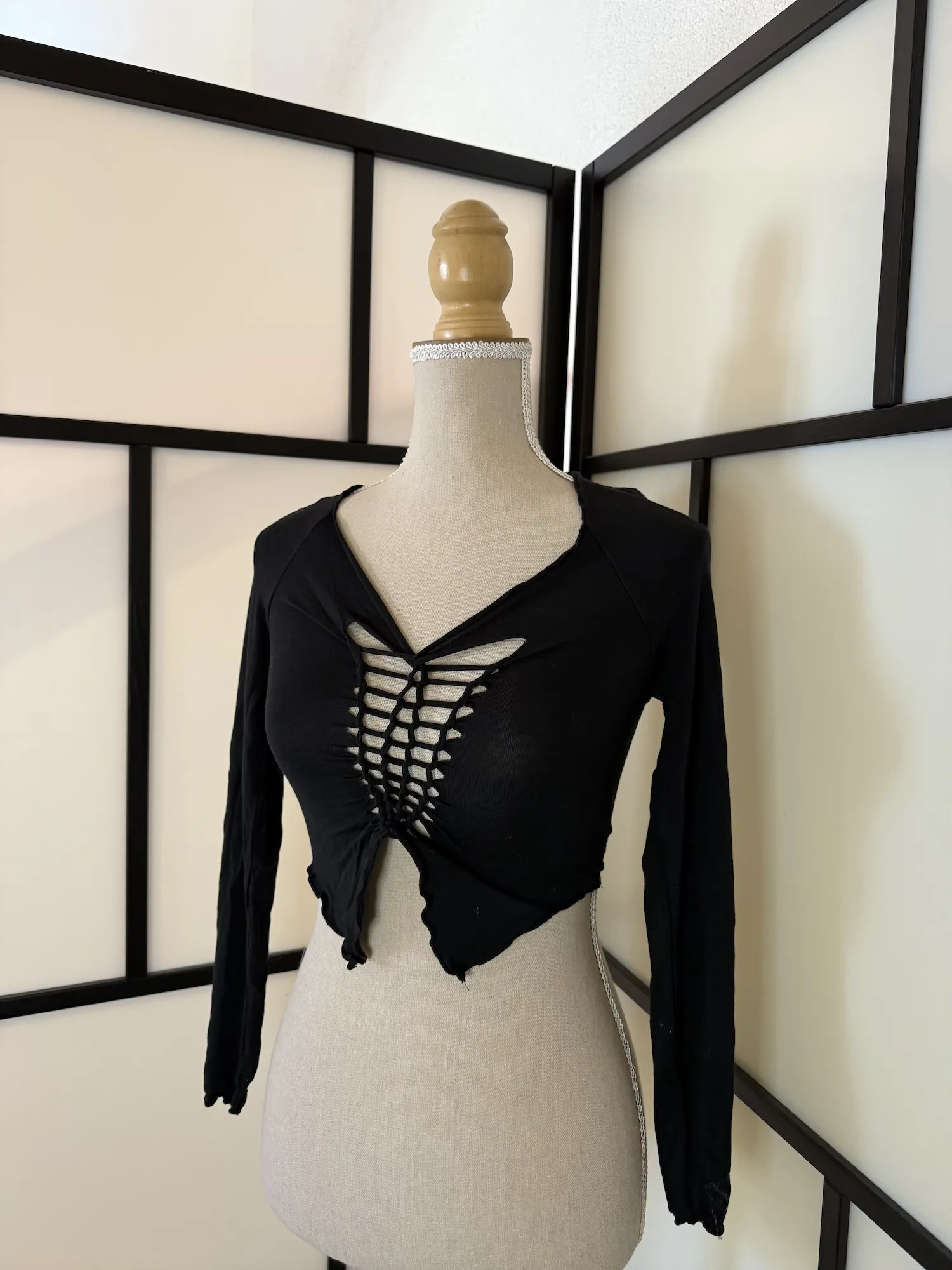 A bold black long-sleeve crop top from Romwe featuring striking lace-up detailing across the front. The cut-out design creates a statement look while the asymmetrical pointed hem adds an edgy finish.