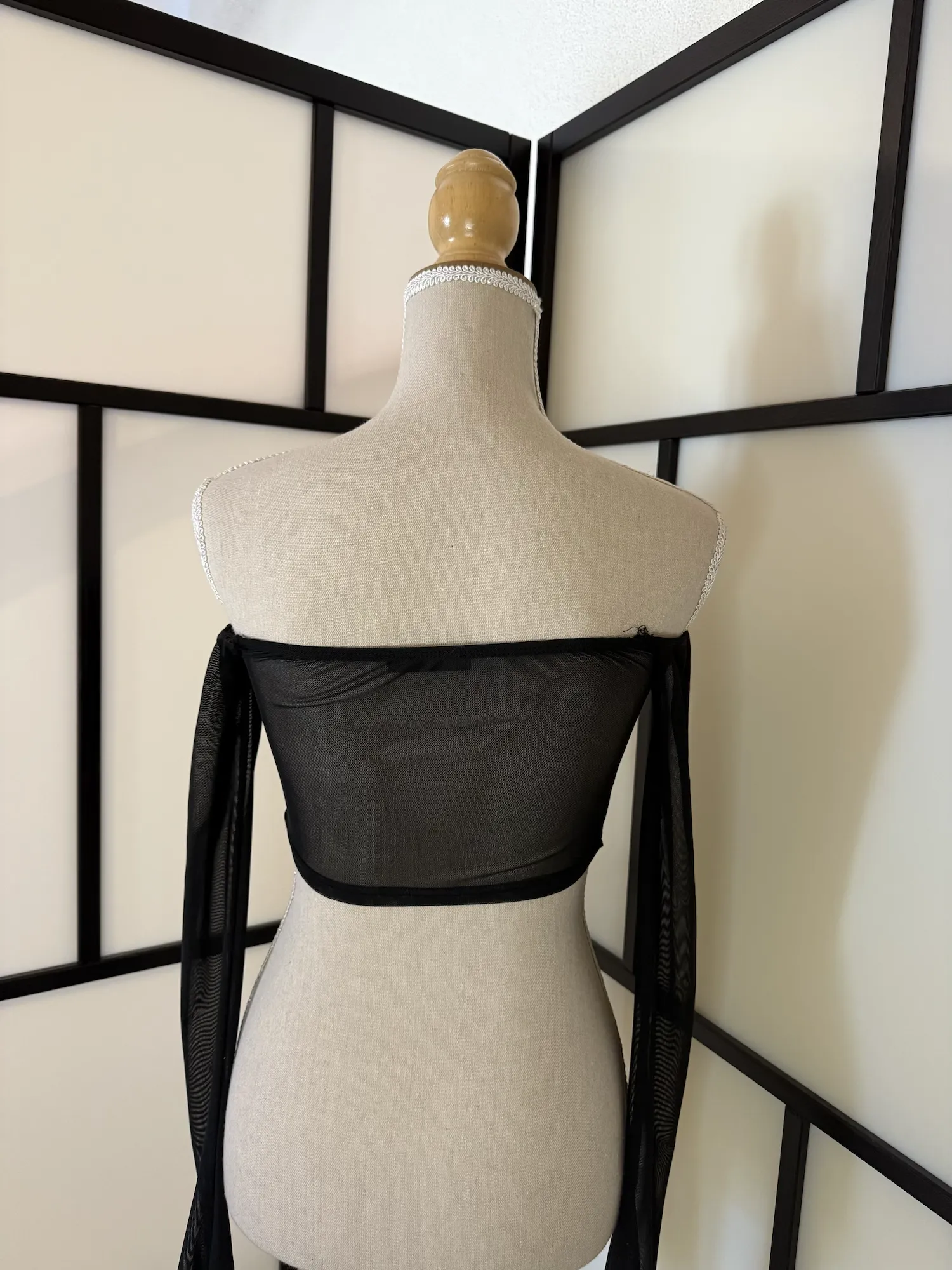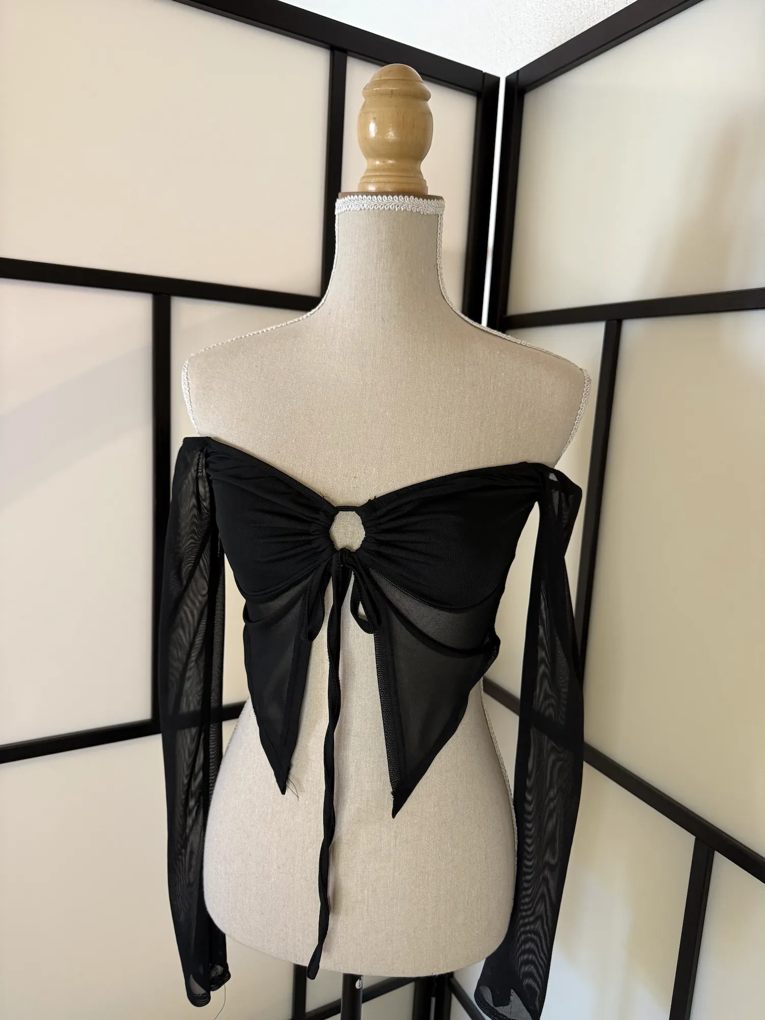 A delicate black off-shoulder mesh top featuring a ruched front with ring detail and adjustable tie closure. The asymmetrical pointed hem and sheer long sleeves create a soft, romantic yet slightly edgy silhouette.