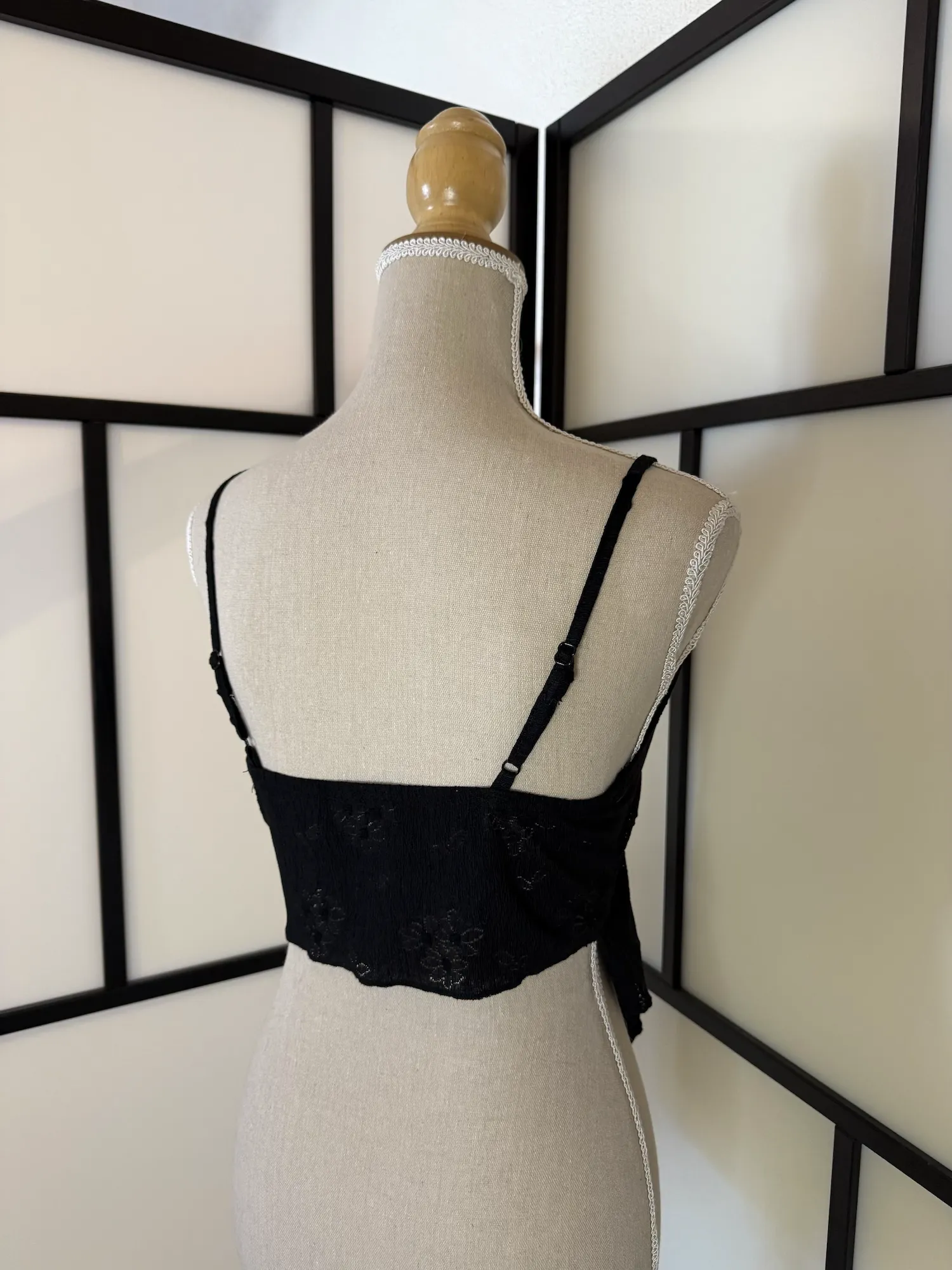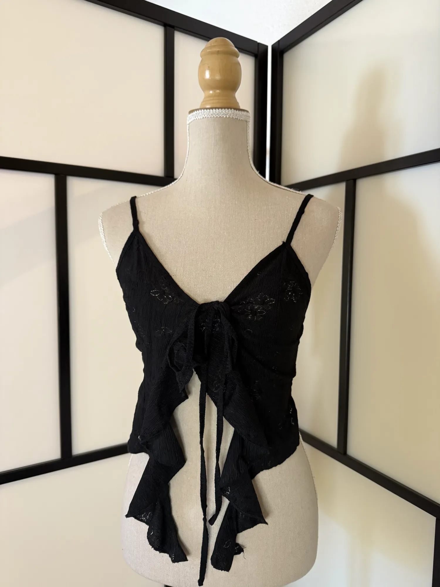 A delicate black cami-style top featuring a soft, sheer fabric with subtle textured details. The adjustable tie-front design creates a flattering silhouette, while the asymmetrical ruffle hem adds movement and a romantic, slightly edgy touch.