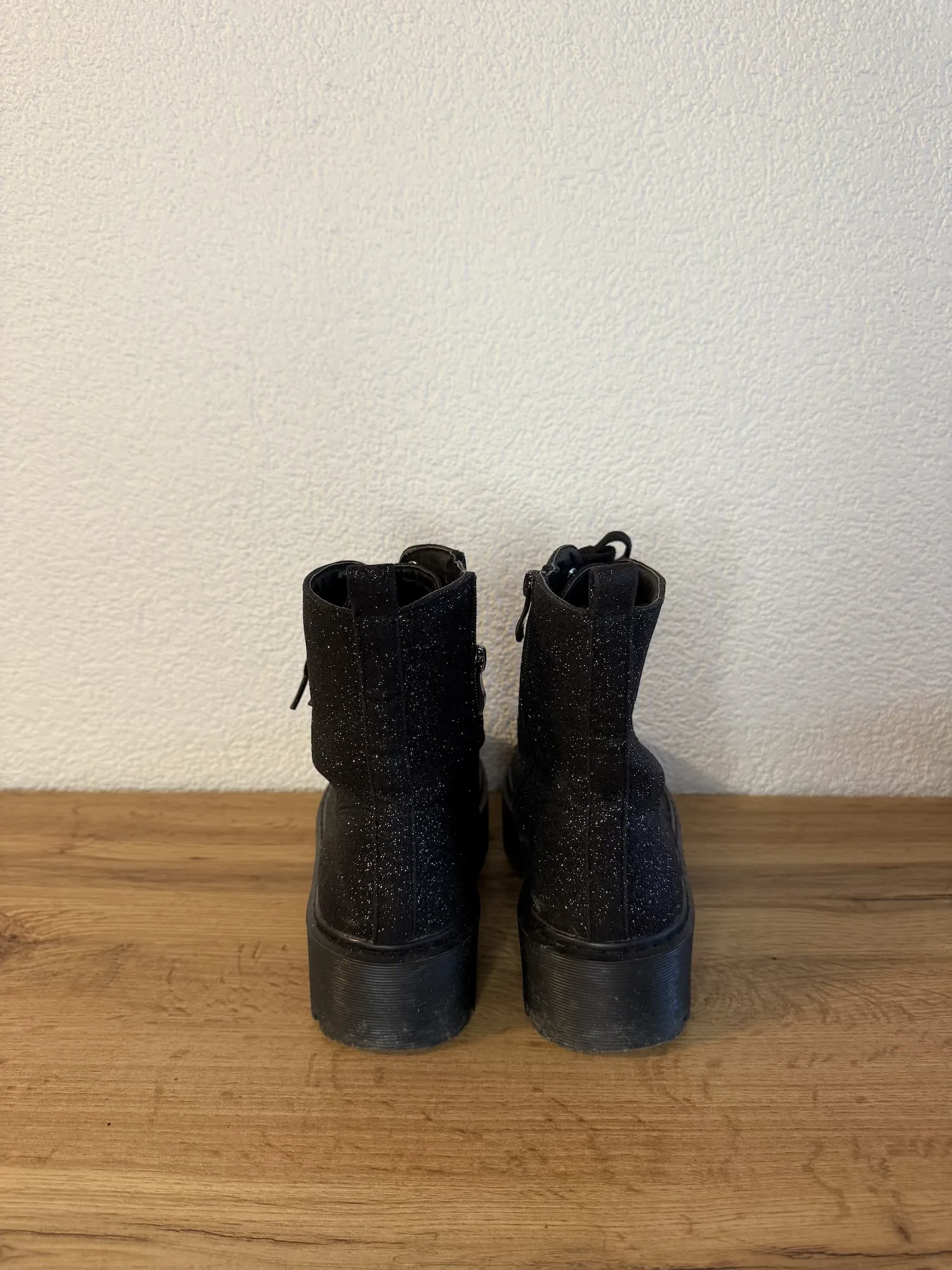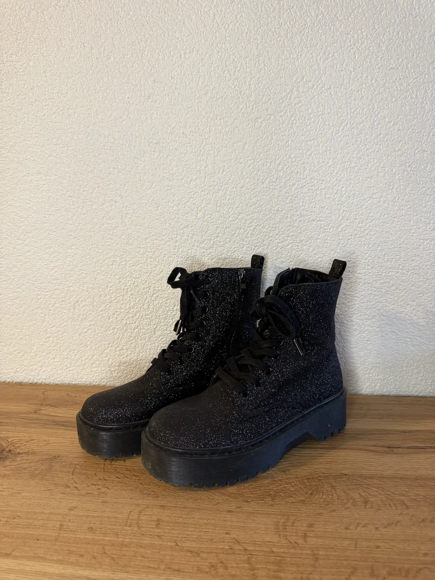 These lace-up ankle boots feature a subtle all-over glitter finish that adds a touch of sparkle while keeping the look edgy and wearable. Designed with a chunky platform sole and deep tread, they give extra height and a bold silhouette while staying comfortable for everyday wear.