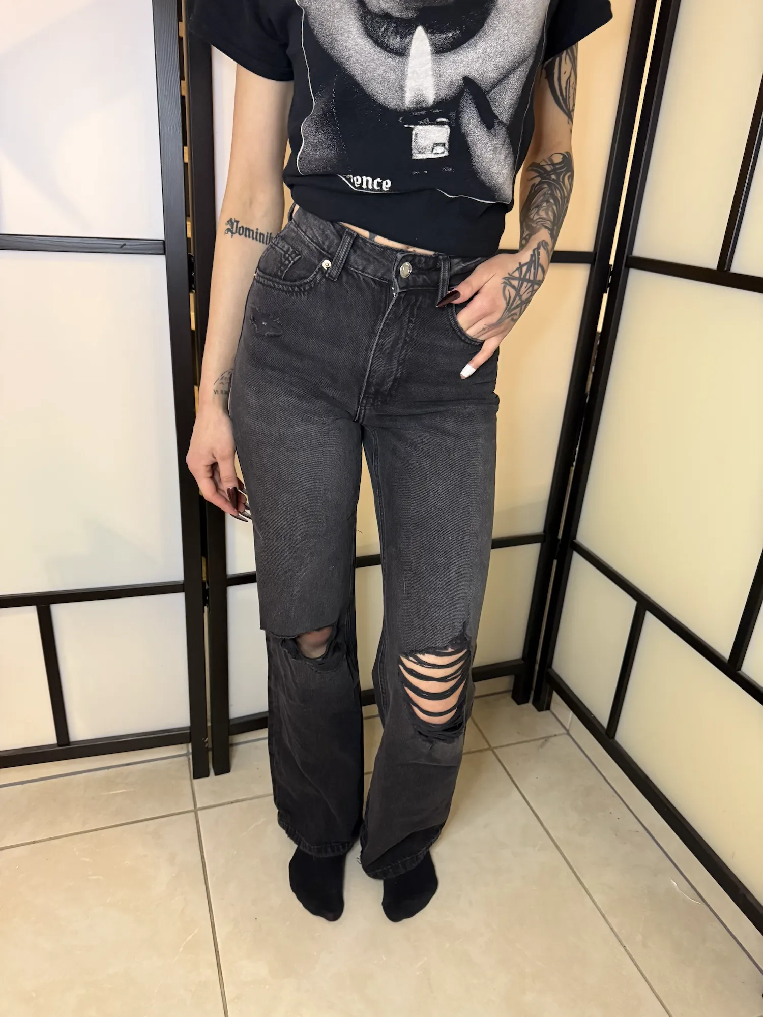 Details: High waist, button & zip closure, five pockets, ripped knee details, wide leg