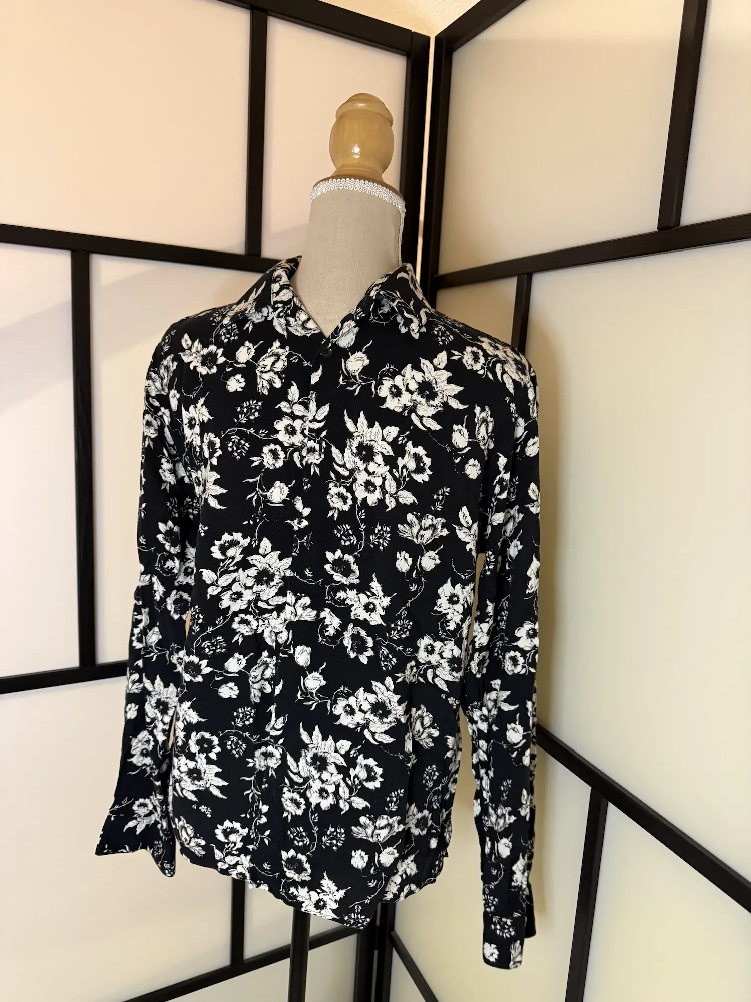 Slim, tailored fit with an all-over white floral print for a bold yet elegant contrast. Features a classic collar, full button closure, and long sleeves with buttoned cuffs. Lightweight fabric with a smooth feel, perfect for layering or wearing solo.