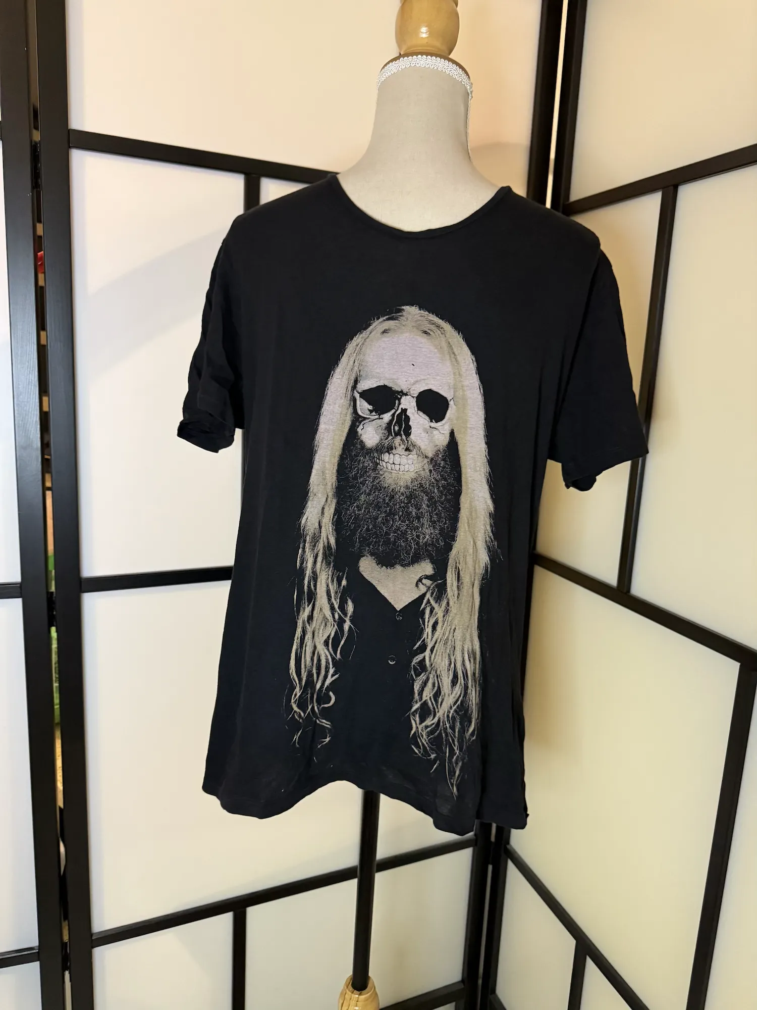 Black The Kooples T-shirt in size Medium, used condition, featuring a striking front print of a skull-faced figure with long hair and beard. Dark, edgy artwork with strong rock and gothic vibes – a true statement piece.