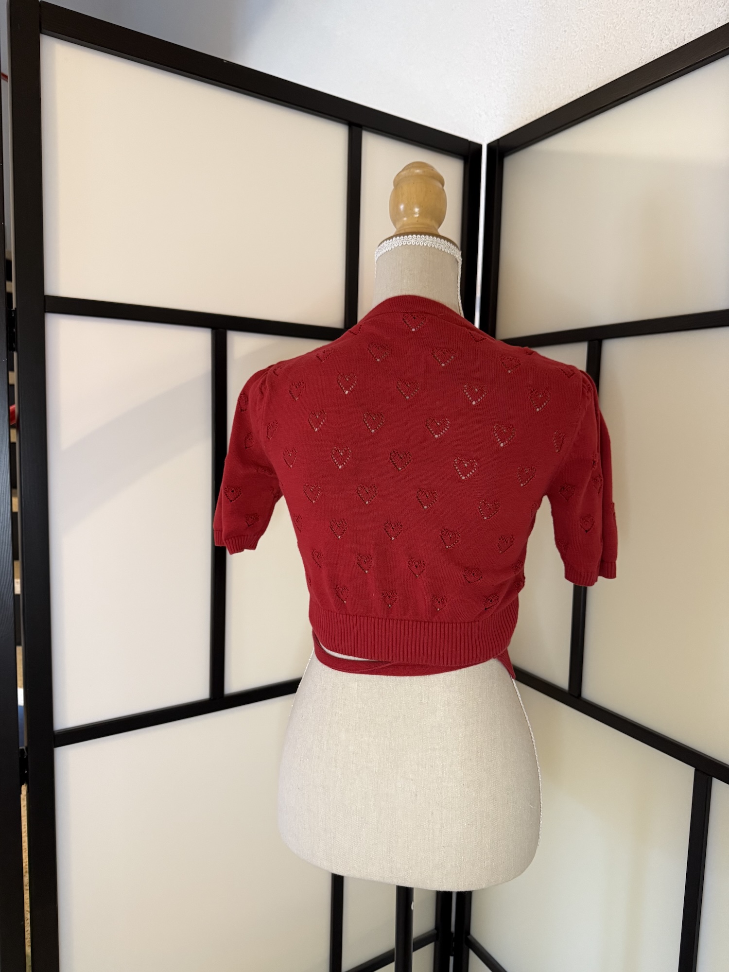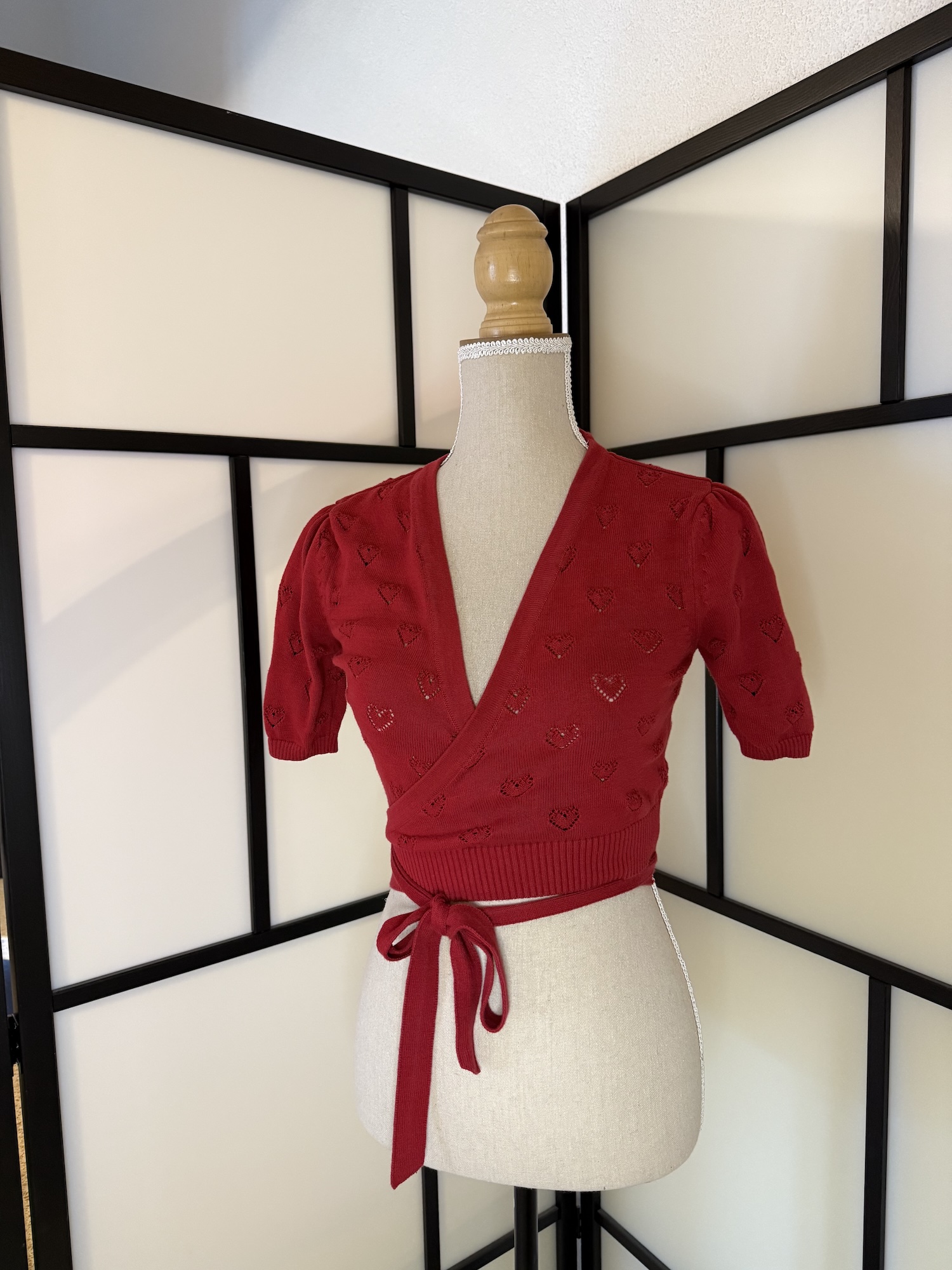 A charming red wrap-style top by TopVintage, designed with delicate heart-pattern detailing that adds a playful yet feminine touch.