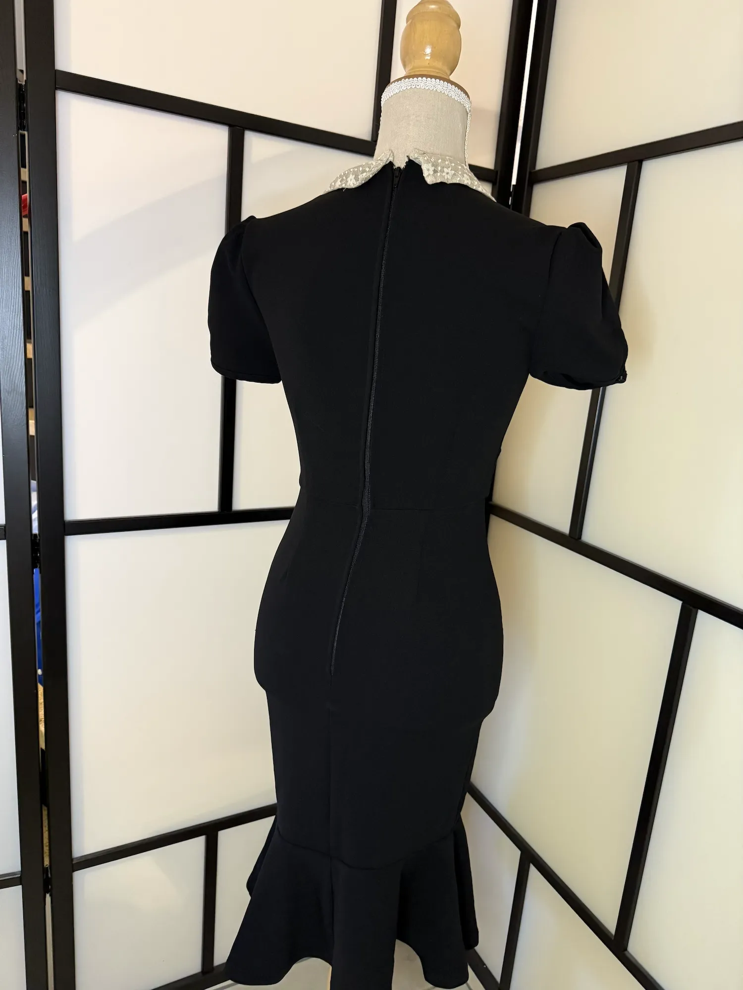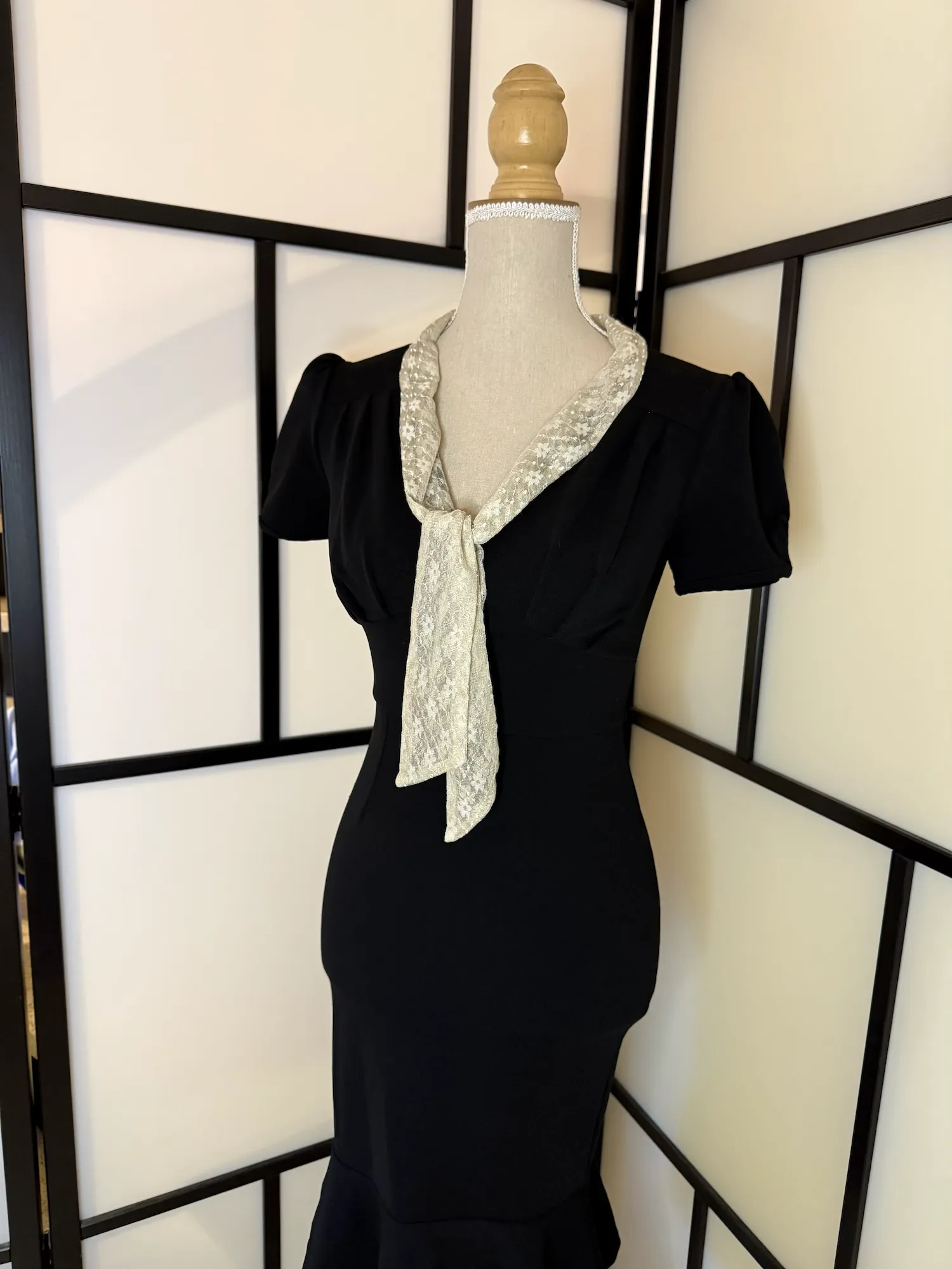 The highlight is the elegant cream lace tie-neck detail, adding a soft, romantic contrast to the structured black dress. The fitted cut with slight flare at the hem creates a timeless 40s/50s-inspired look.