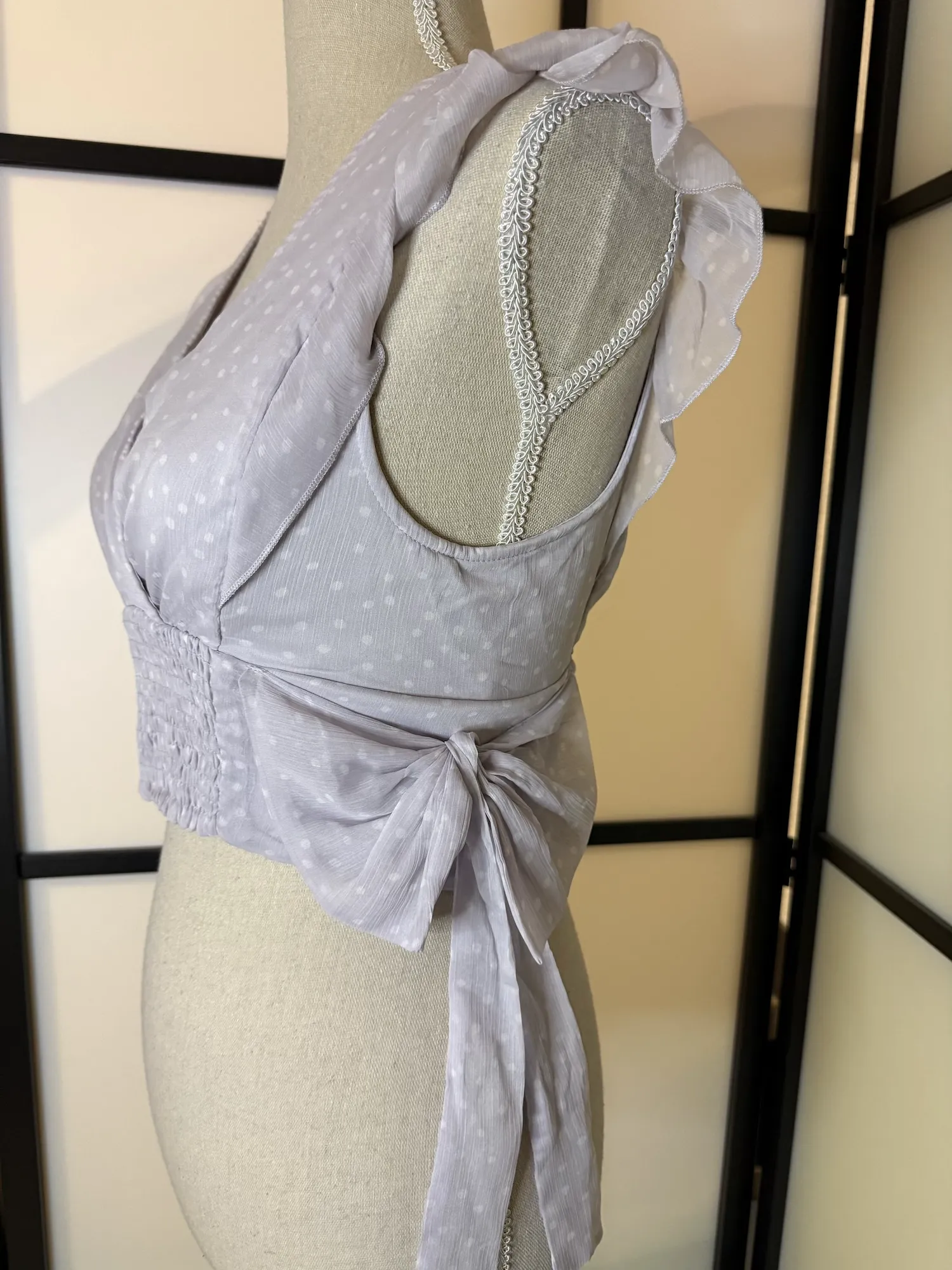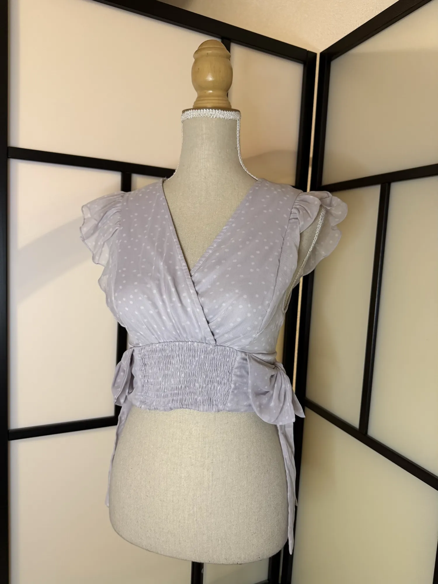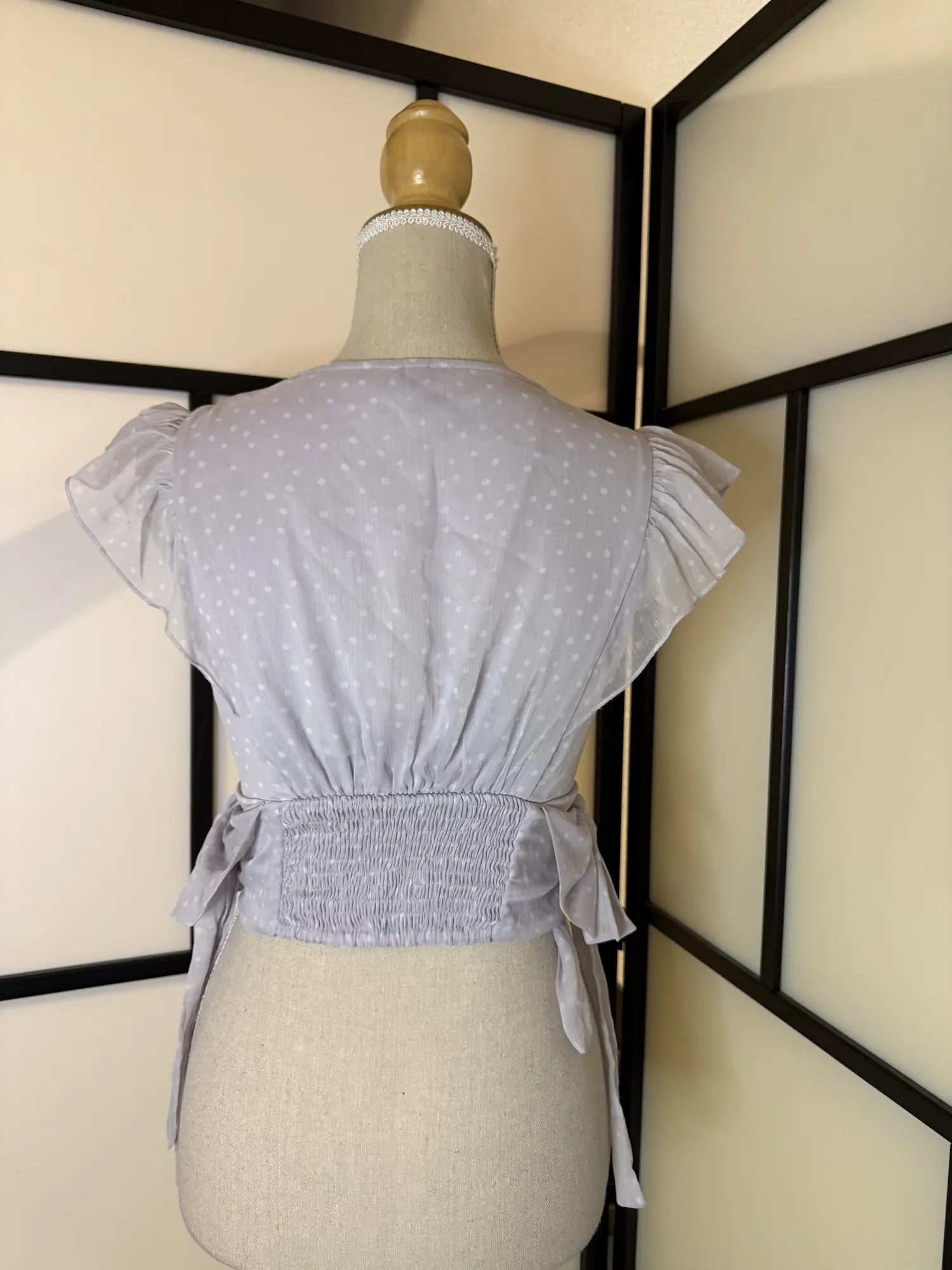 Designed with a flattering V-neckline, delicate flutter sleeves, and a smocked waist that enhances the silhouette. The soft polka dot pattern and side tie details add a feminine, playful touch.